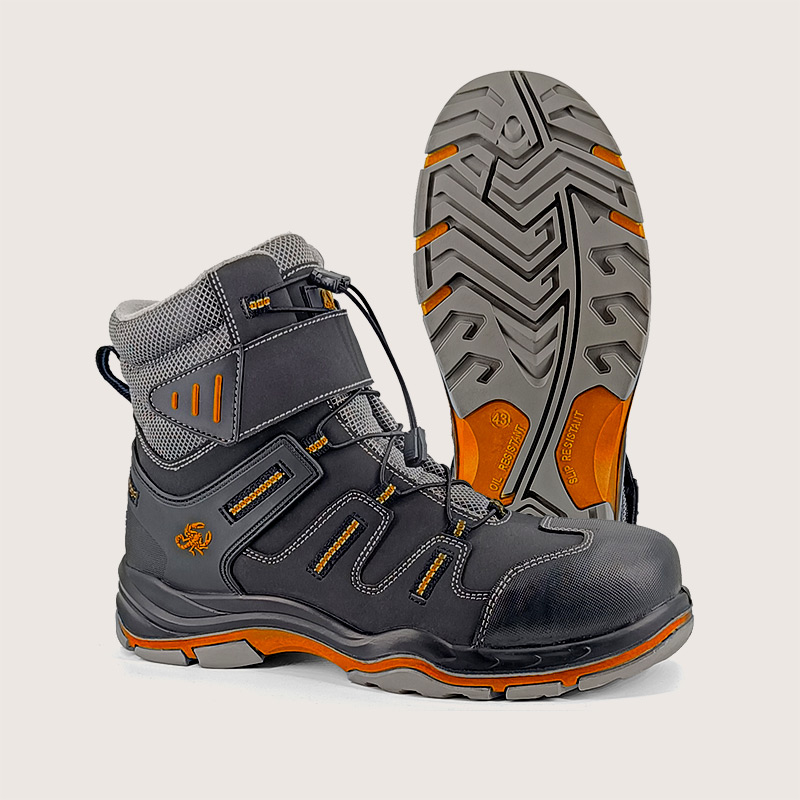 - Подошва ПУ-Нитрил — маслобензостойкая (МБС), устойчивая к воздействию агрессивной среды – масел, нефтепродуктов, изготовлена из износостойкой, термостойкой (+300°С при кратковременном (60 с) контакте с нагретыми поверхностями) резины на основе нитрильного каучука. Применяемый для литья подошвы нитрил обладает высокой эластичностью и гибкостью.