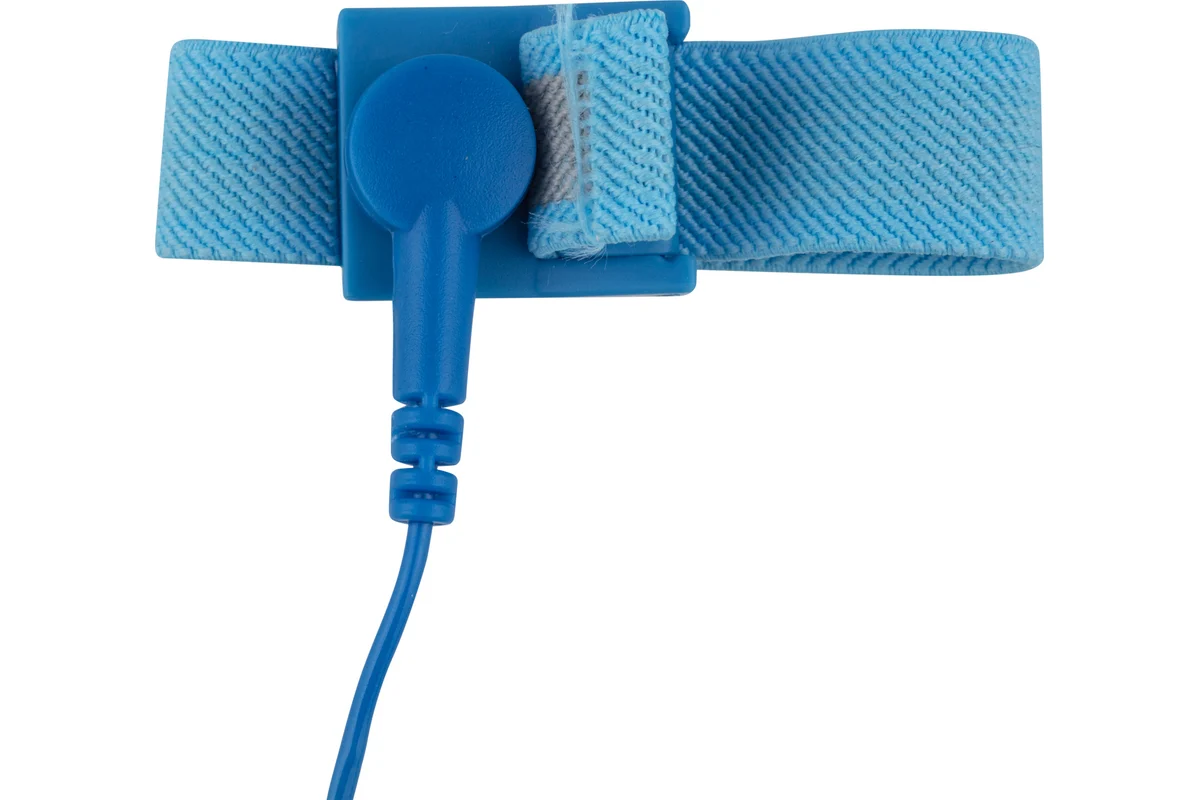 - Состоит из самого браслета и витого провода с зажимом для крепления к токопроводящей поверхности. Антистатический браслет. Цвет – голубой