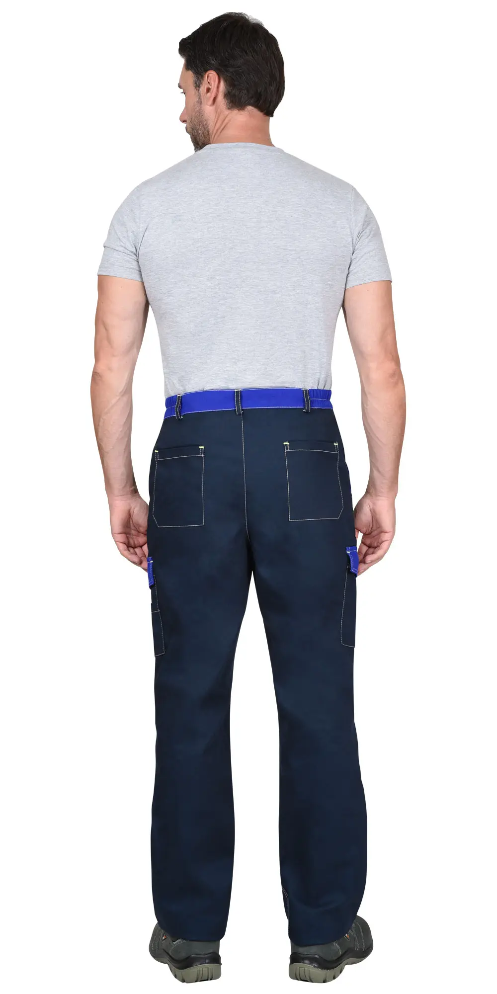 - Изделие с двумя накладными карманами на задних половинках, с объемными наколенниками и притачным поясом, застегивающимся на пуговицу, частично стянутым резинкой.