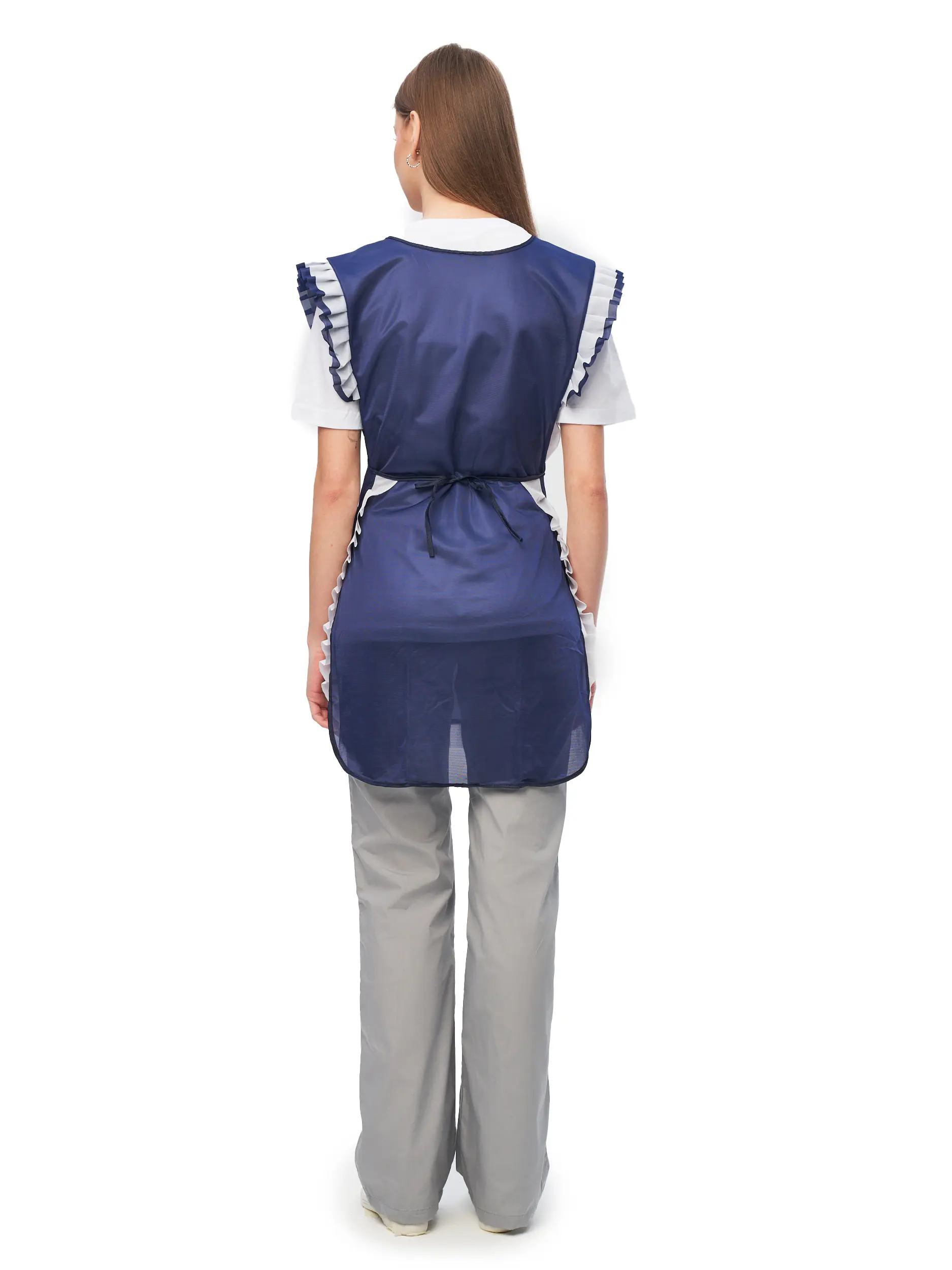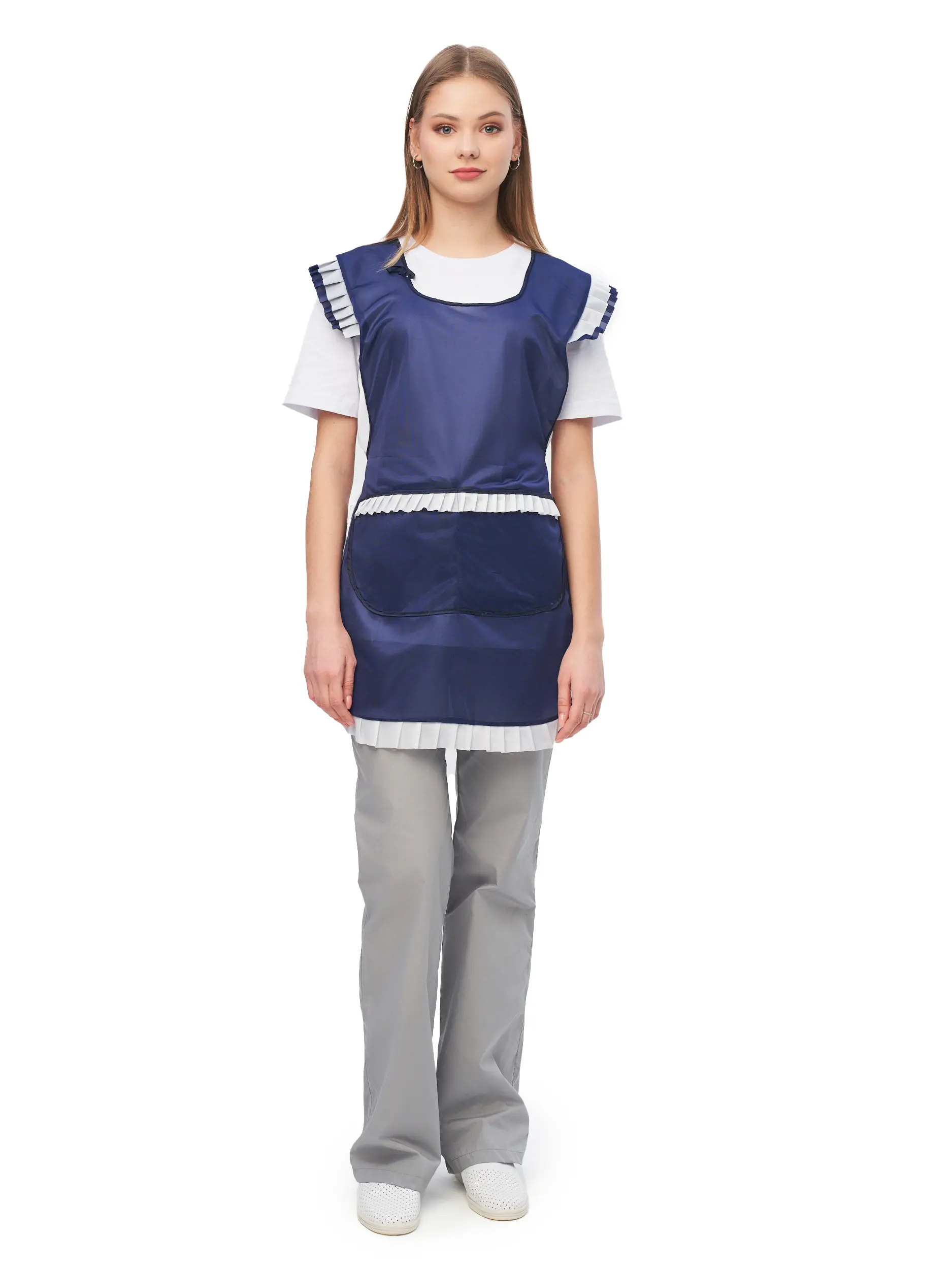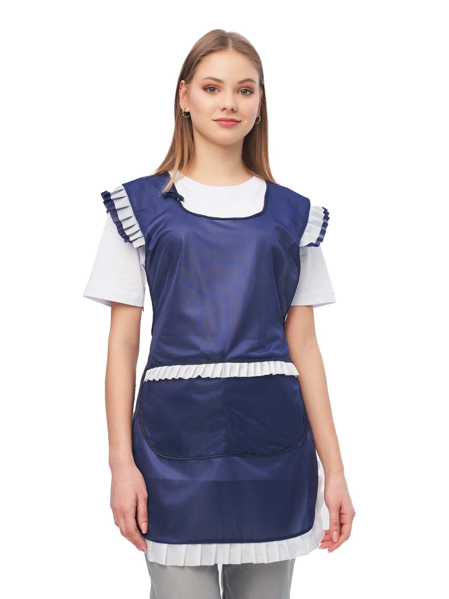 Фартук-сарафан с завязками по линии талии, с одним большим накладным карманом, разделенный строчкой на отделения. Рекомендуется для работников торговли, сферы обслуживания, технического персонала гостиниц.