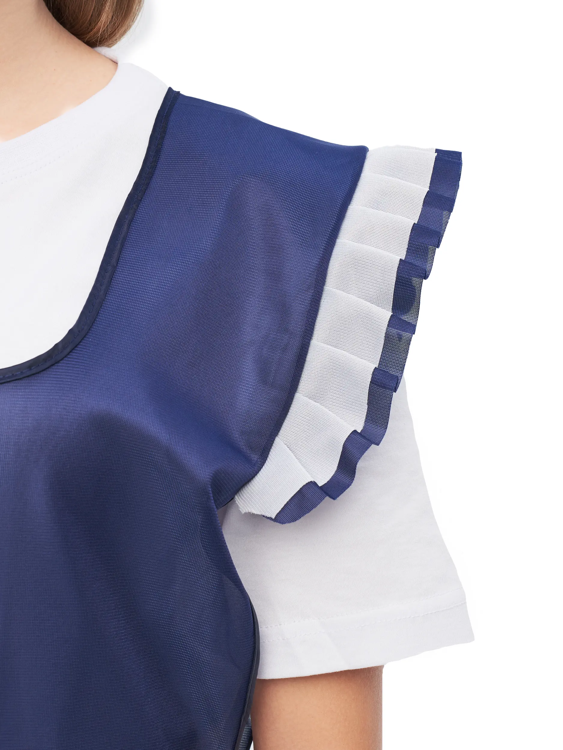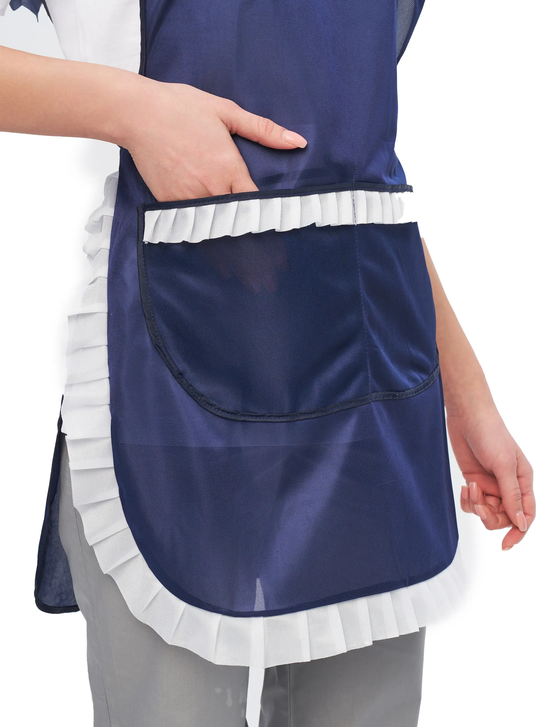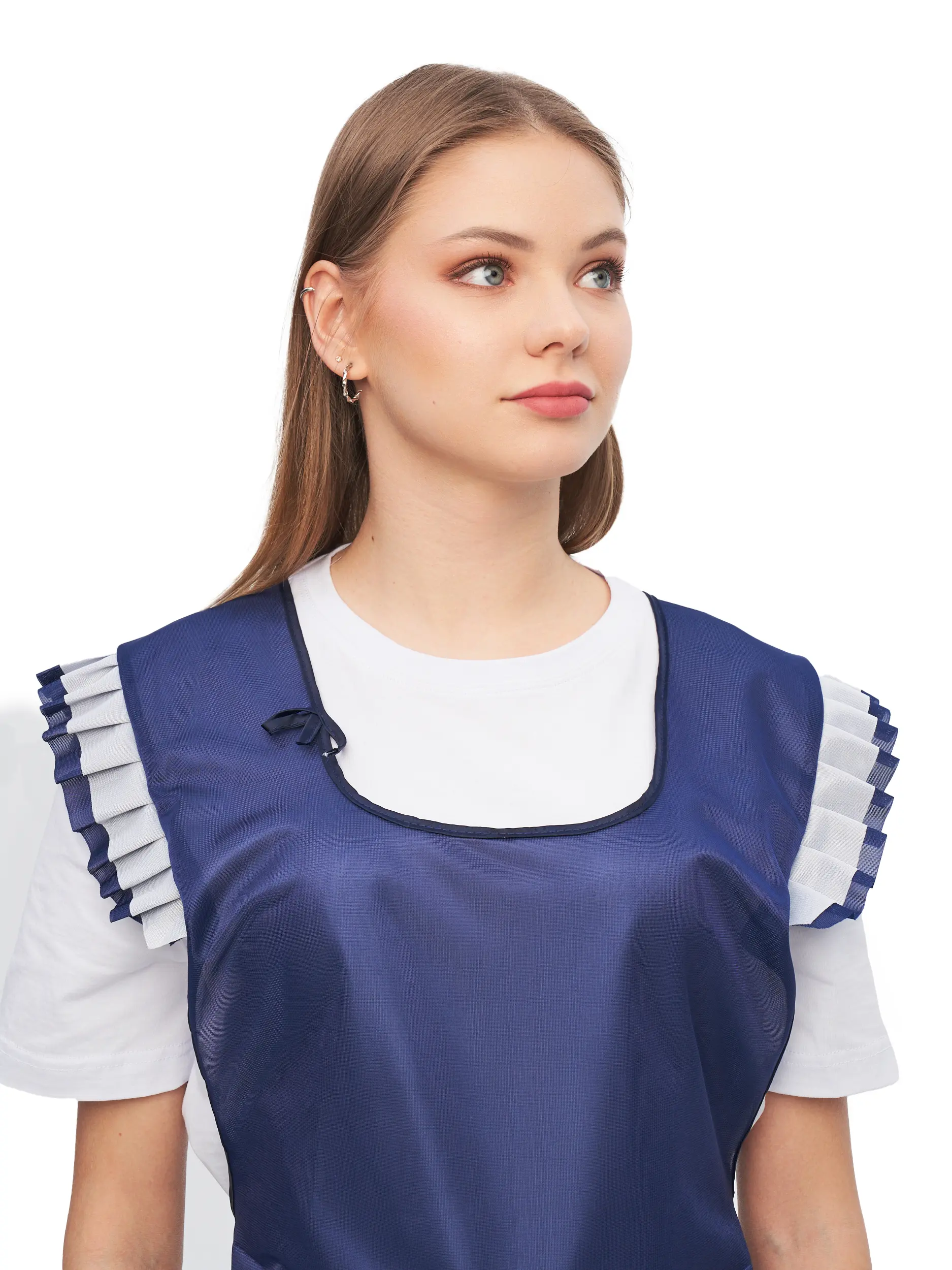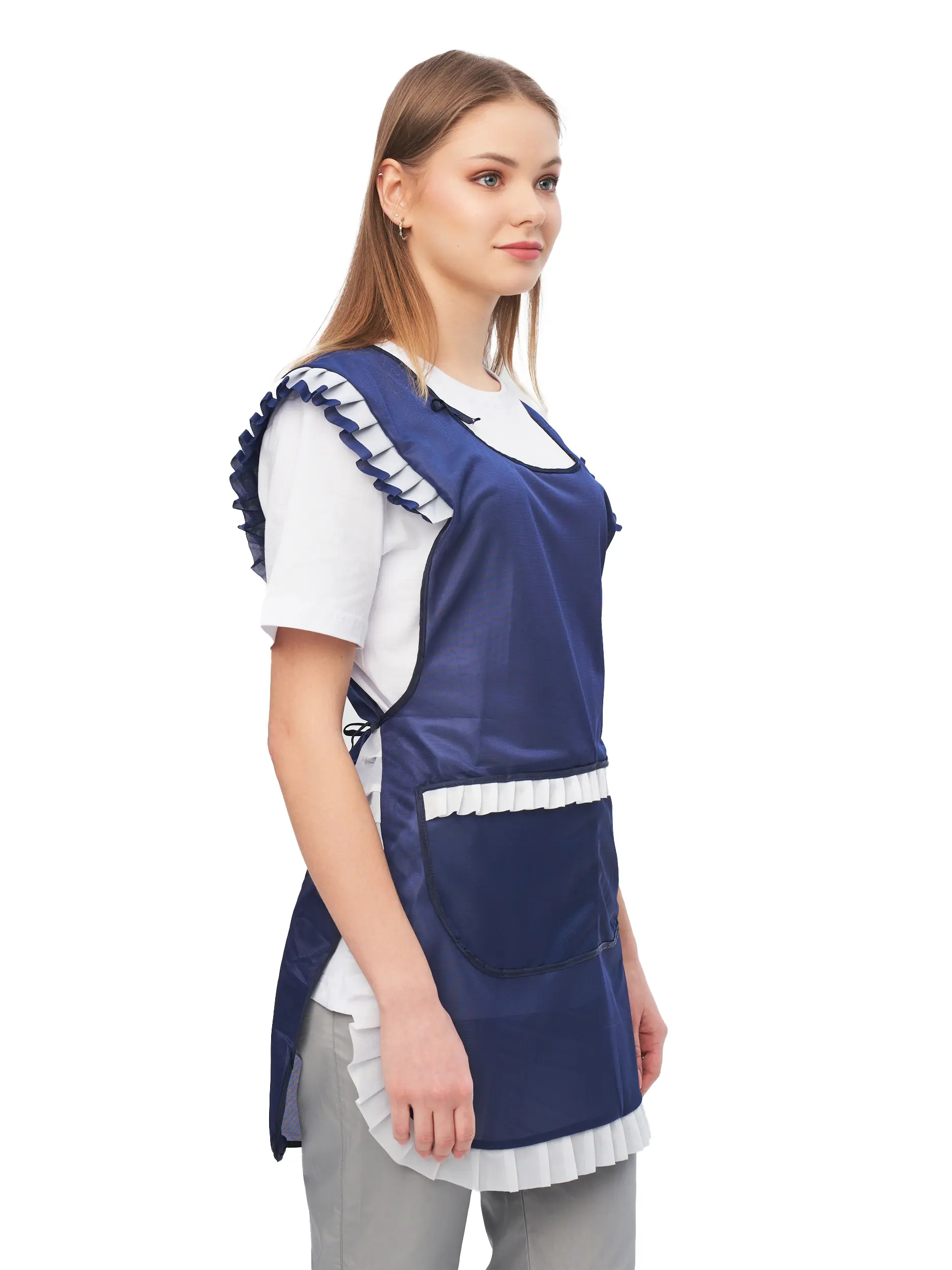 Фартук-сарафан с завязками по линии талии, с одним большим накладным карманом, разделенный строчкой на отделения. Рекомендуется для работников торговли, сферы обслуживания, технического персонала гостиниц.