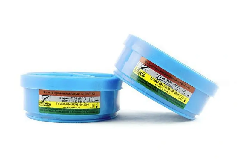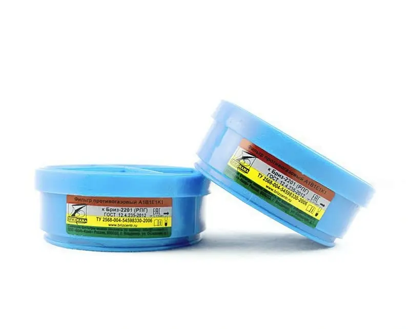 Противогазовый фильтр А1В1Е1К1 предназначен для использования с респиратором Бриз-2201 и защищает от органических веществ с температурой кипения выше 65 градусов C, неорганических и кислых газов и паров, аммиака и его производных.