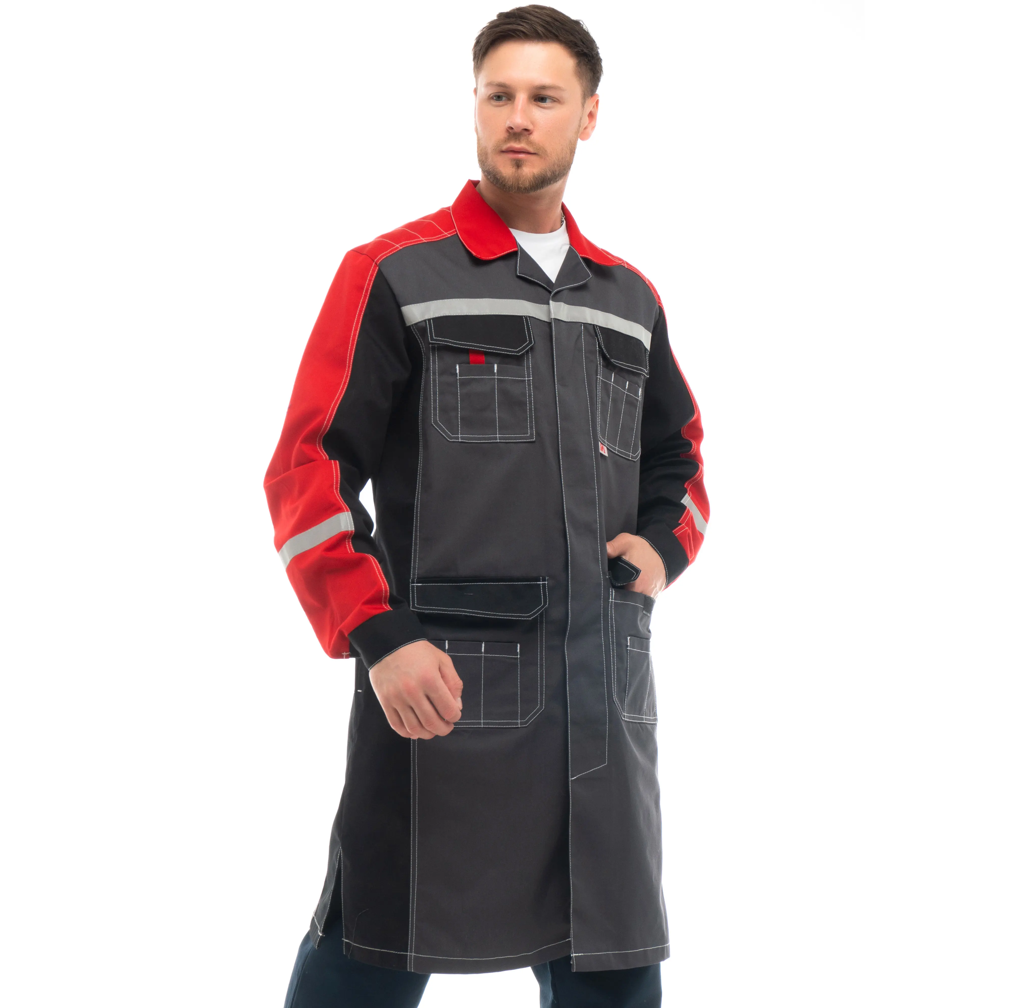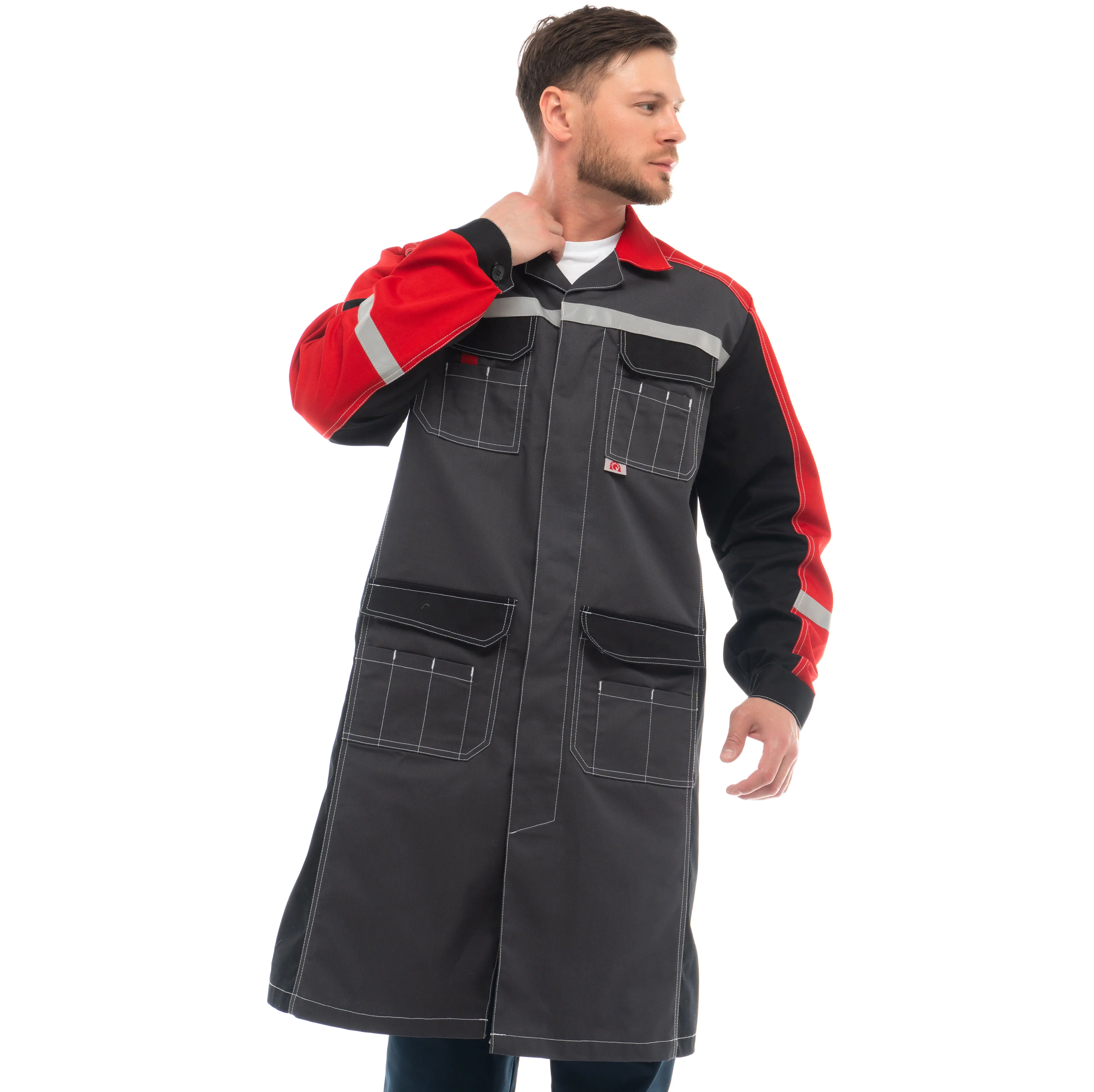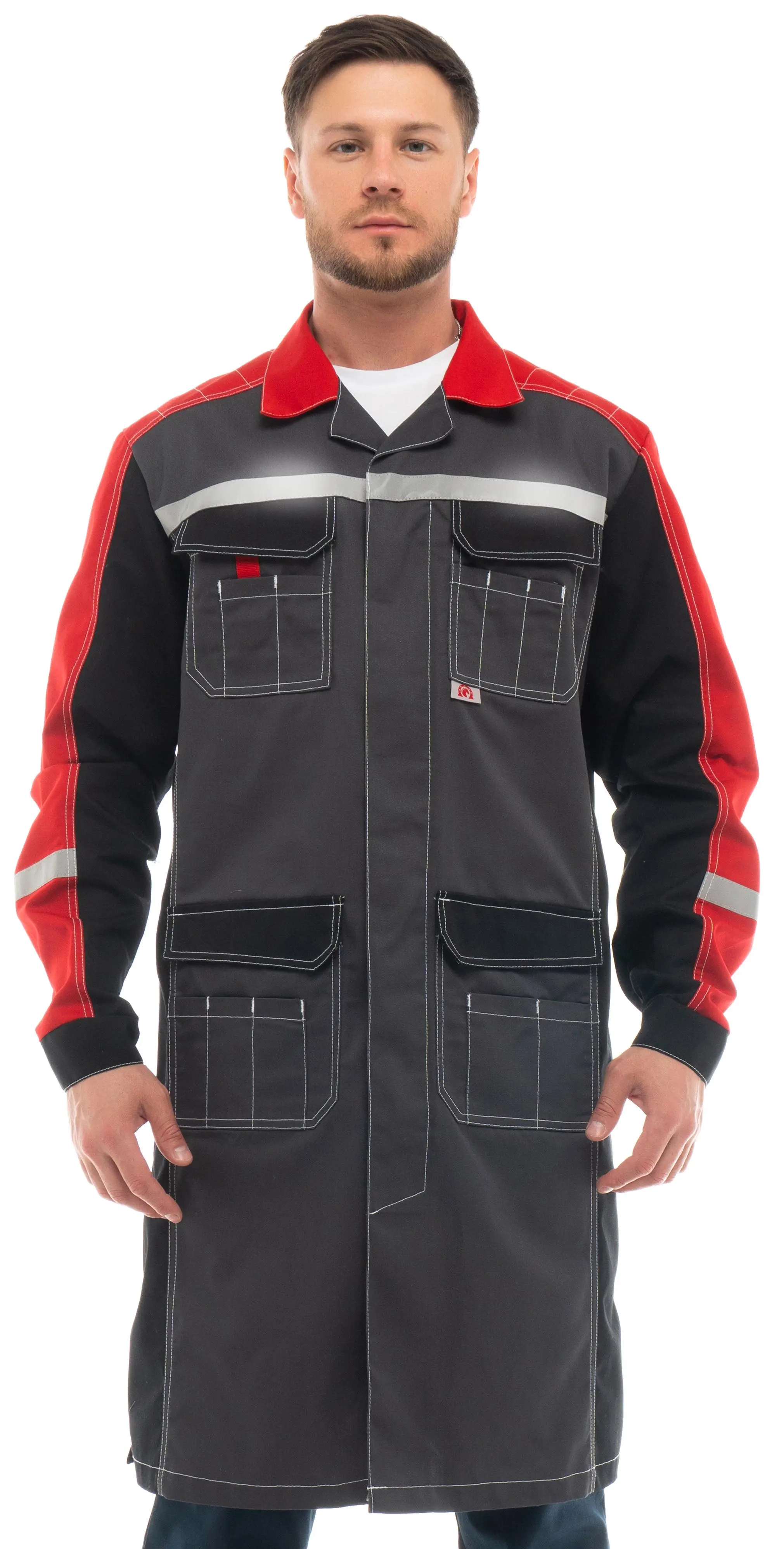 - Для безопасной работы сотрудника в местах с плохим освещением на халате «ФОРМУЛА» предусмотрена световозвращающая лента шириной 25 мм.