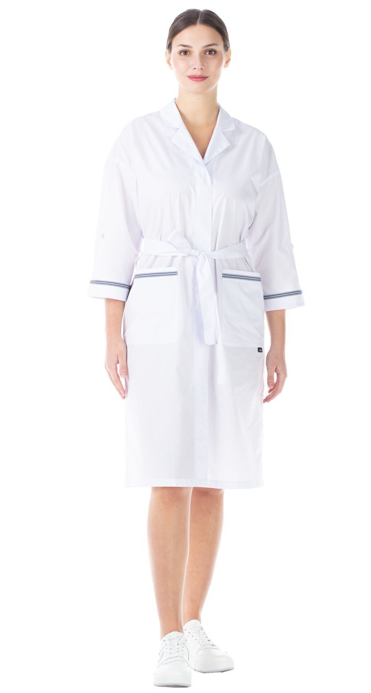 - Рубашечный рукав со спущенным плечом и углубленной проймой подойдет для фигуры любого типа. Этот халат можно комфортно накинуть на медицинский хирургический костюм, можно носить без пояса.