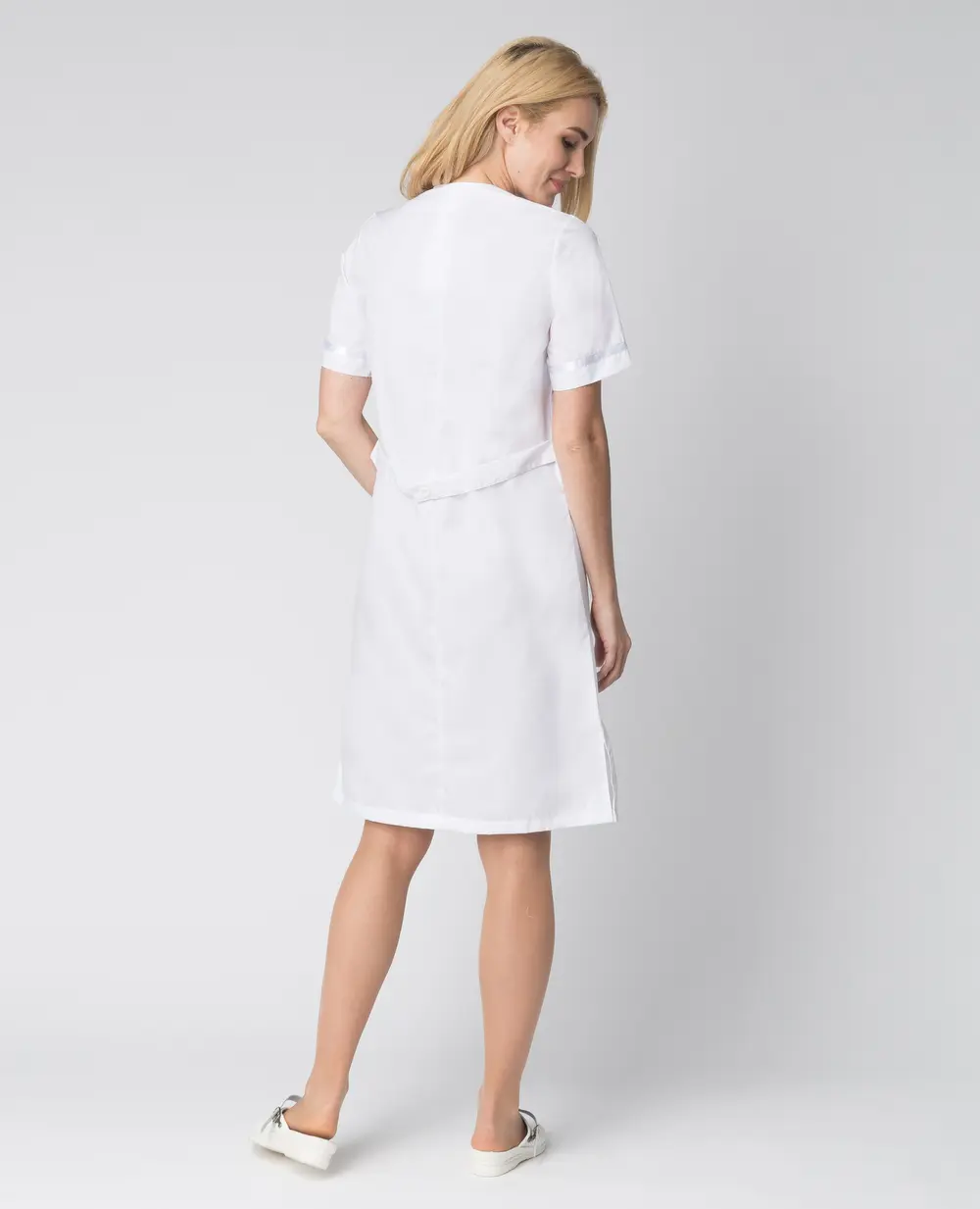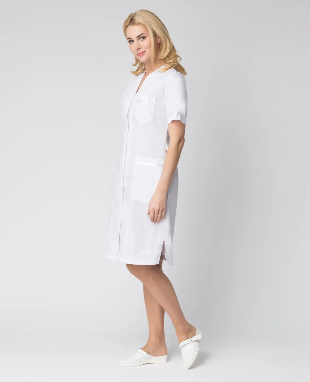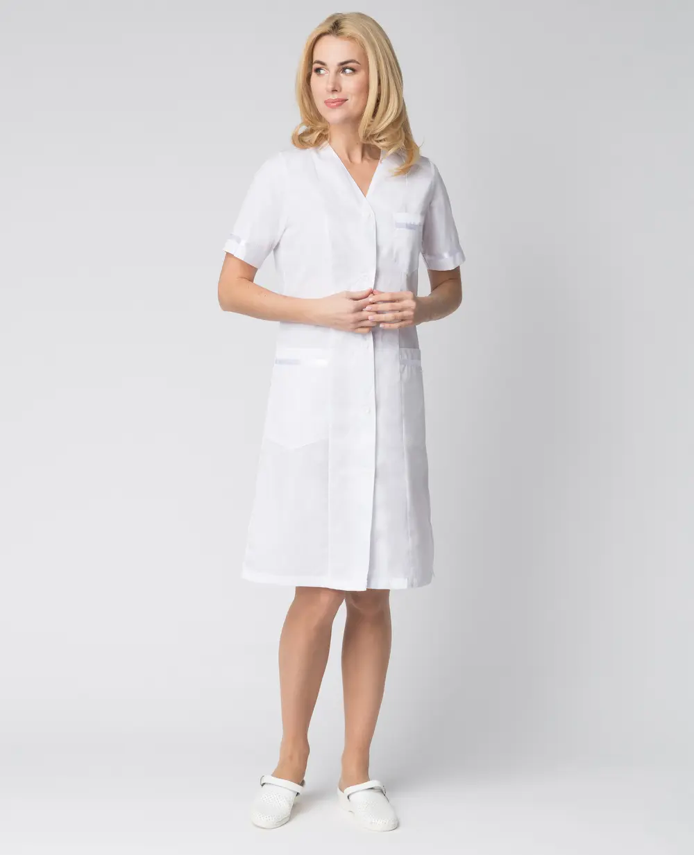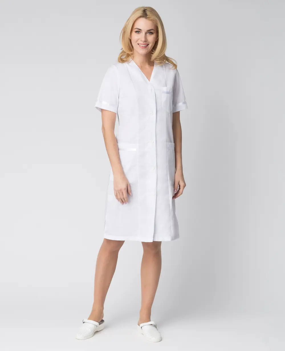 - Женский рабочий халат с коротким рукавом и длиной до колена отлично сидит по фигуре, не стесняет движения, выглядит модно и привлекательно.
