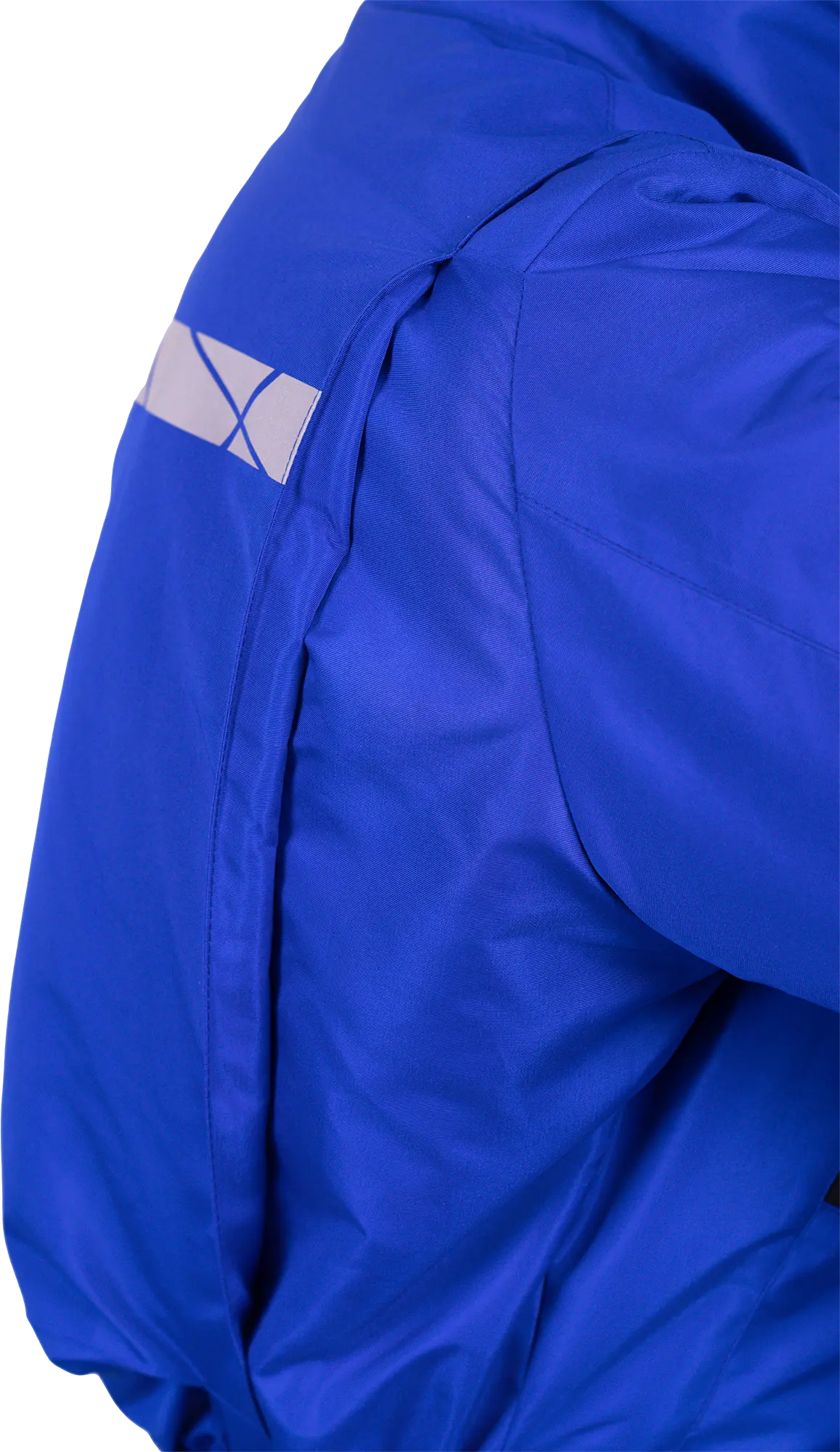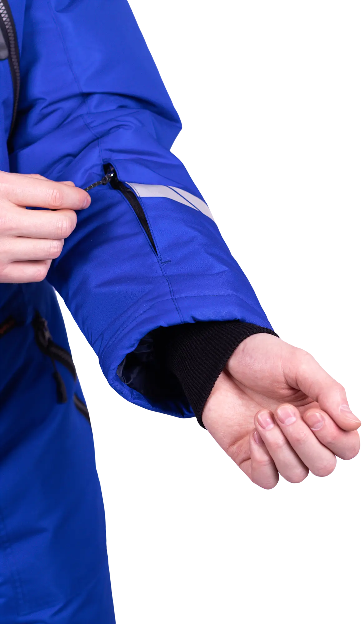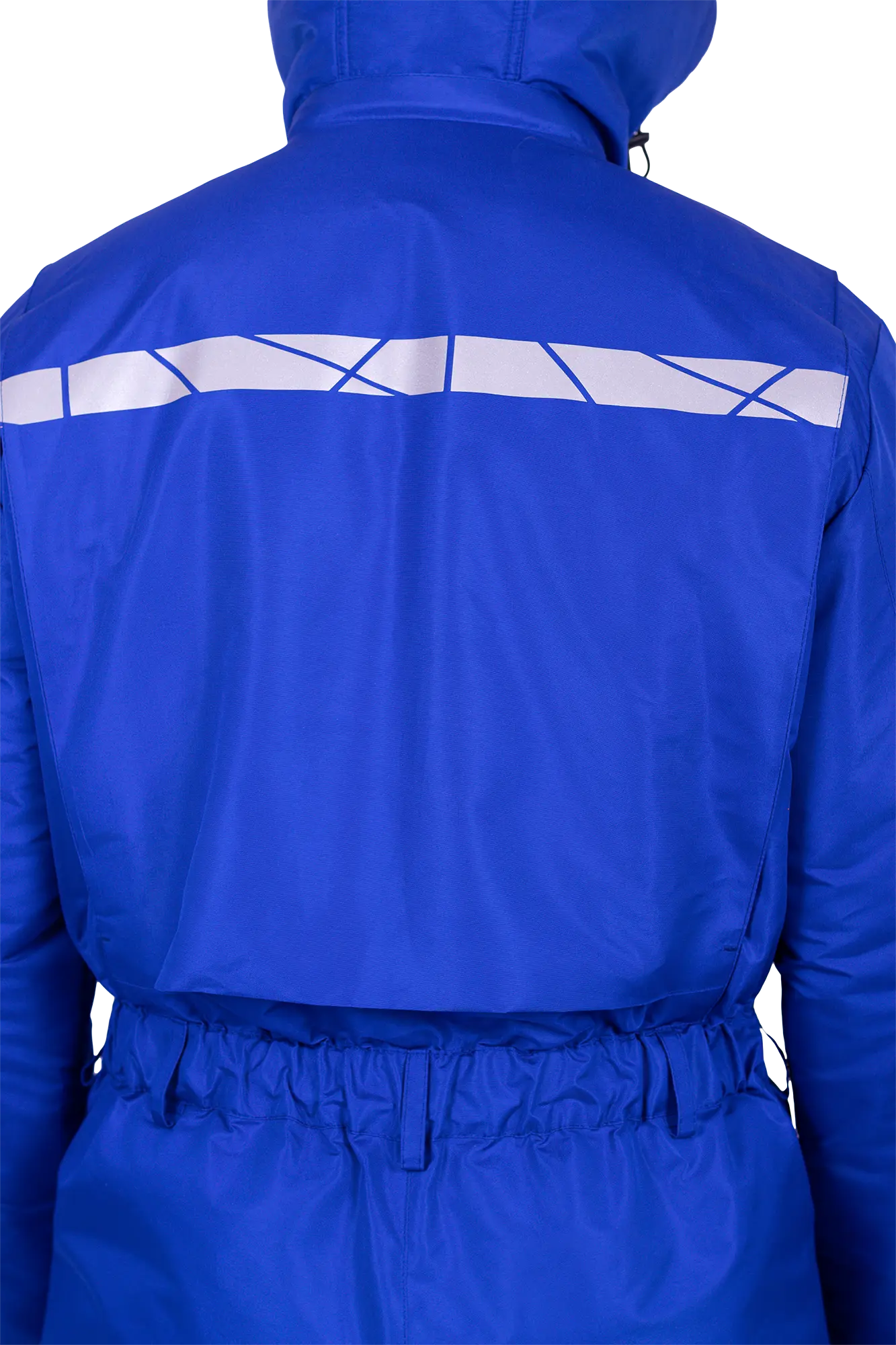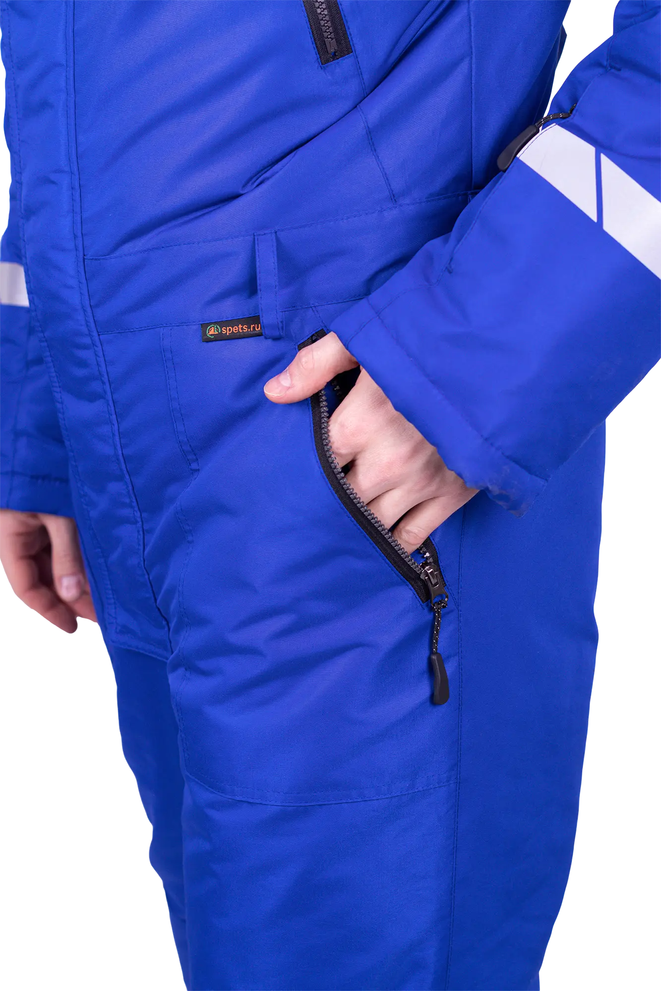 - термоклеевые световозвращающие полосы шириной 30 мм на кокетках полочки и спинки, внизу рукавов, брюк, на центральной части капюшона.