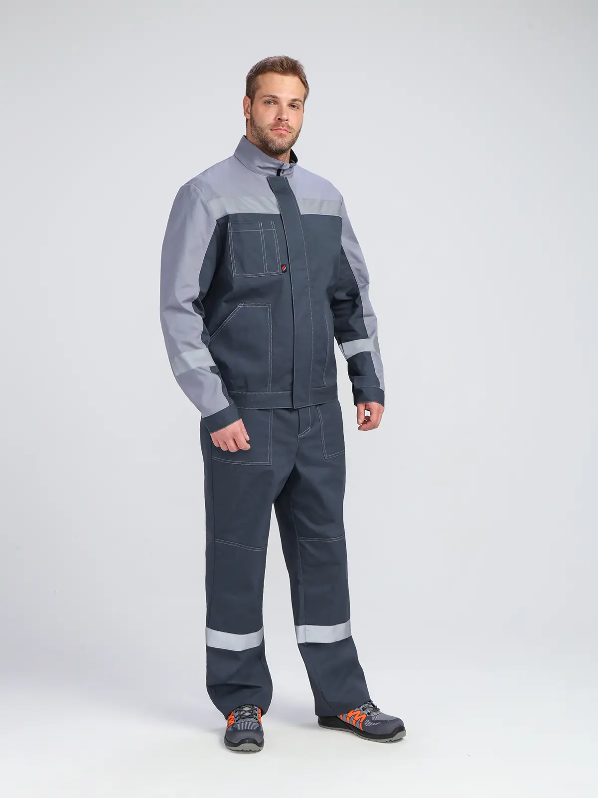 - Широкая светоотражающая полоса по низу кокеток и на рукавах для безопасности