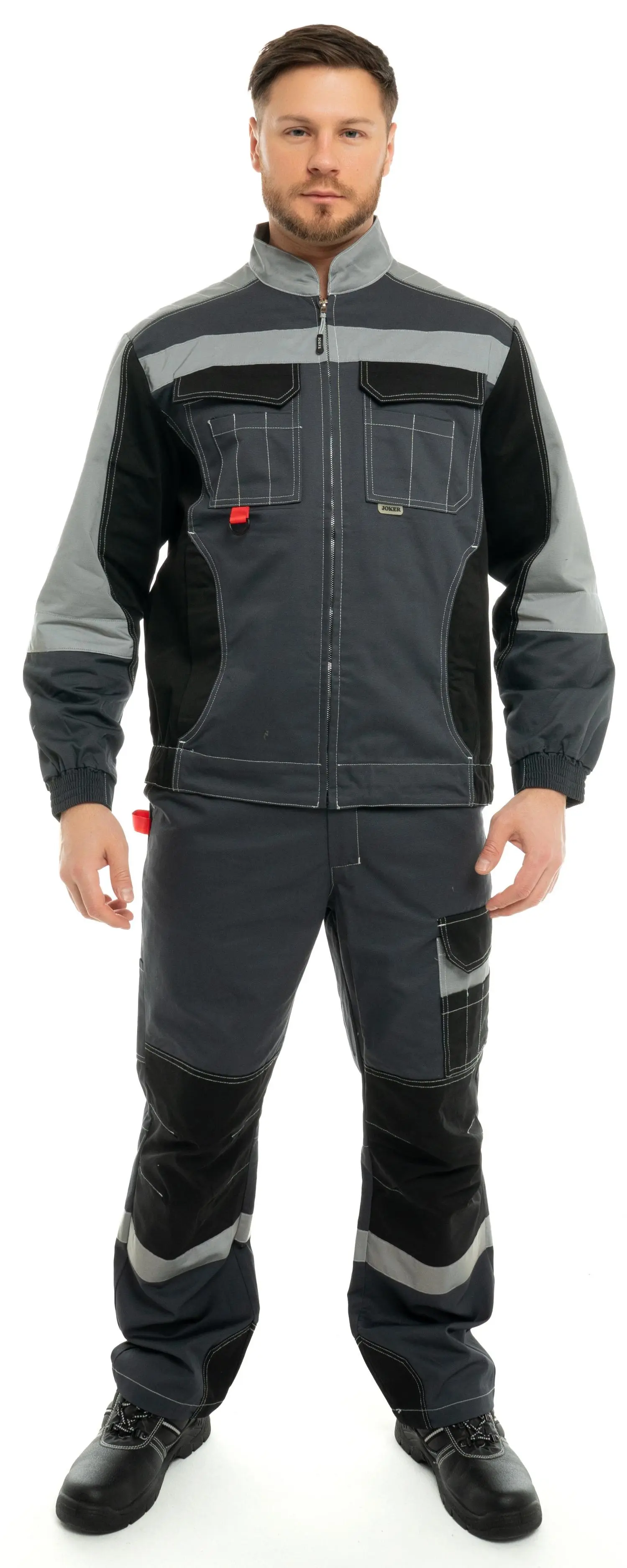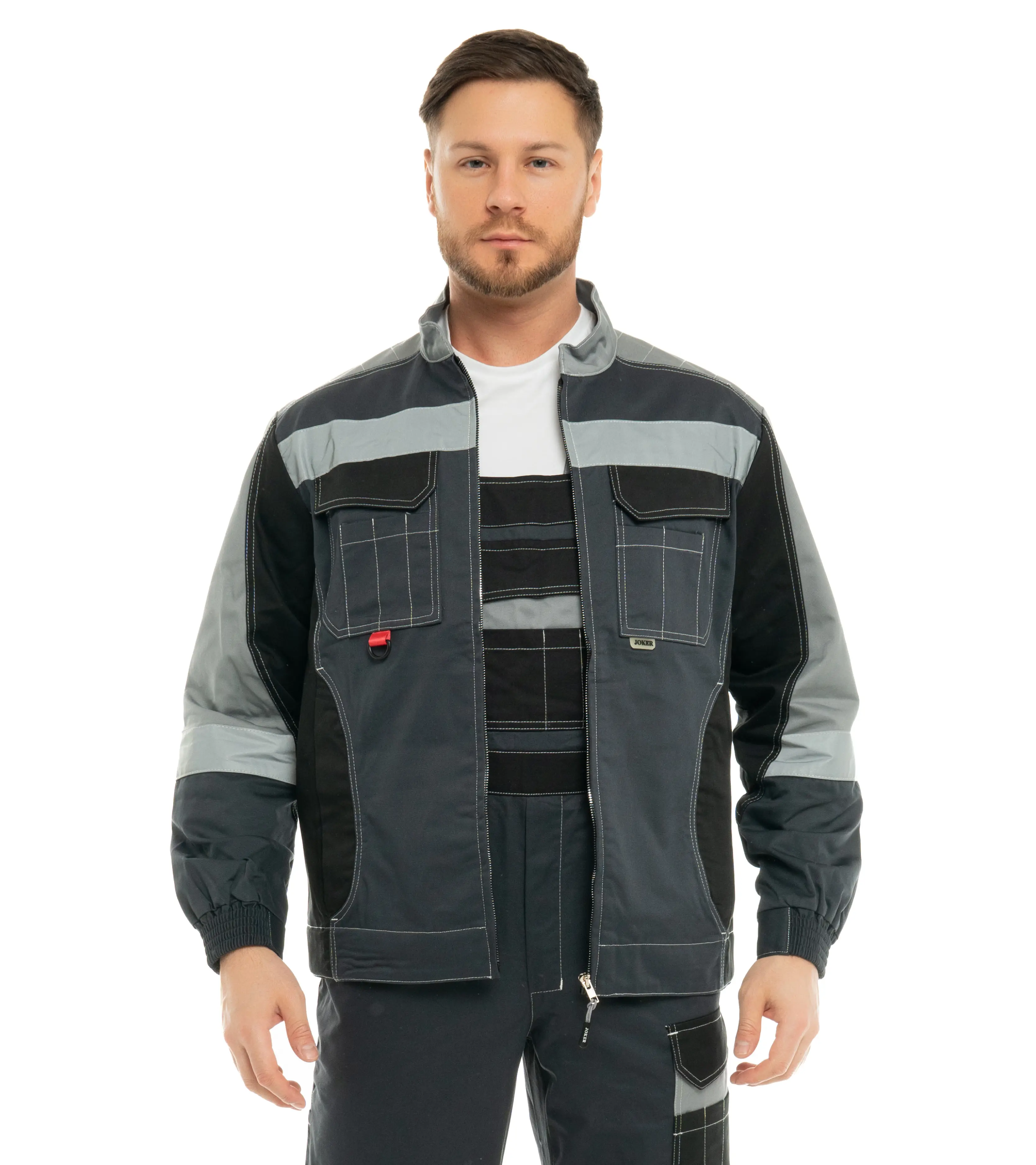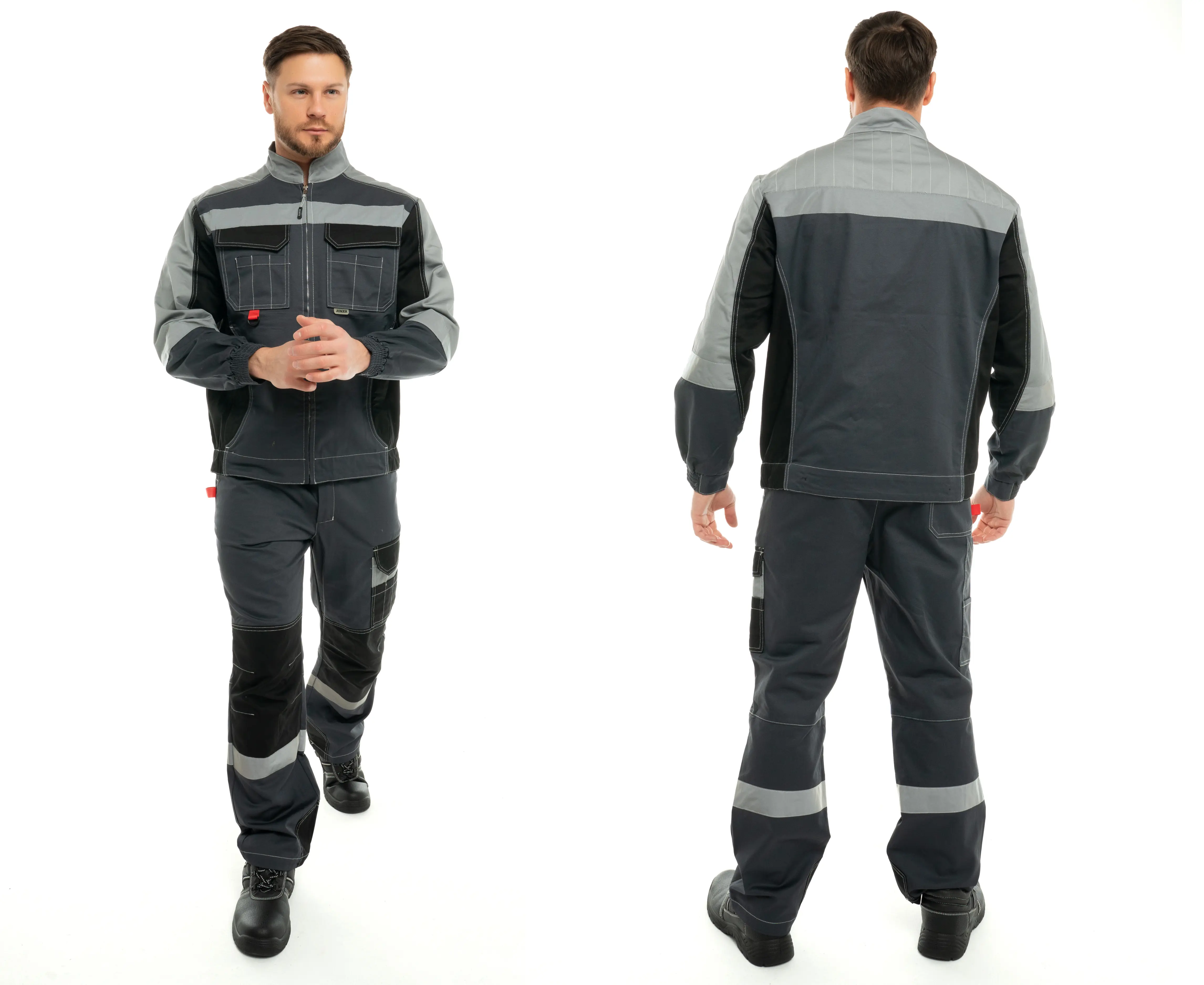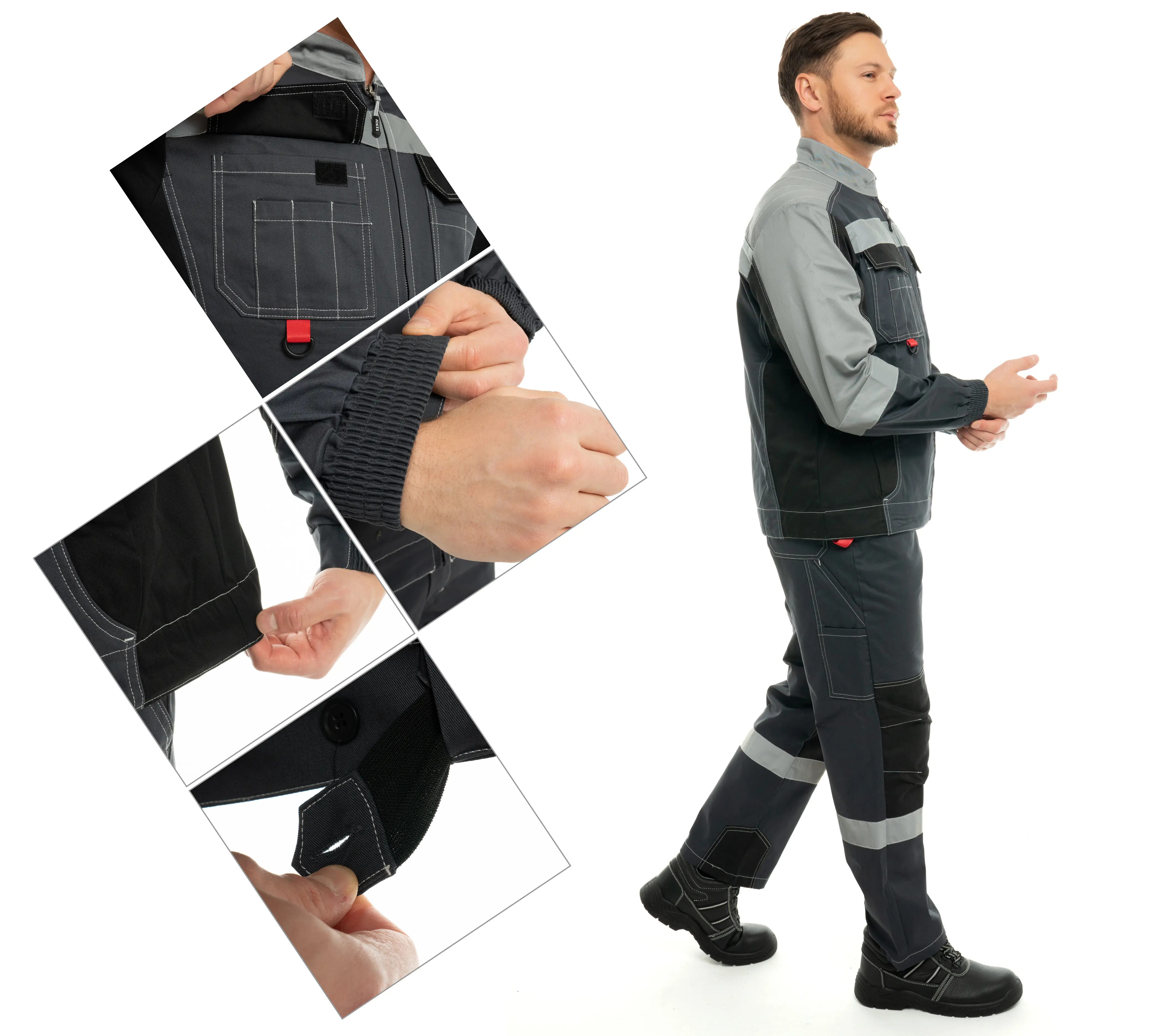 - Костюм из ткани с масловодоотталкивающей отделкой, малоусадочной, дышащей, износостойкой.