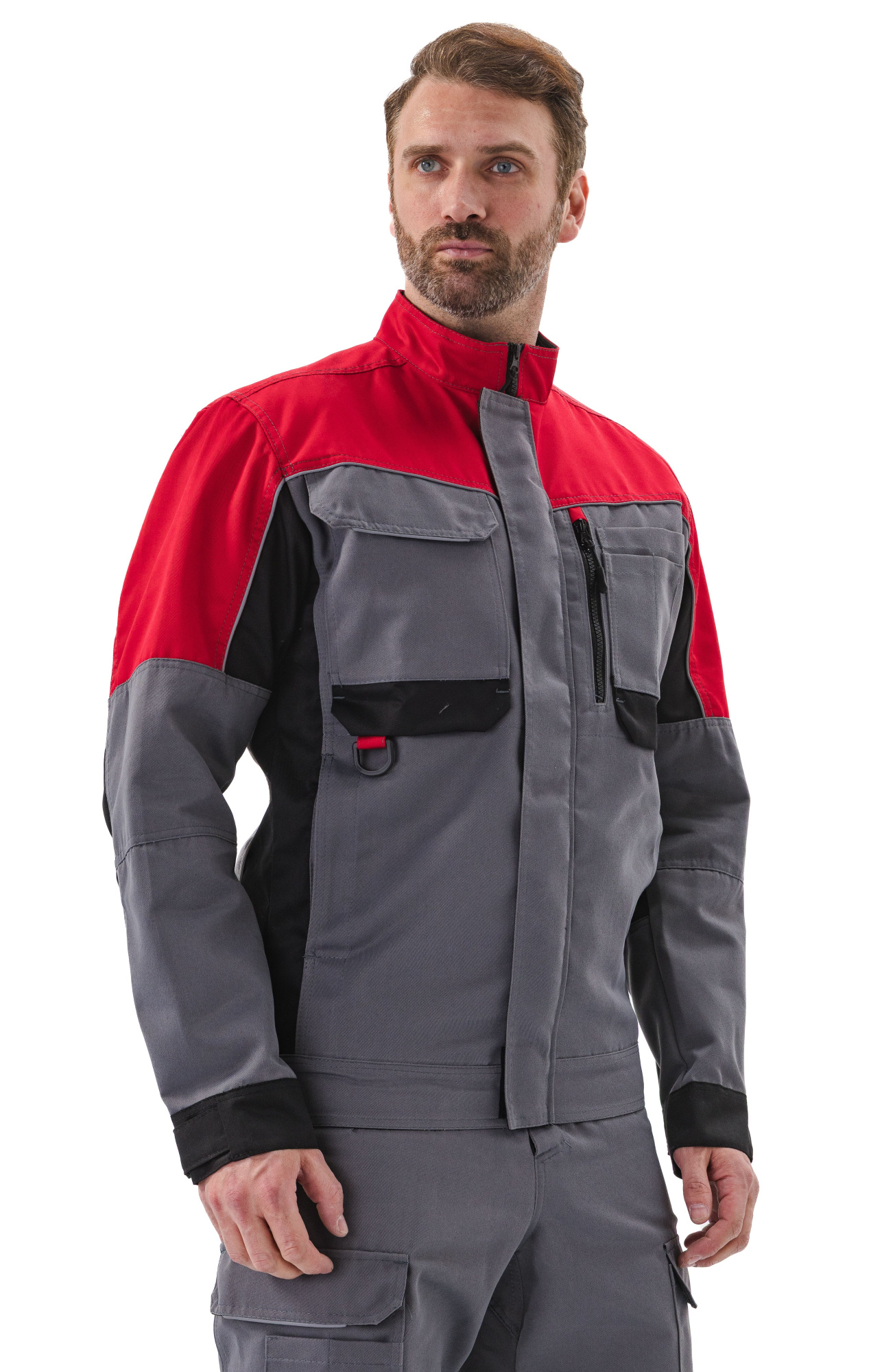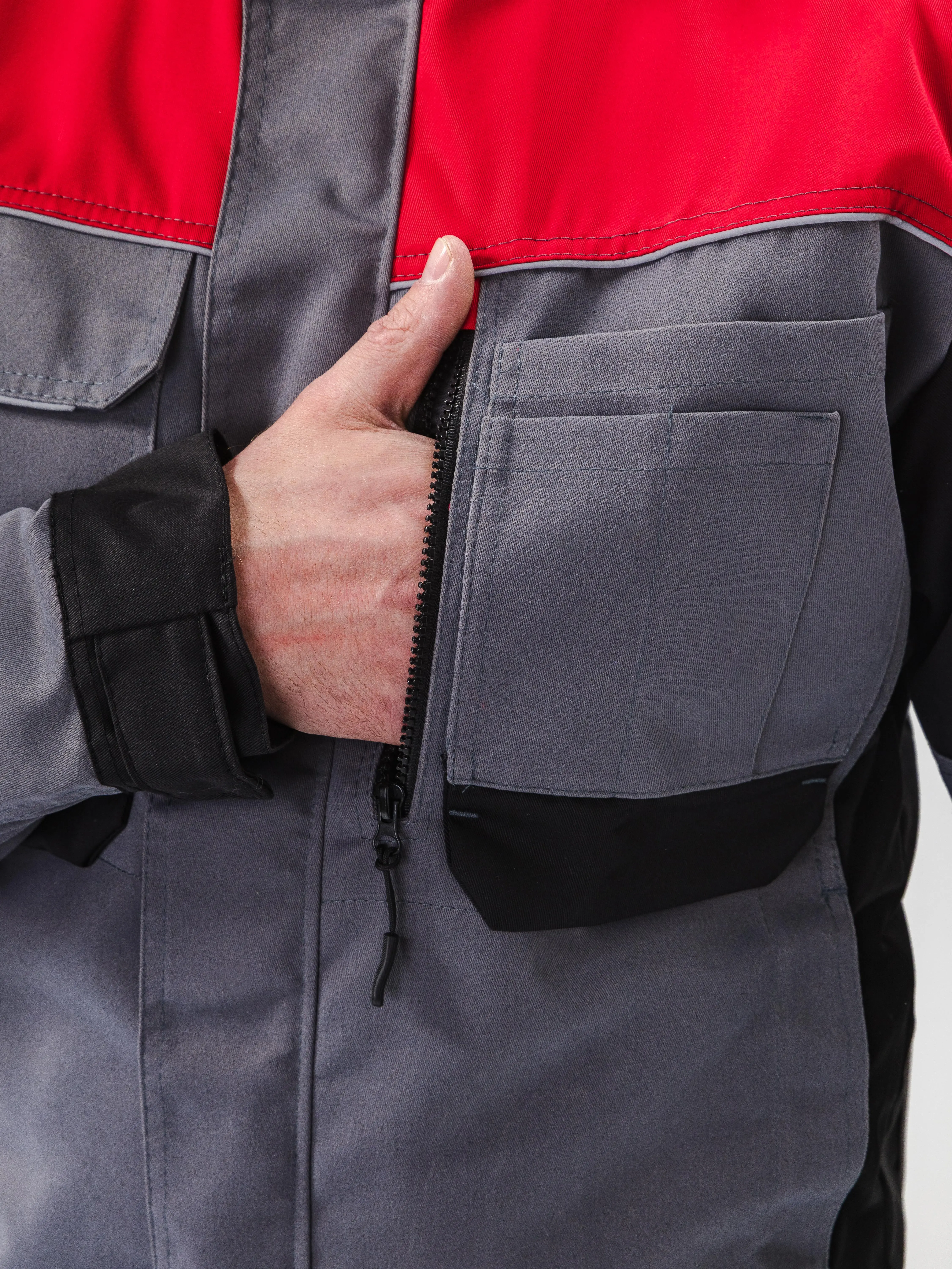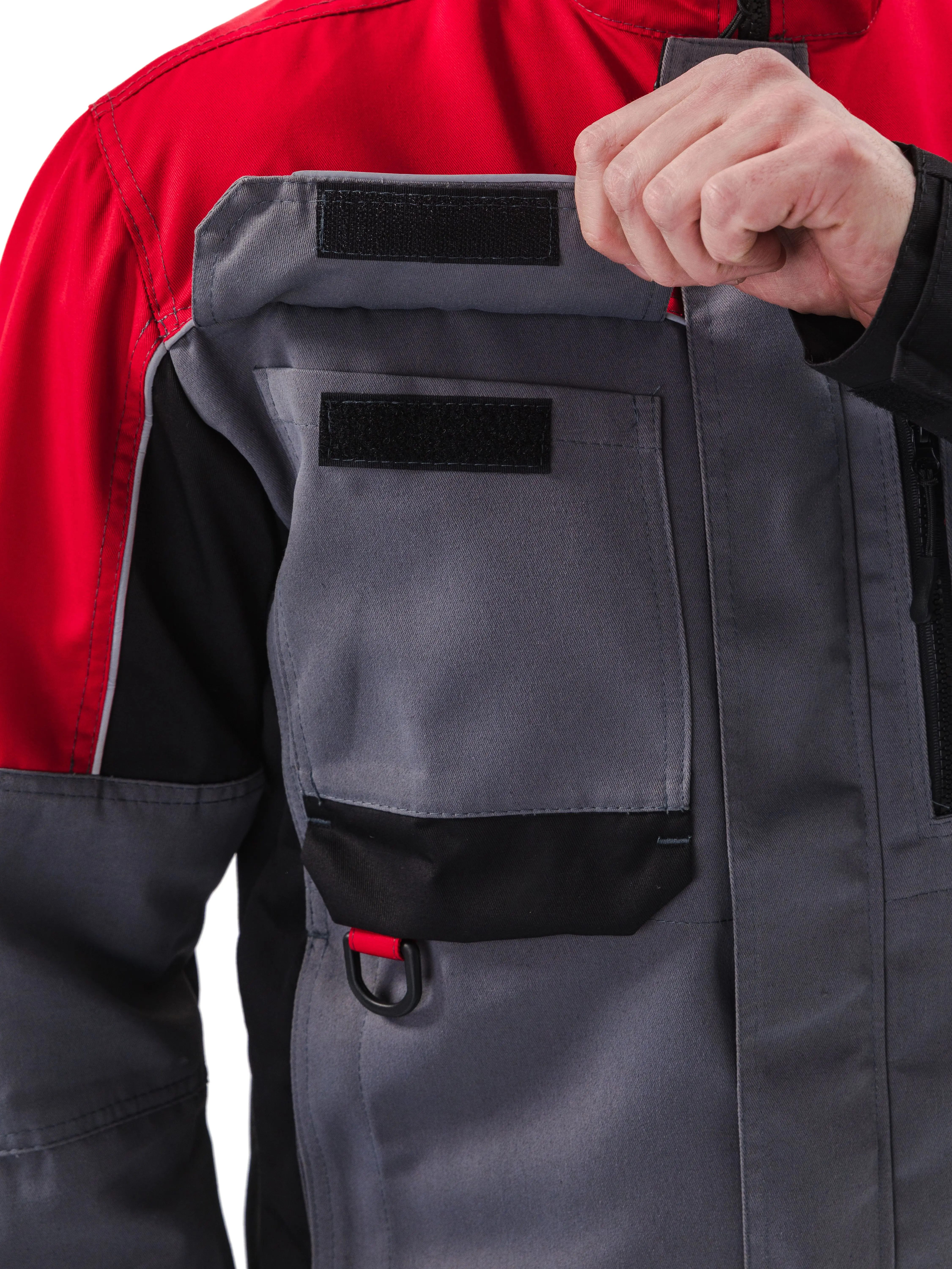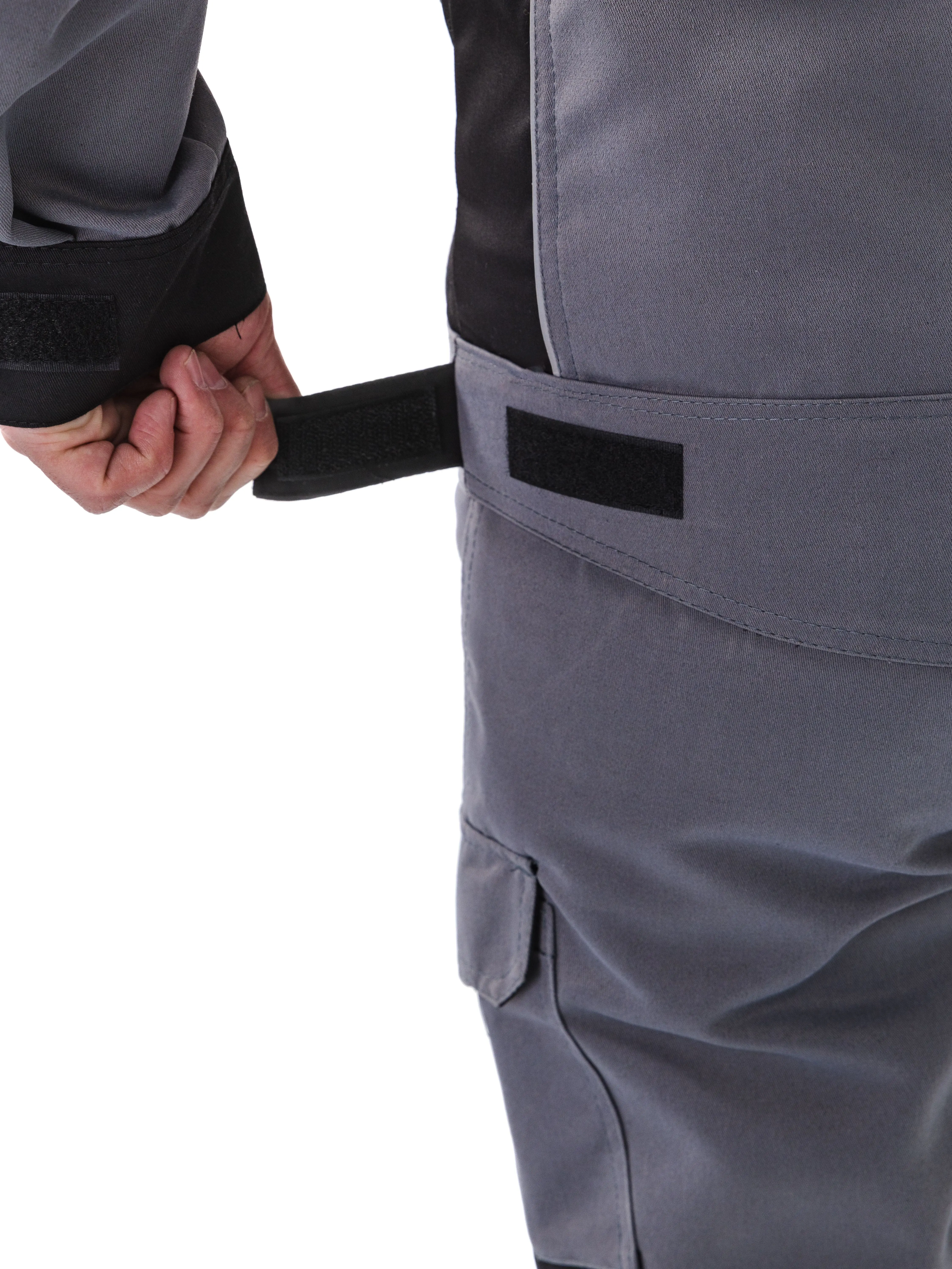 - Рукава имеют эргономичный крой с дополнительным объемом в области локтя с помощью вытачек. Низ рукавов на манжете из отделочной ткани, ширина манжеты регулируется с помощью паты на липучке;