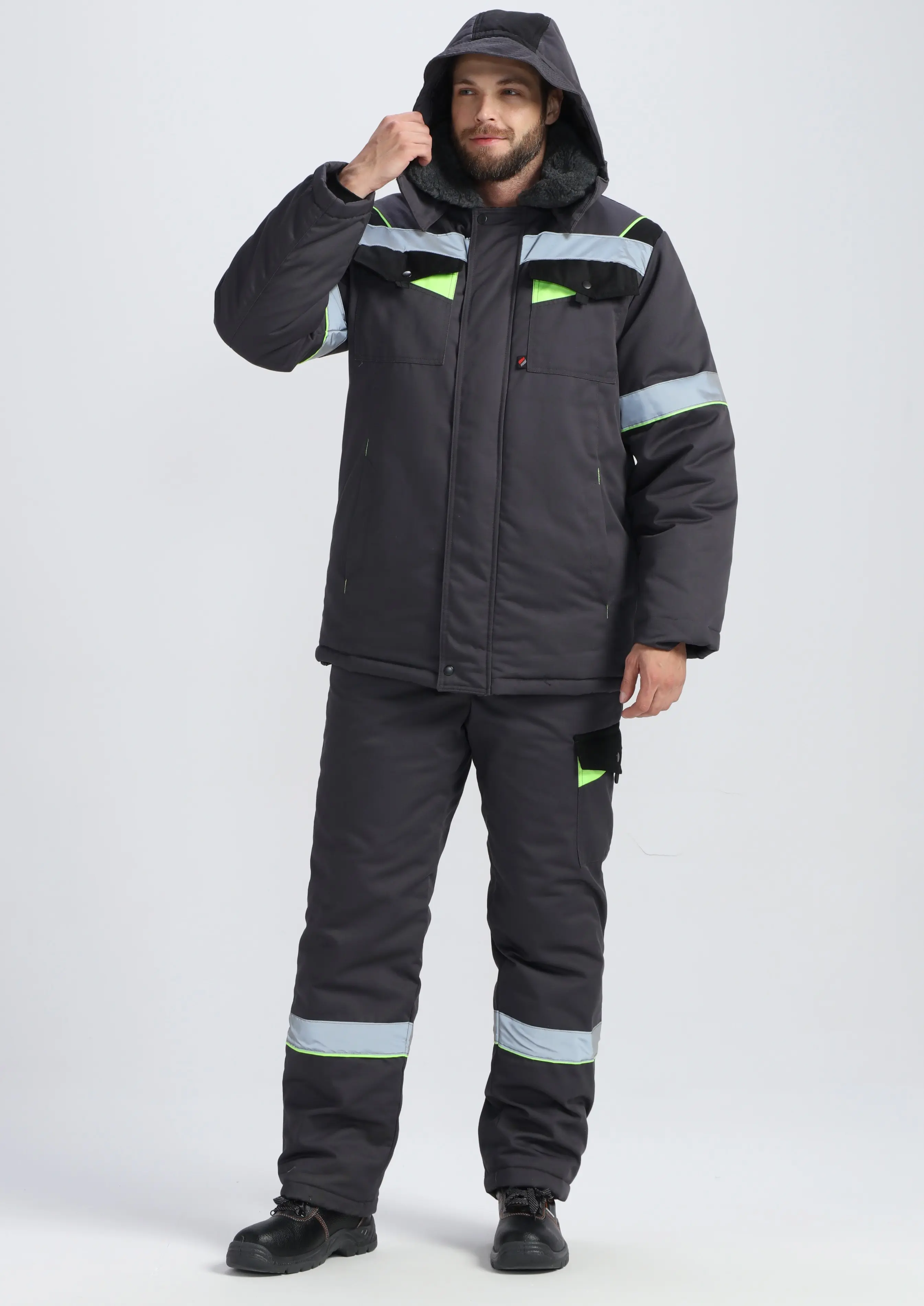- со съёмным утеплённым капюшоном, пристёгивающимся к воротнику на 3 пуговицы, высота капюшона регулируется при помощи паты капюшона;