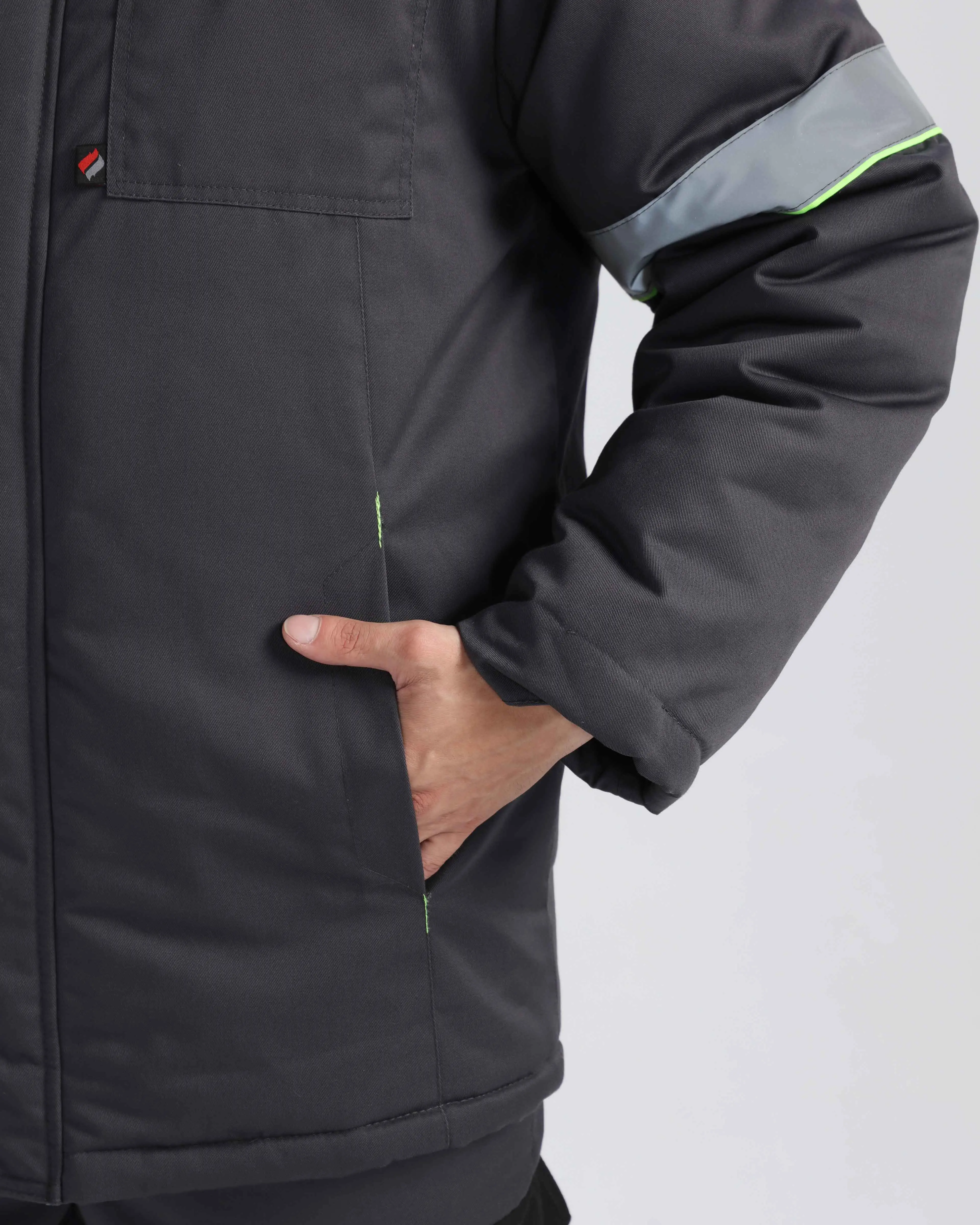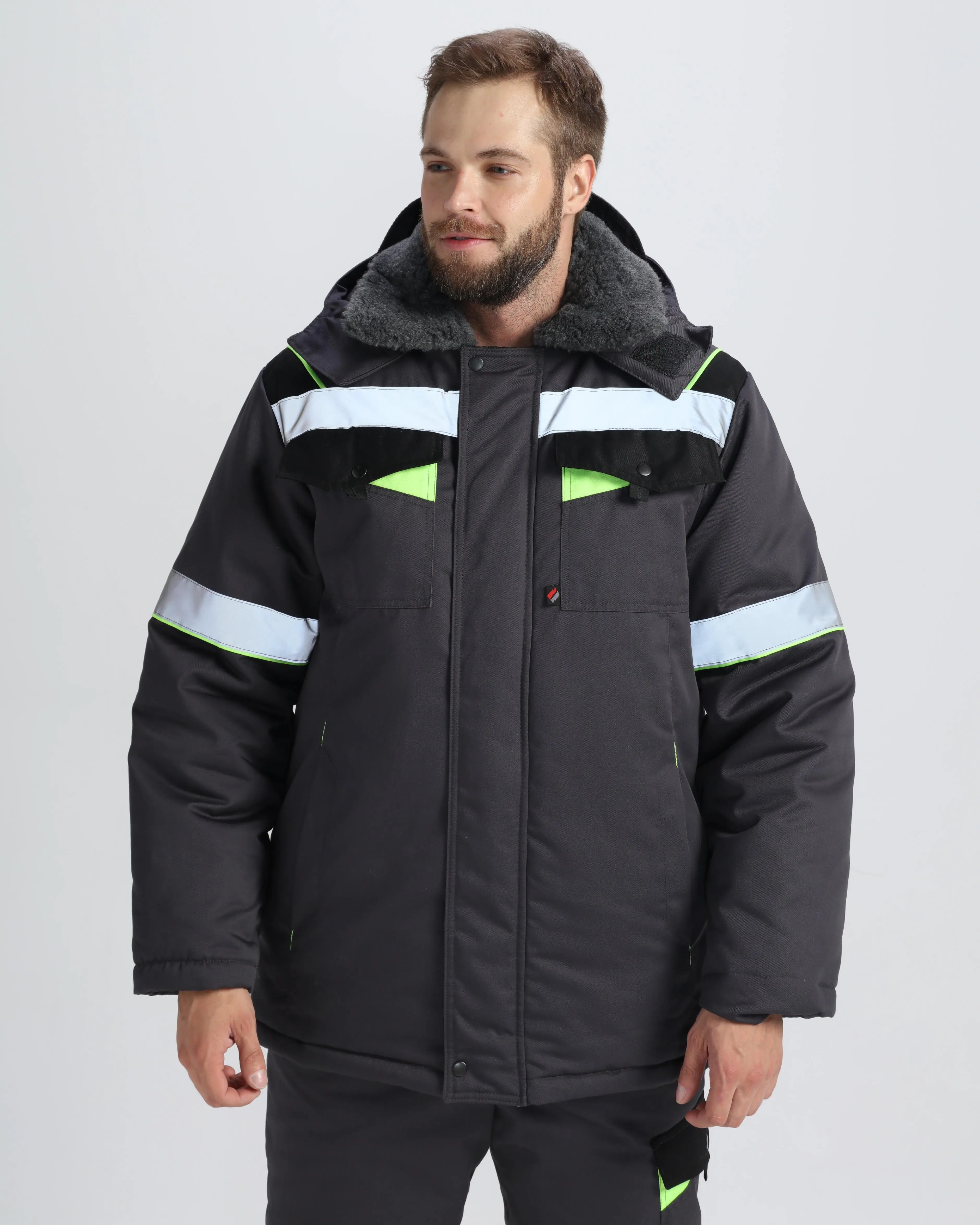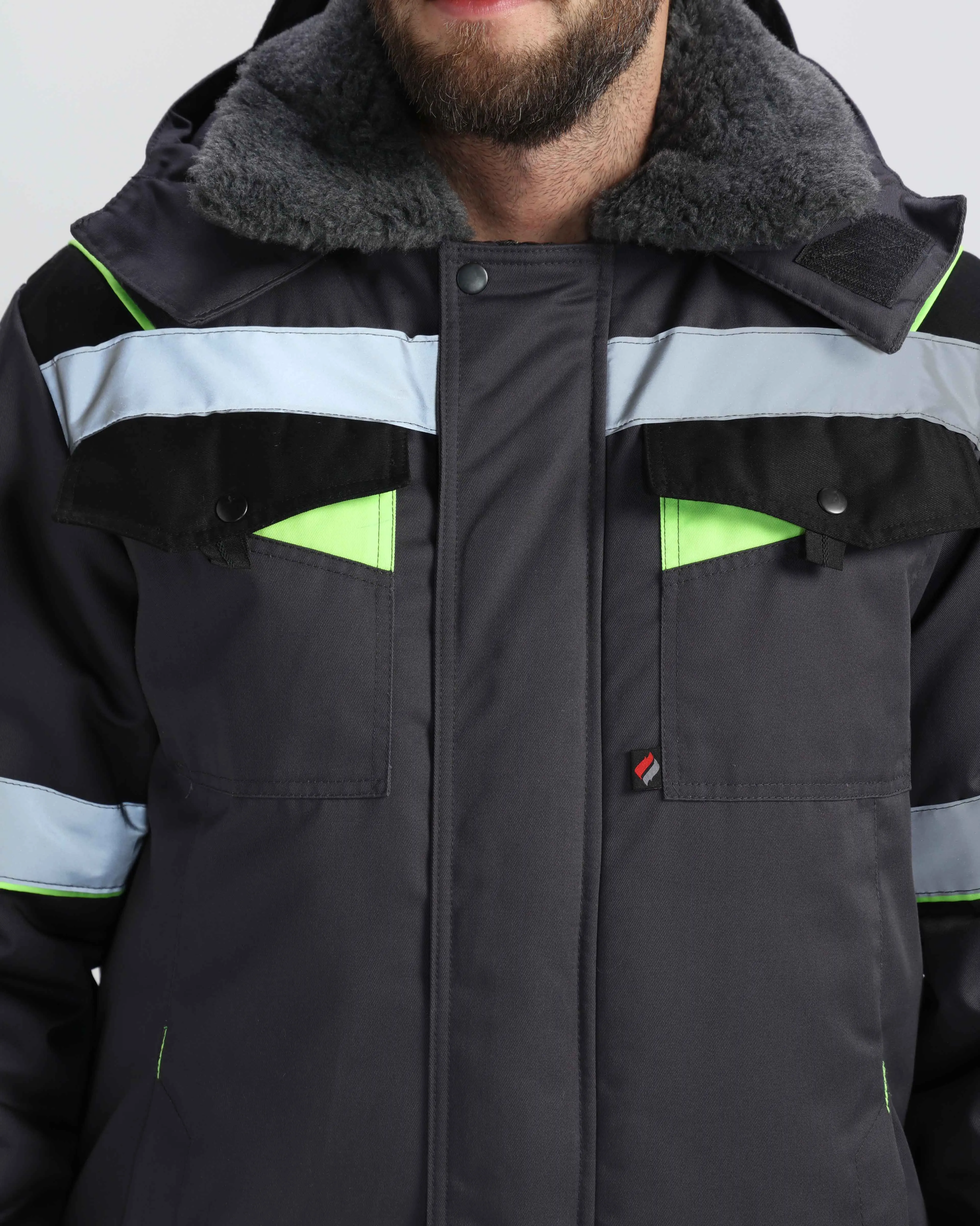 - с нагрудными карманами с клапаном на кнопках и нижними карманами в швах, с регулировкой объёма по низу куртки;