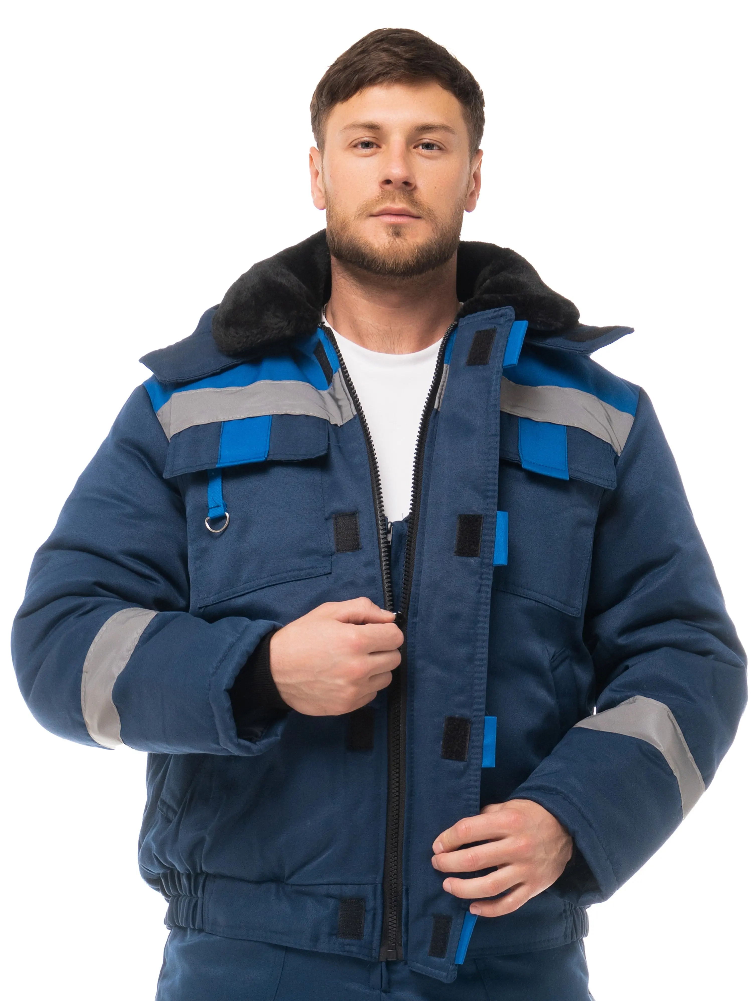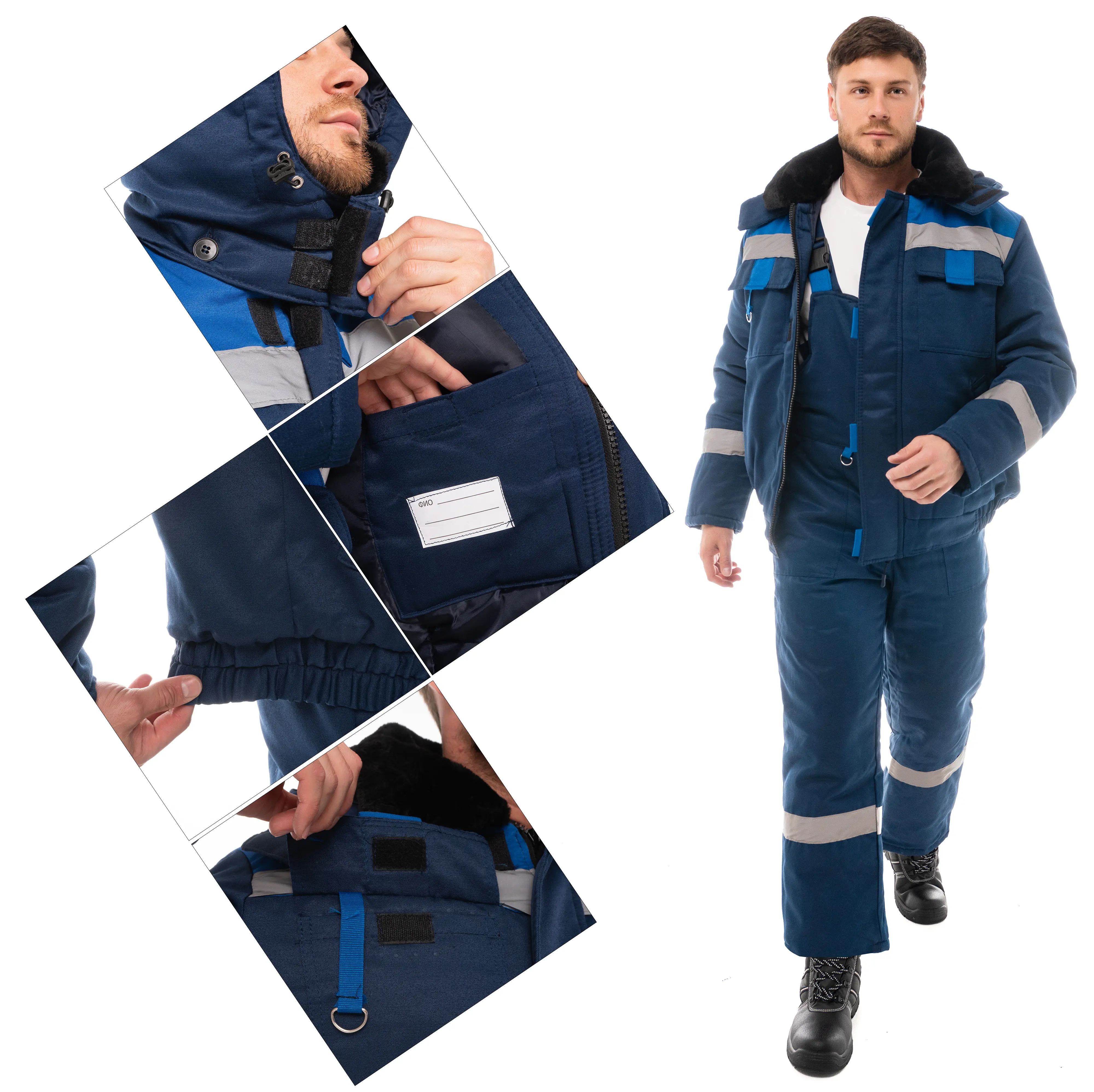 - Изделие оснащено утепленным съемным капюшоном и меховым воротником. Благодаря яркой контрастной отделке рабочая форма заметна издалека.