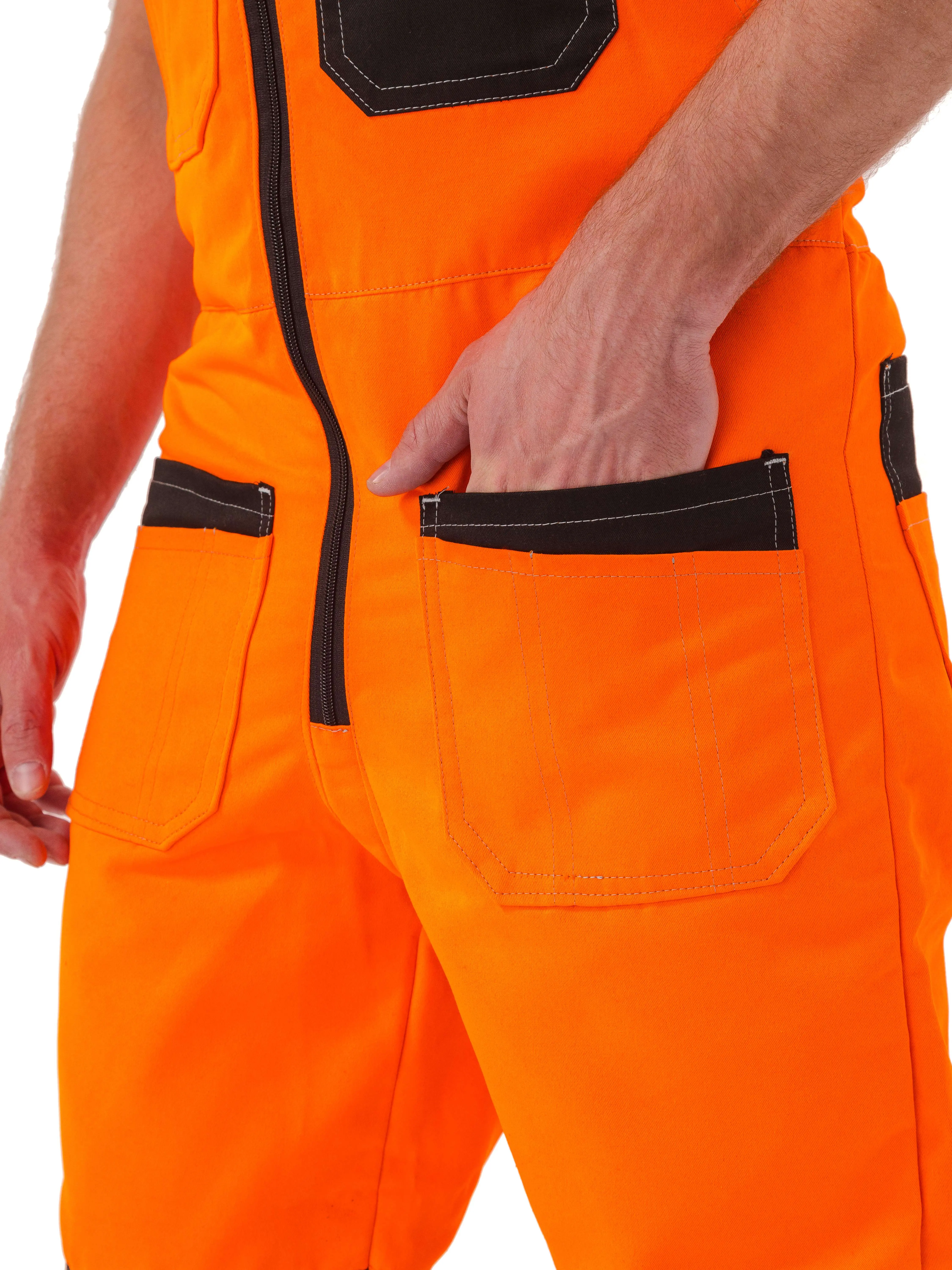 - На уровне бедер симметричные двойные накладные карманы с дополнительными отделениями;