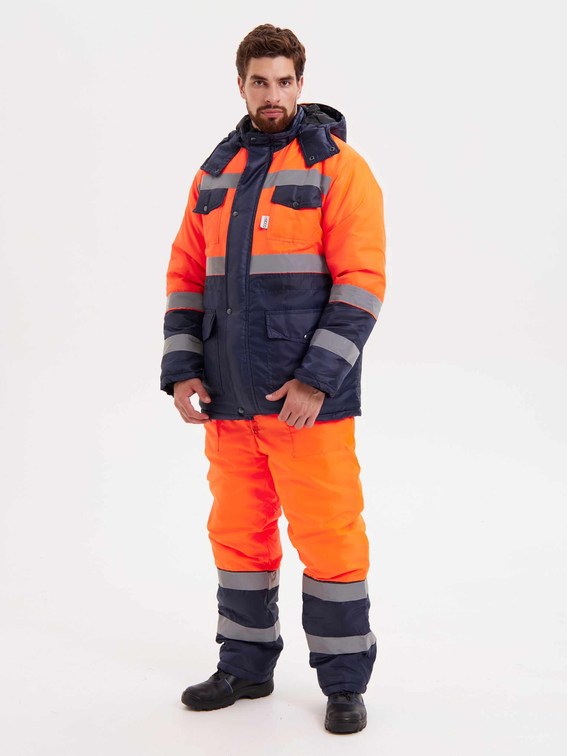 - световозвращающая лента шириной 50 мм проходит по линии кокетки на полочках и спинке, низу куртки, средней части рукавов, и двойные в нижней части полукомбинезона, что соответствует III классу защиты сигнальной одежды.