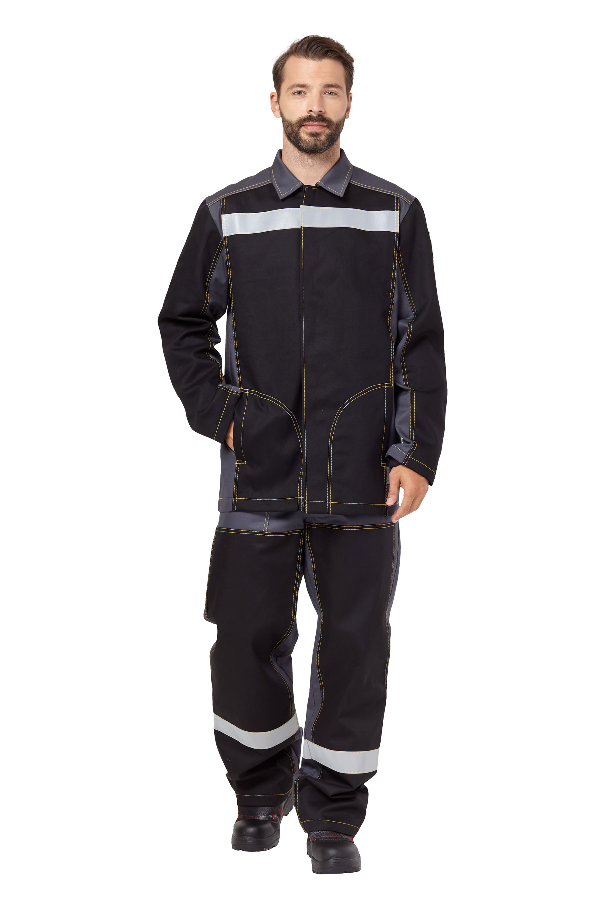 - С огнестойкой лентой СОП шириной 50мм, на спине, в области груди, по низу брюк, обеспечивает хорошую видимость в светлое и темное время суток.