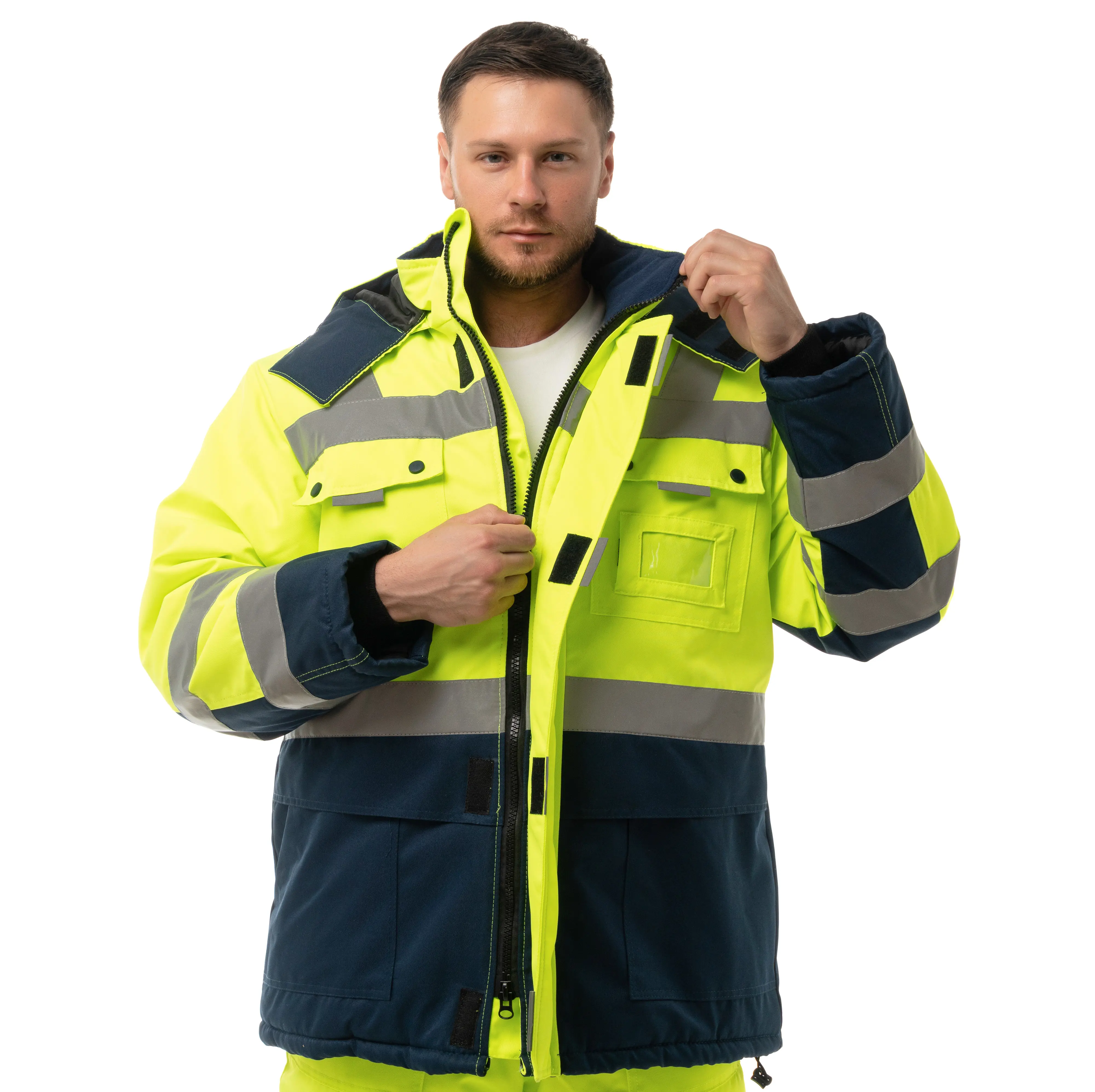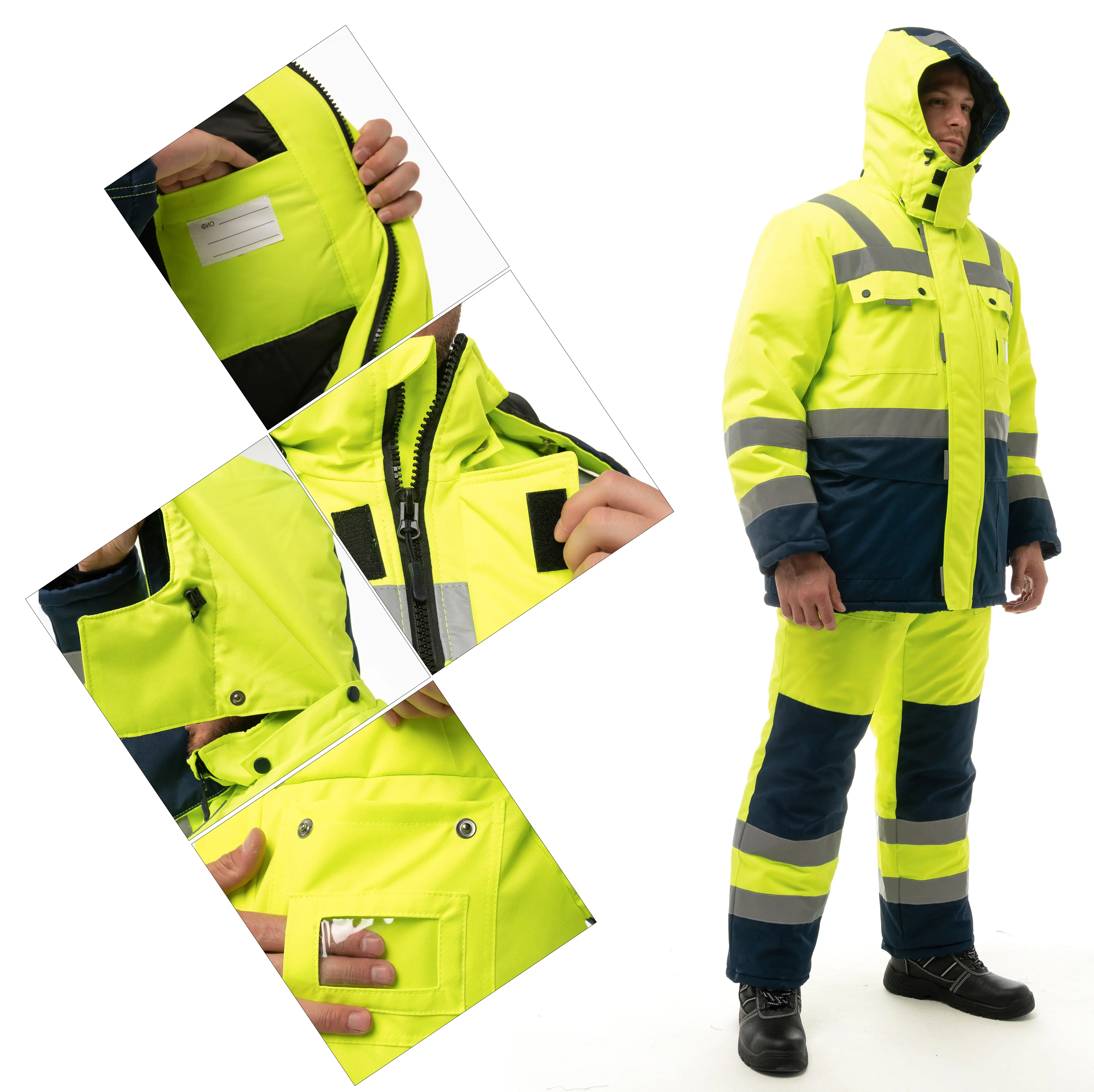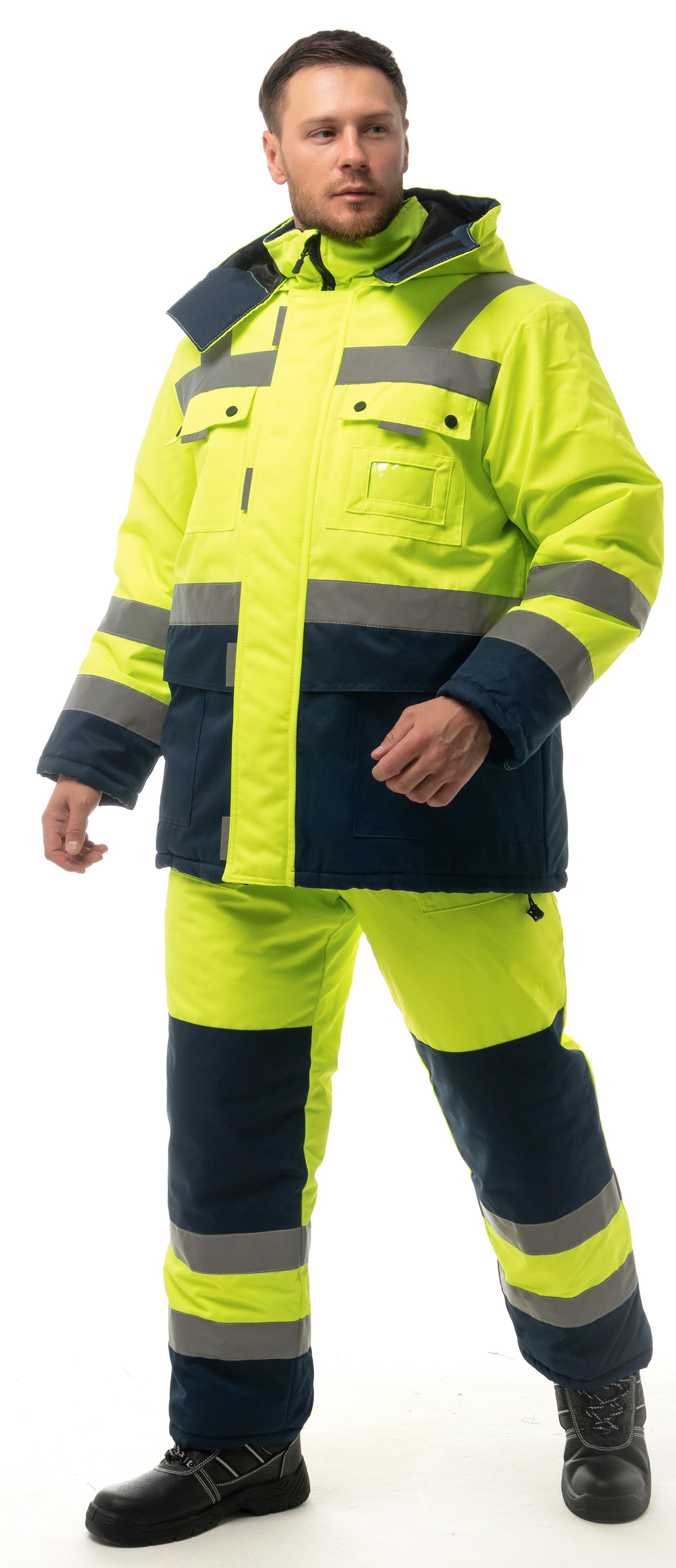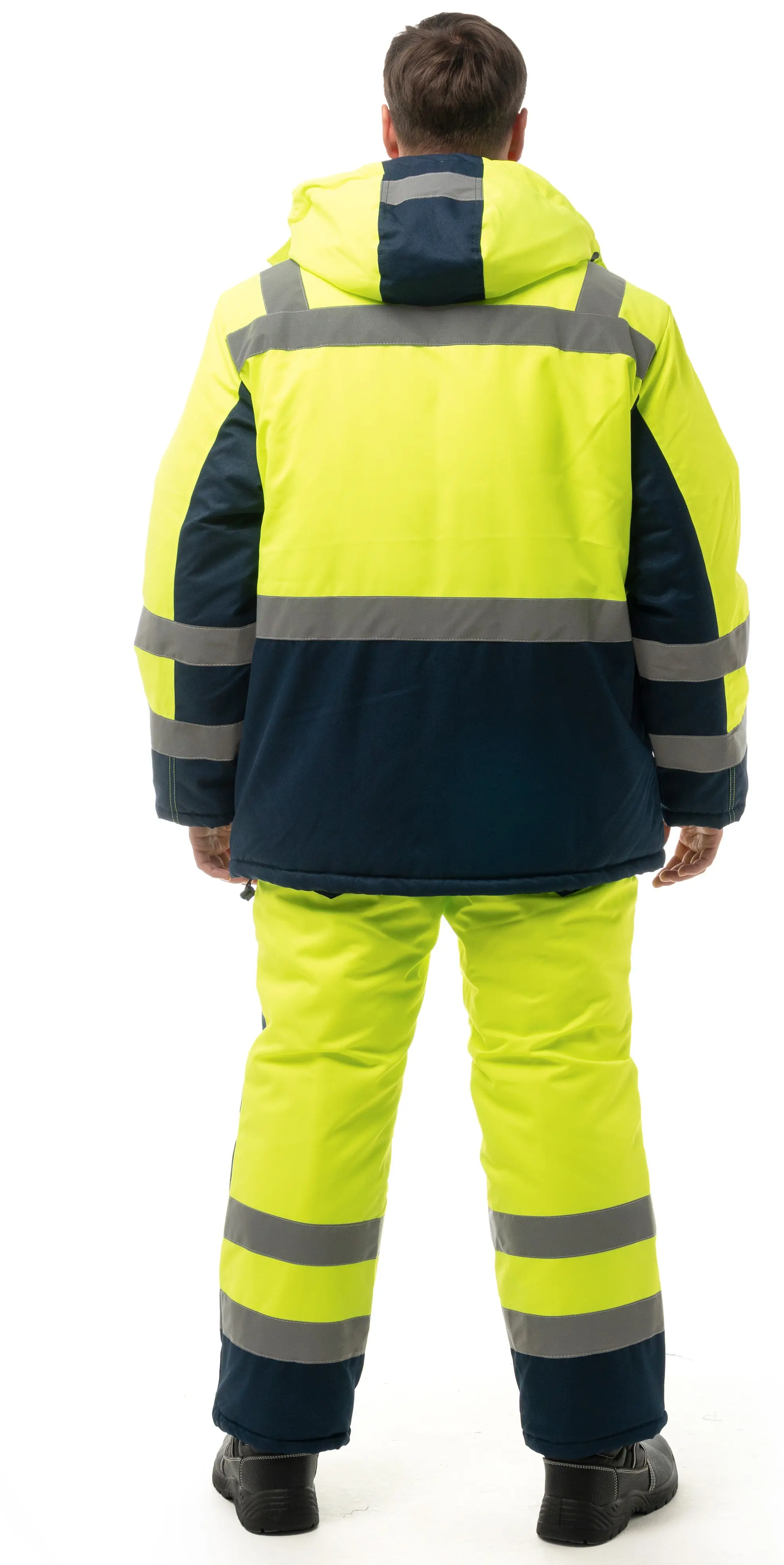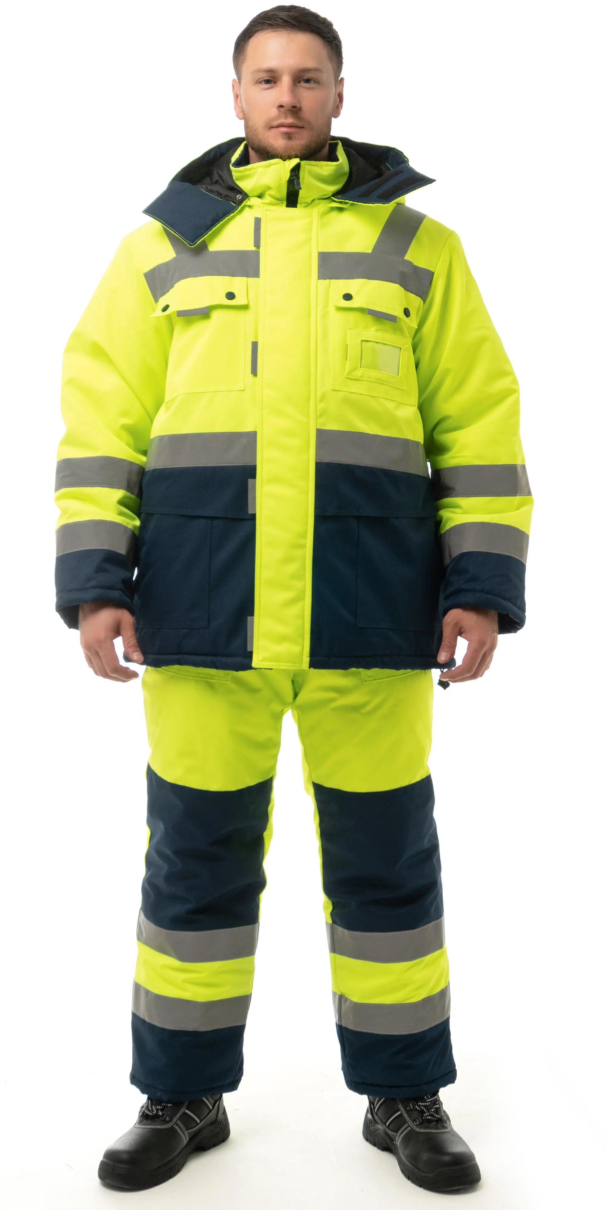 - Световозвращающие полосы 50 мм по линии кокетки, рукавам, низу куртки.