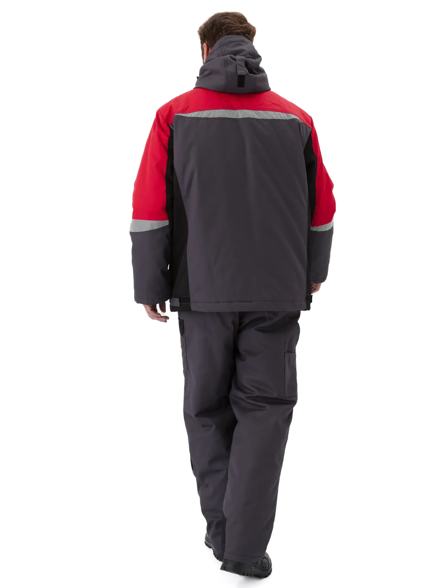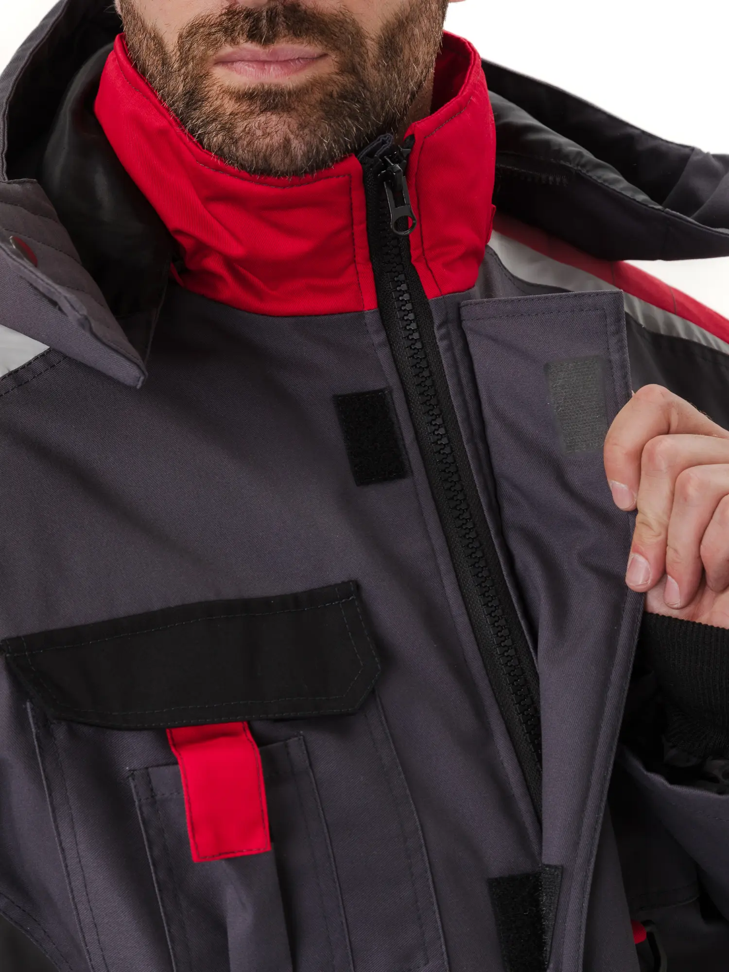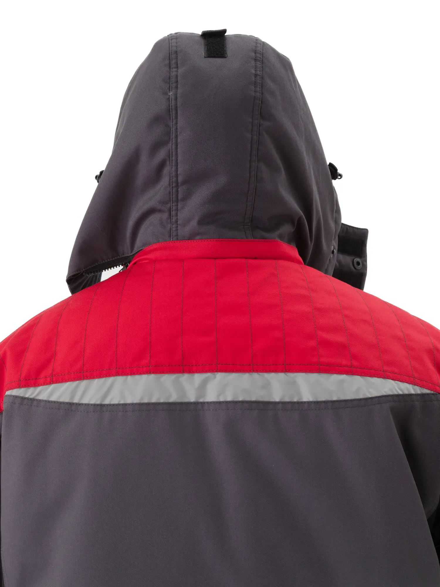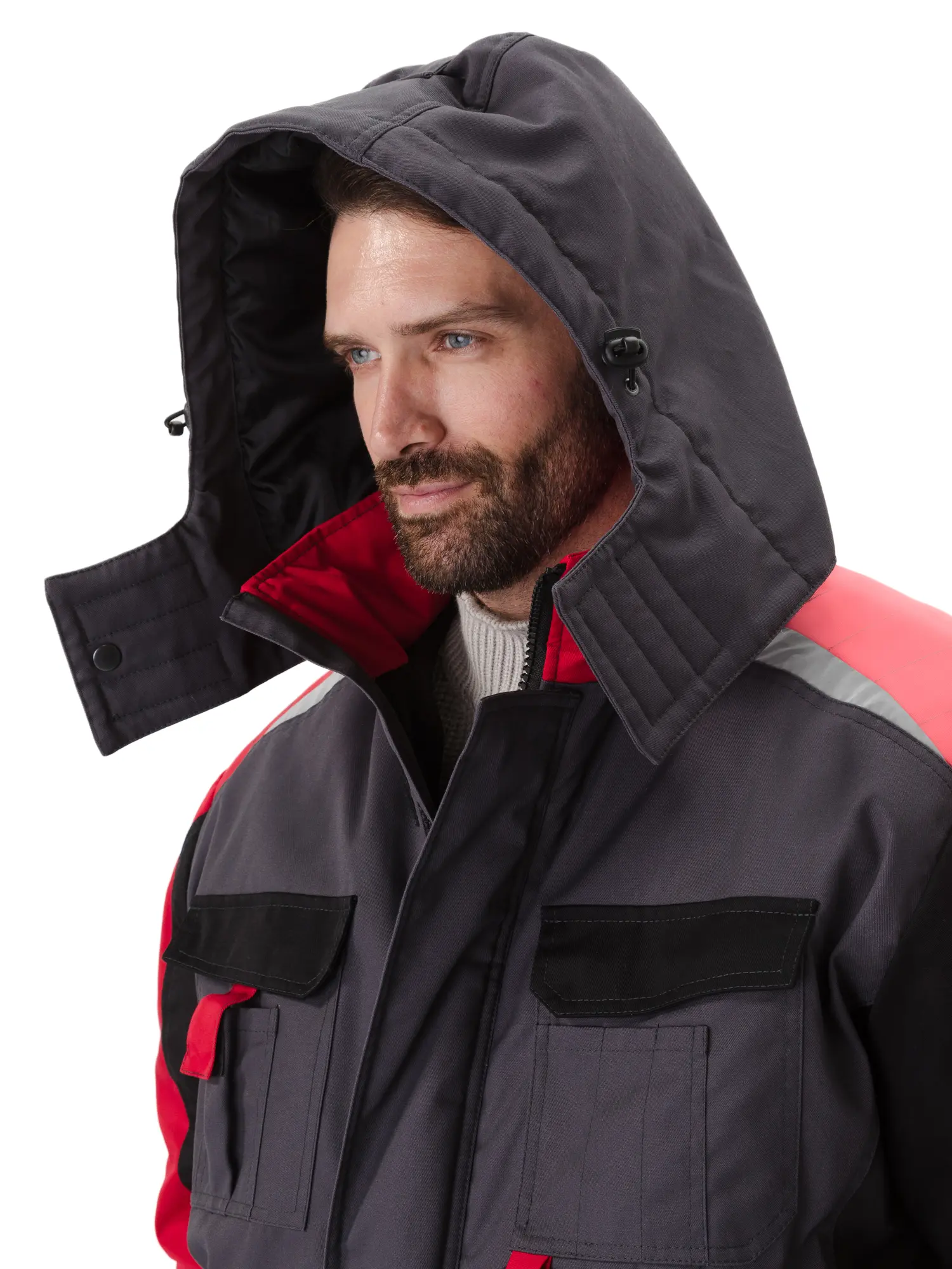 - Капюшон утепленный съёмный, регулирующийся по высоте хлястиком на липучке и кулисой со шнуром-резинкой и фиксаторами по лицевому вырезу капюшона, лицевые паты капюшона на липучке, фиксируются при необходимости с помощью кнопки на боковых частях;