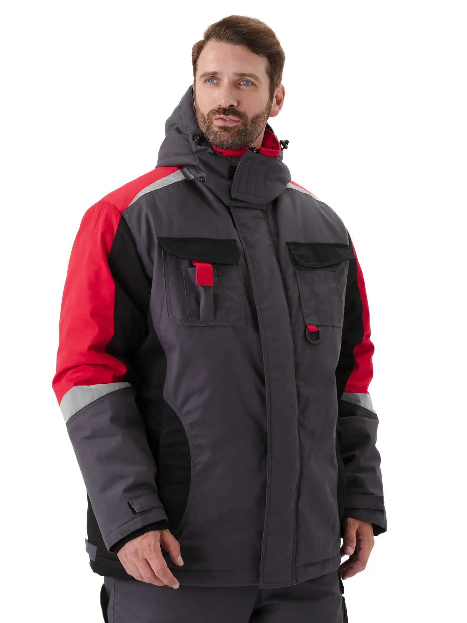 - Утепленная, прямого силуэта, с центральной застежкой на двух-замковую молнию трактор Т8 и двумя утепленными ветрозащитными планками. Верхняя планка застегивается на потайную липучку;