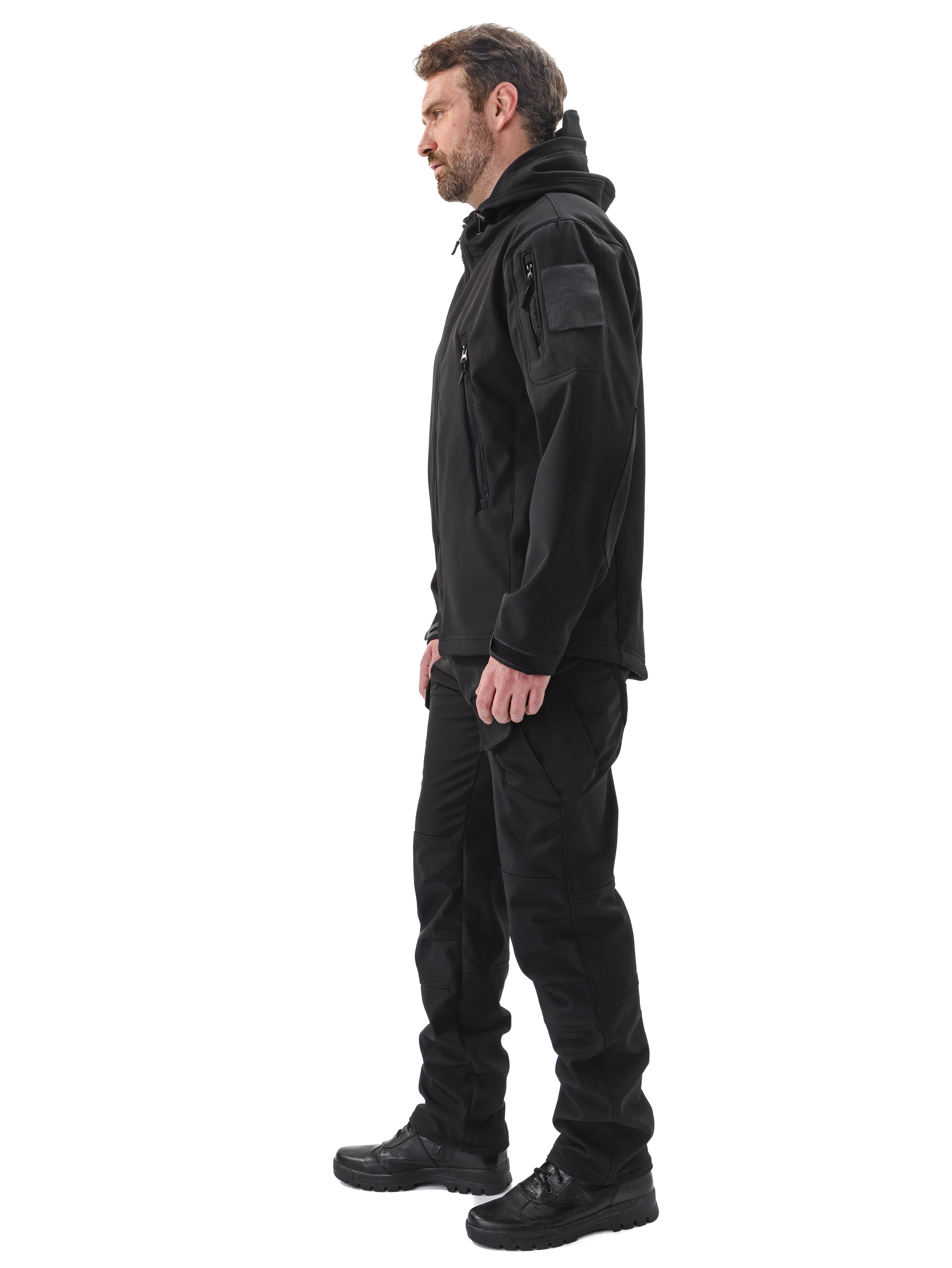 Универсальный мужской костюм состоит из куртки с капюшоном и брюк.