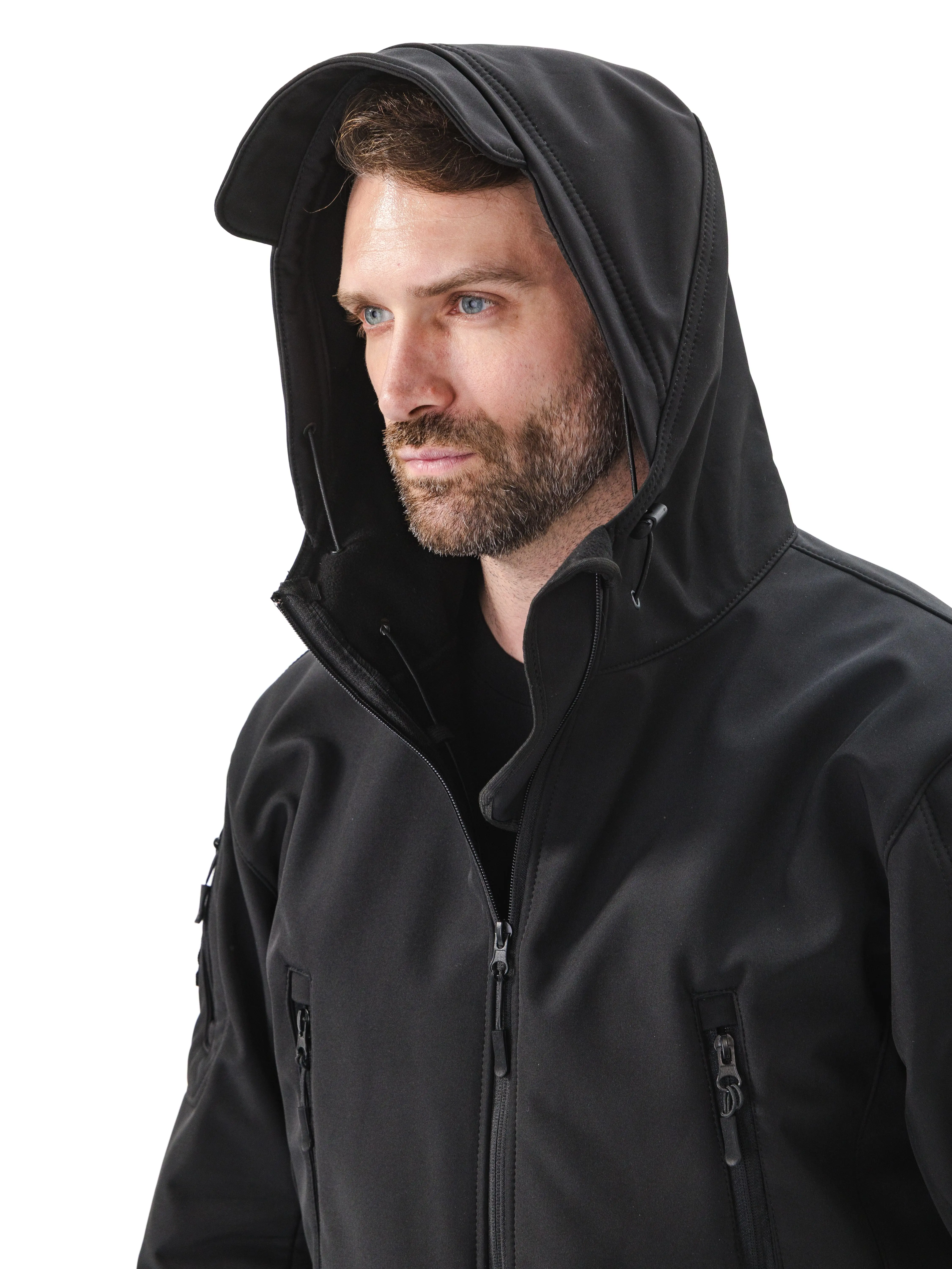 - капюшон с козырьком и кулиской по лицевой части со шнуром резинкой и фиксаторами, утяжка кулисы капюшона происходит через нагрудные карманы;