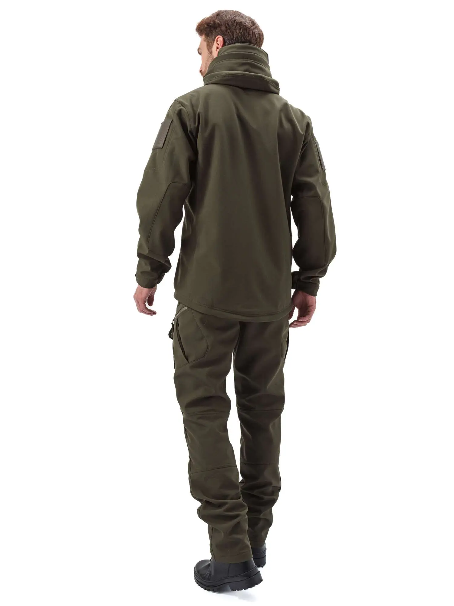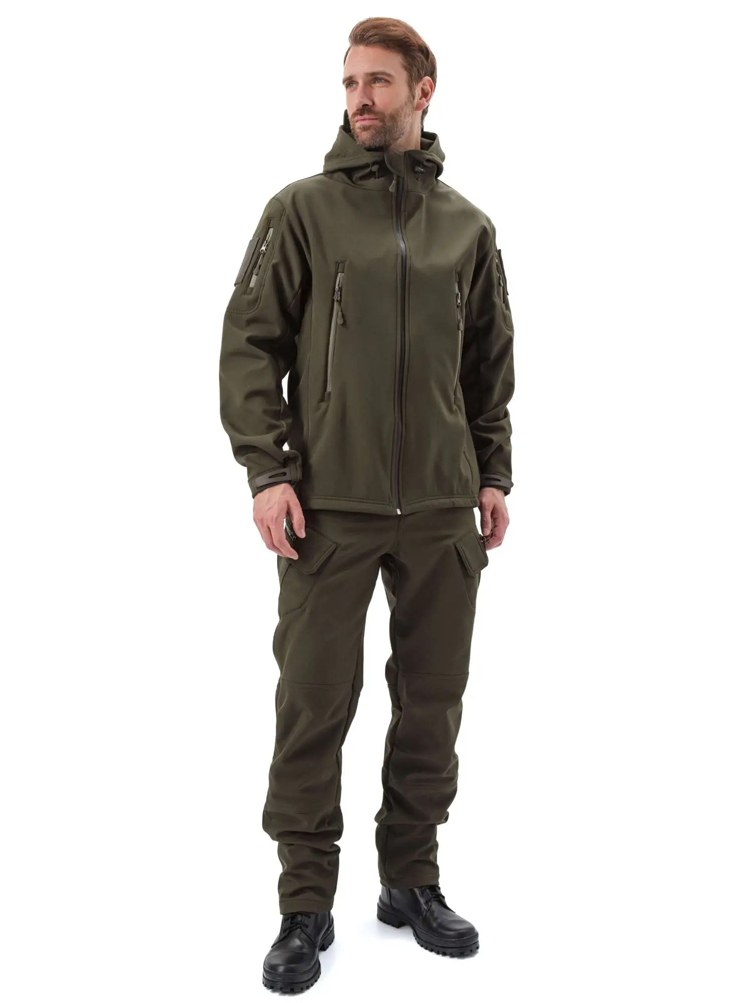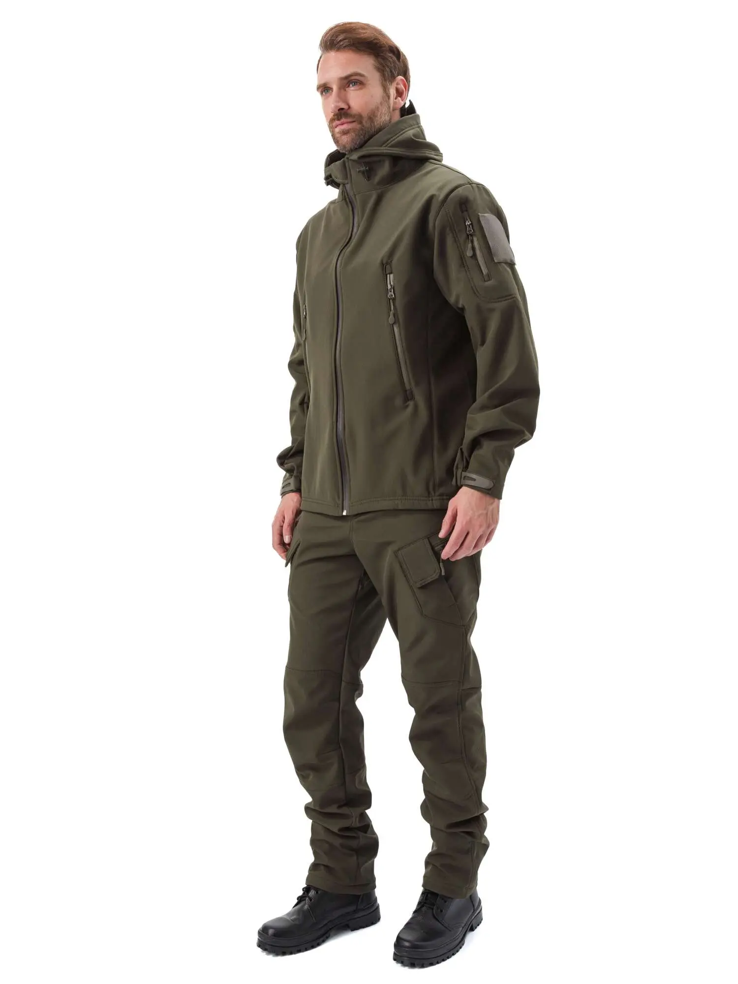 Универсальный мужской костюм состоит из куртки с капюшоном и брюк.