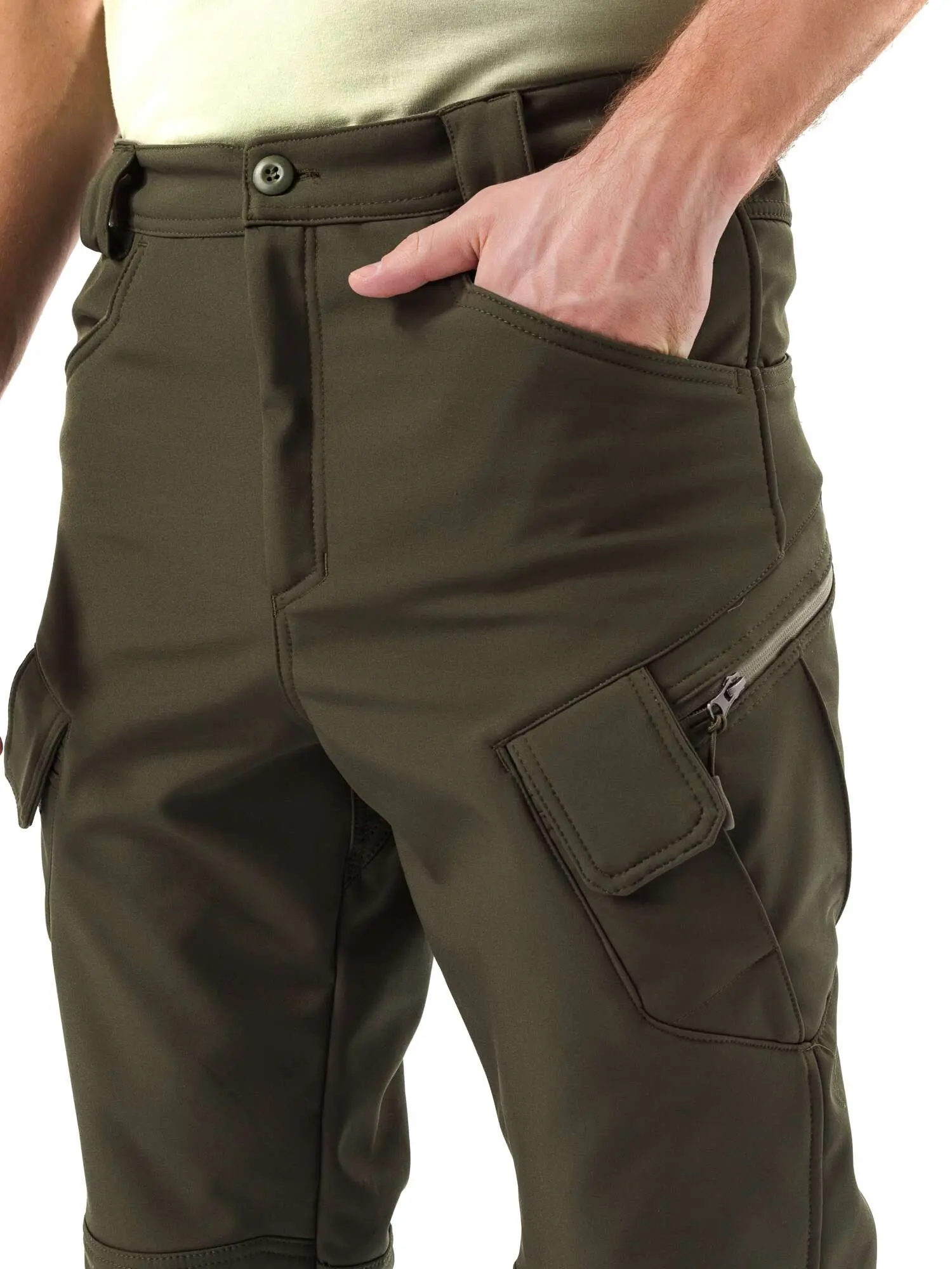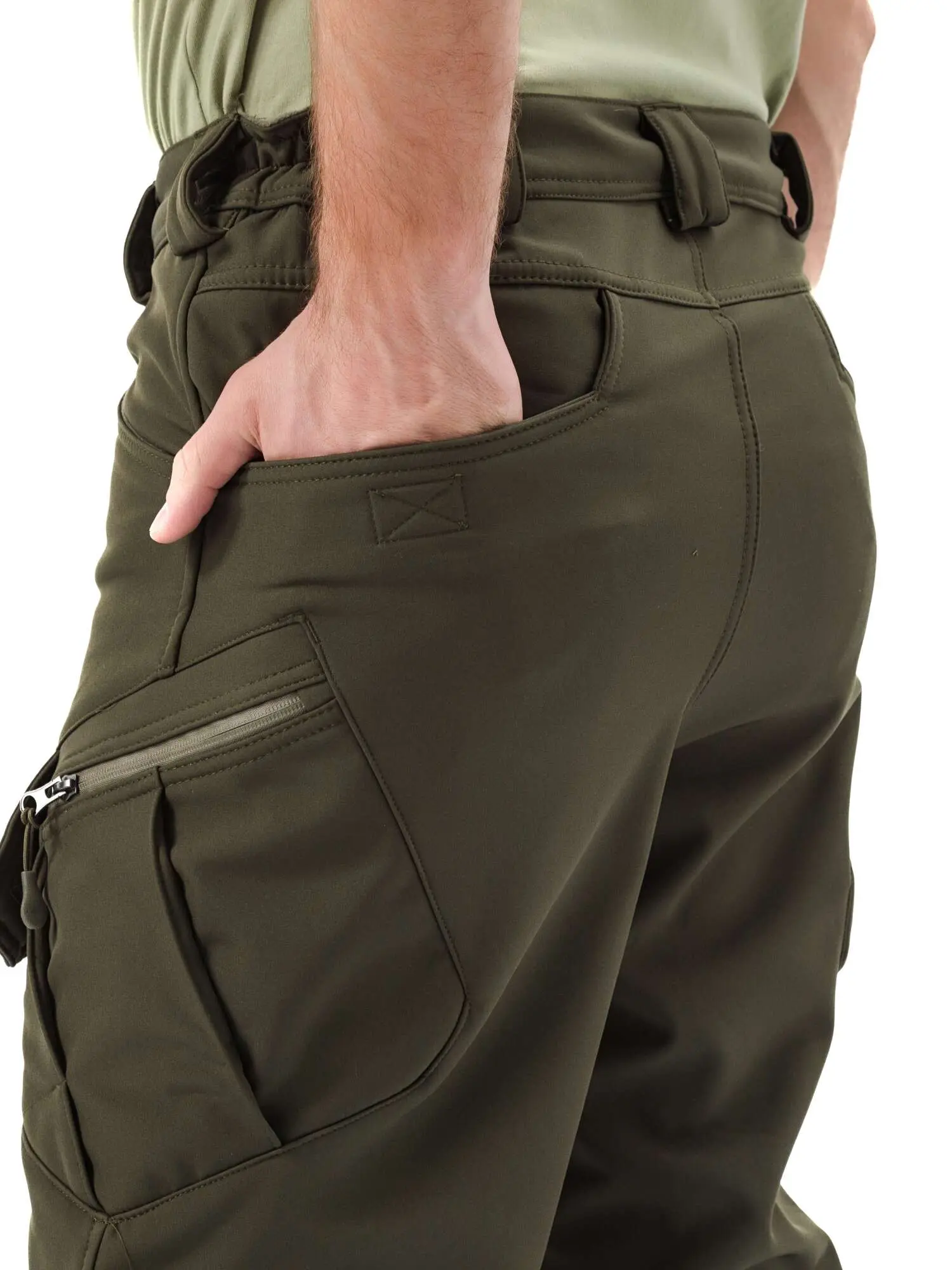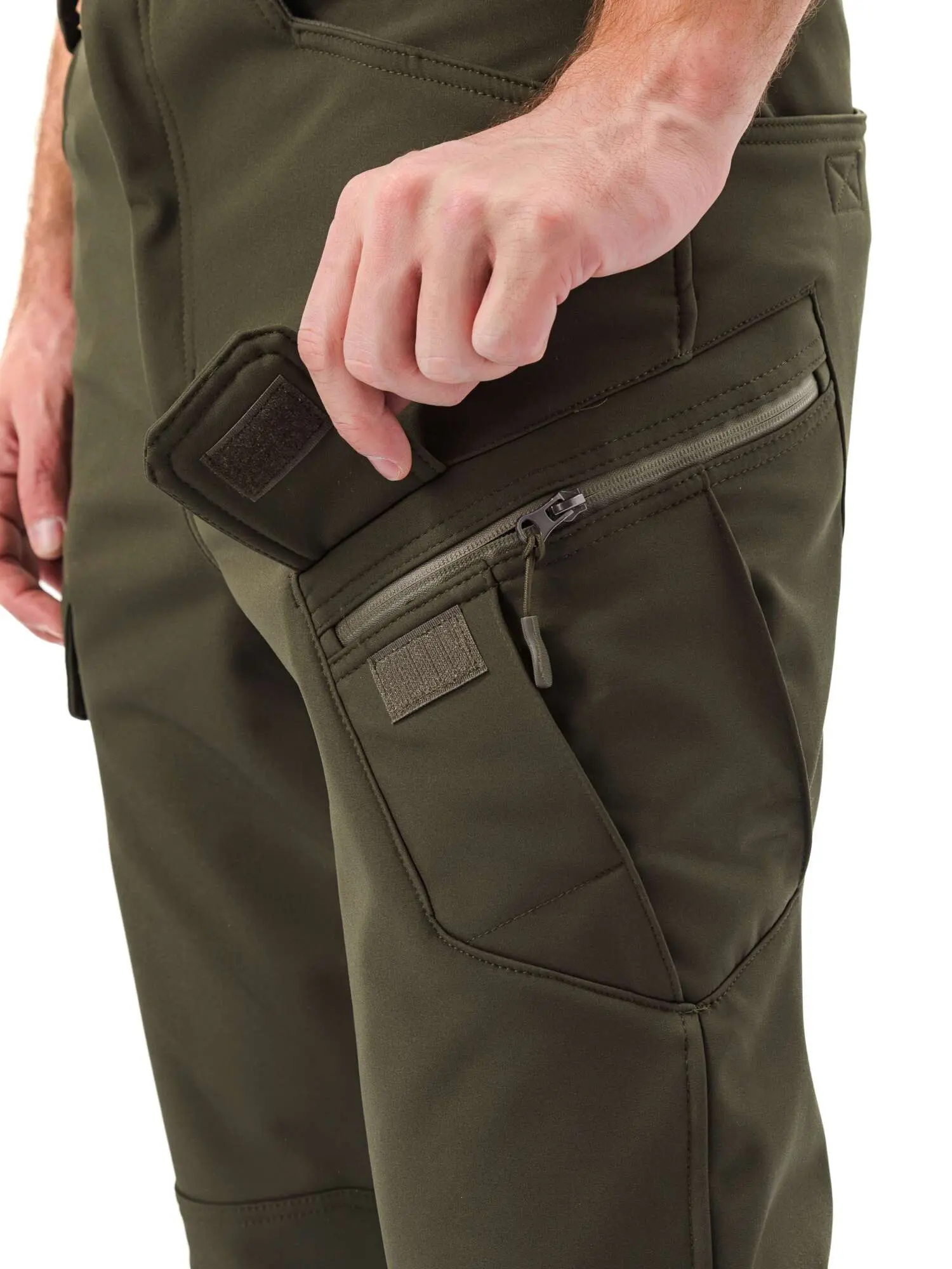 - на боковых сторонах брюк объемные карманы с двумя складками со входом на молнию и ограничителями с двух сторон, замок молнии закрывает декоративный клапан на липучке;