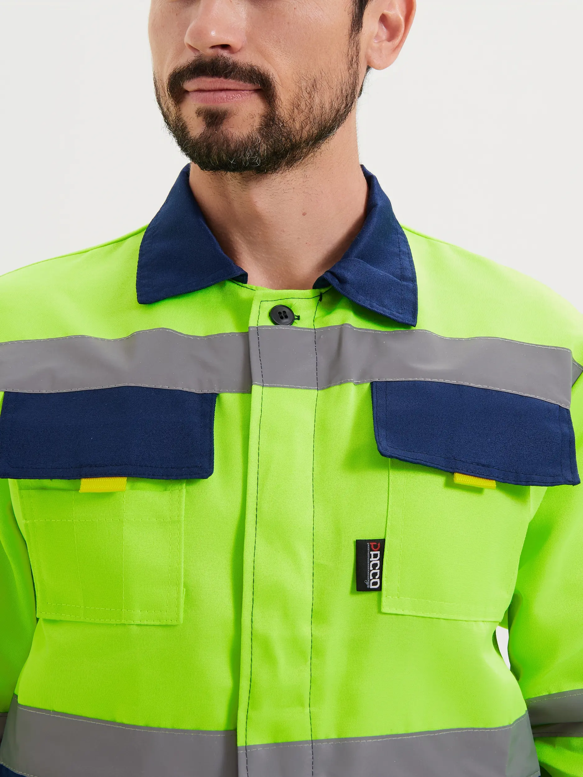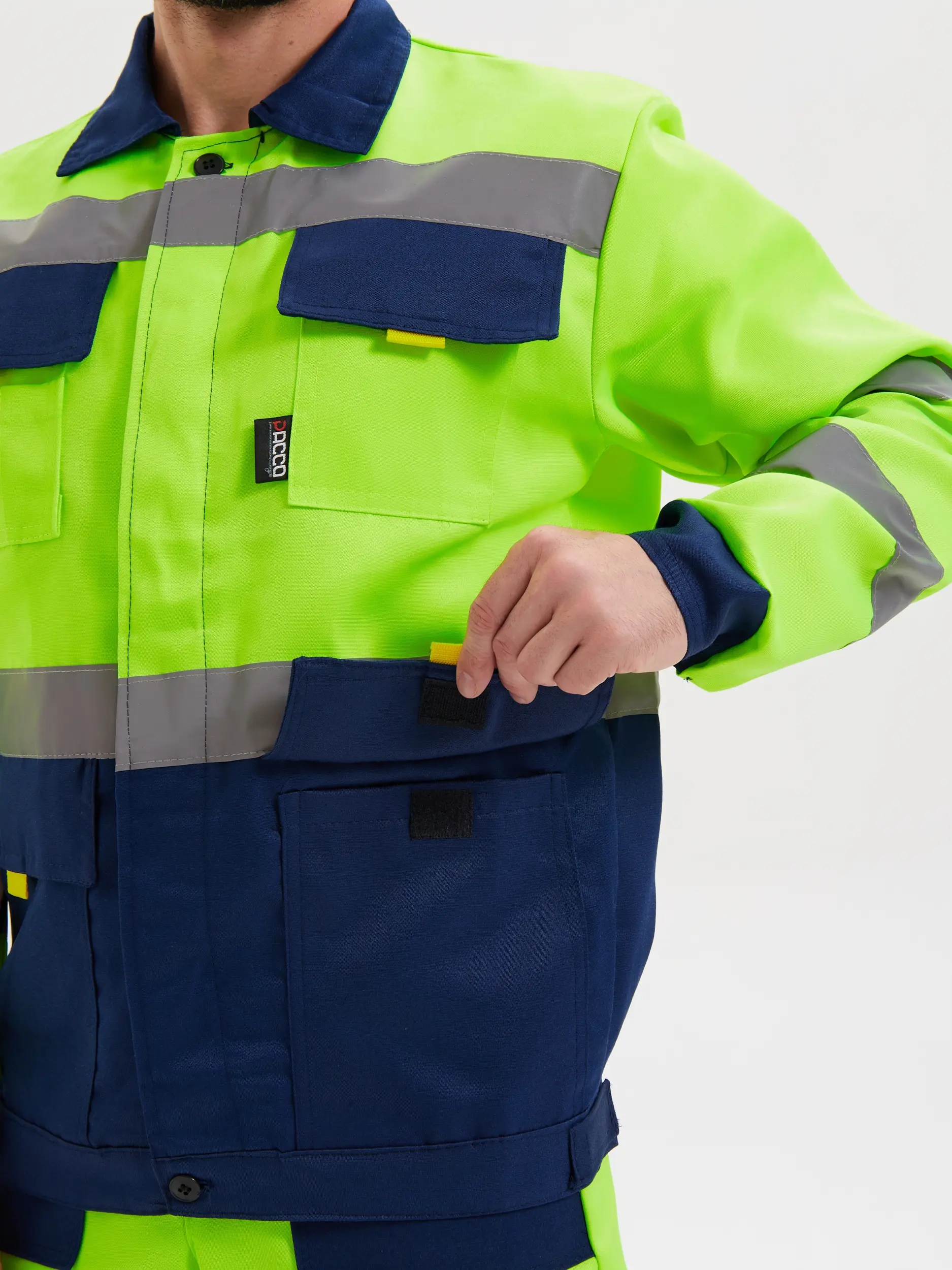 - Световозвращающая лента шириной 50 мм проходит по линии кокетки на полочках и спинке, низу куртки, средней части рукавов, и двойные в нижней части полукомбинезона, что соответствует III классу защиты сигнальной одежды;