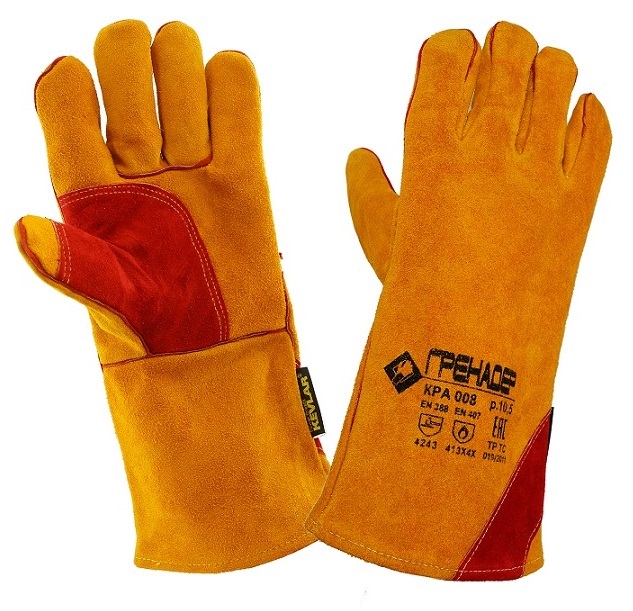 желтого (золотого) цвета. Швы двойные, усилены вставками из спилка. Прошиты нитью Кевлар. Подкладка из флиса в ладонной области и хлопковой ткани в области манжеты. Краги сварщика ГРЕНАДЕР обеспечивают высокую механическую защиту, защиту от повышенных температур - открытого пламени, искр и брызг расплавленного металла.
