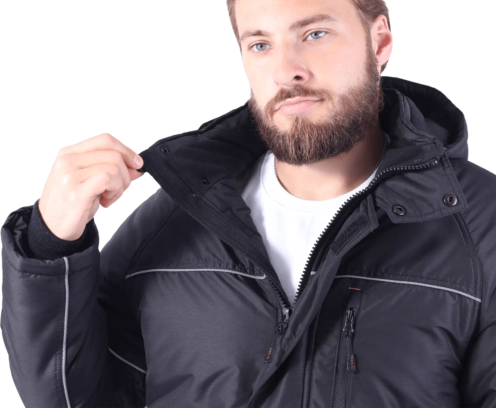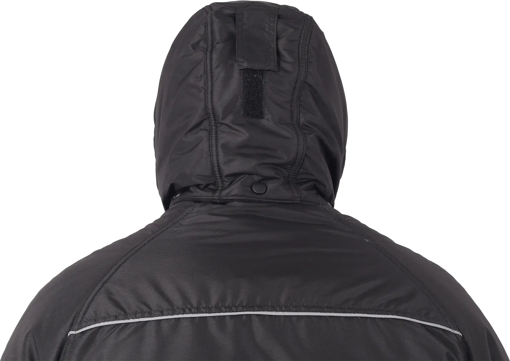 - Утепленный пристегивающийся капюшон на кнопках с регулировкой объёма