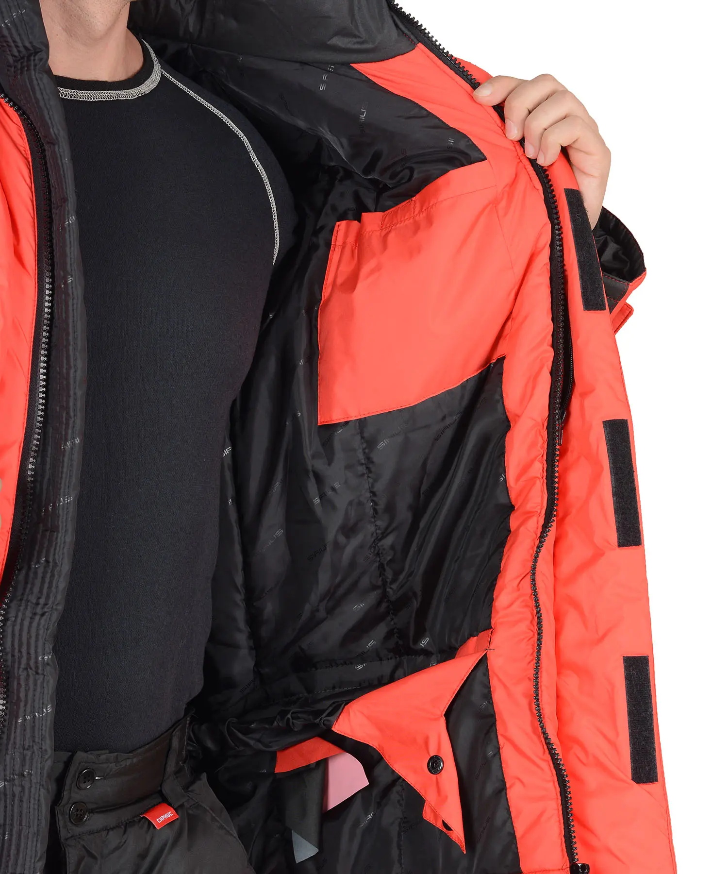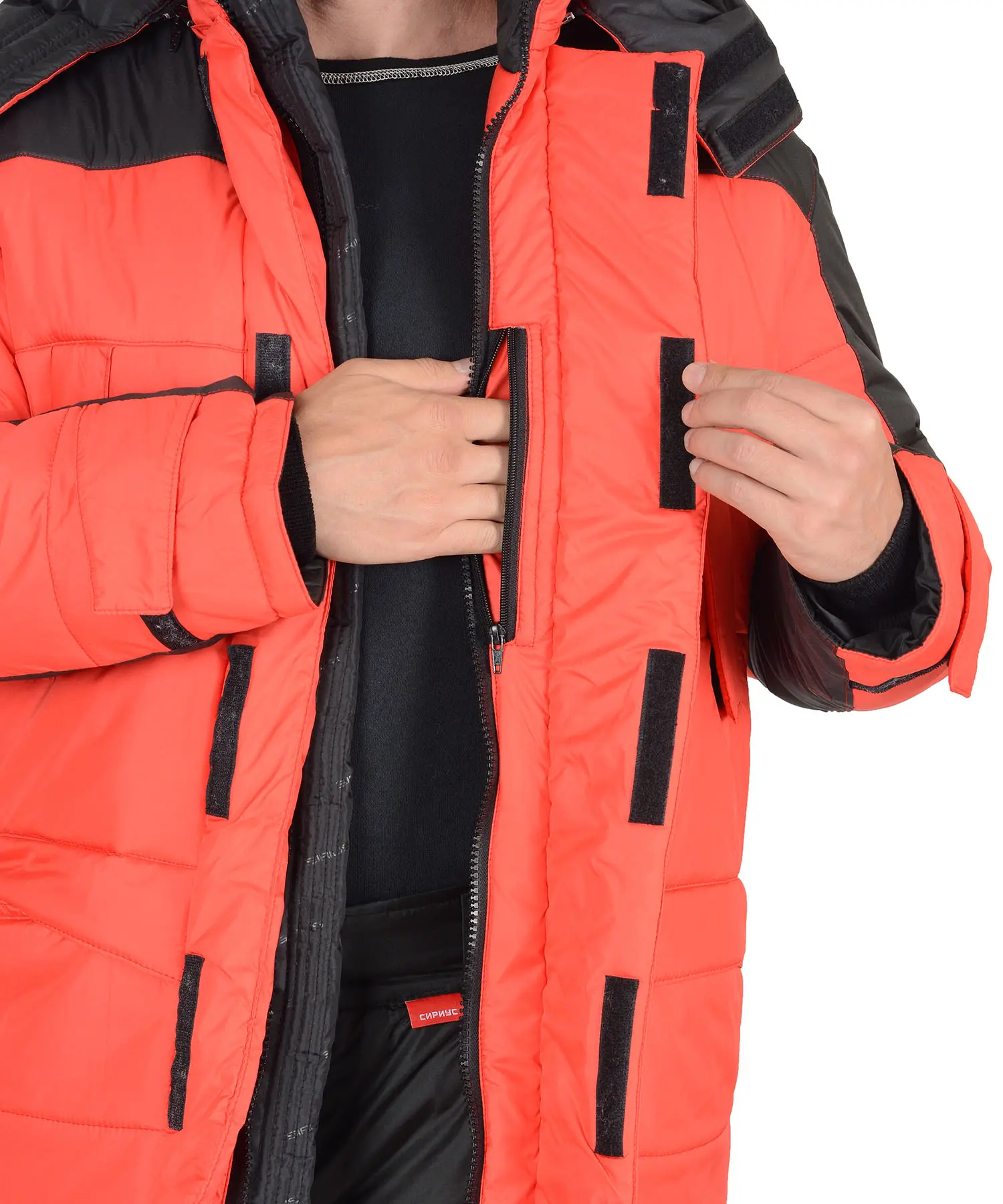 - с центральной бортовой застёжкой на двухзамковую тесьму «молния» и двумя внешними ветрозащитными клапанами, застёгивающимися на 4 текстильные застёжки «липучки» длиной 9,5см и одну кнопку, по низу планки;