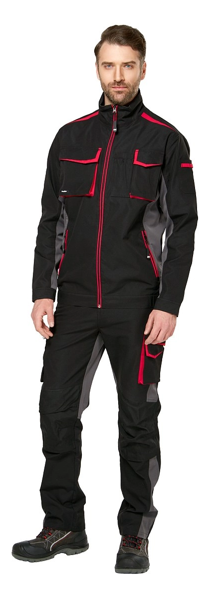 Куртка летняя и демисезонная мужская из плотной смесовой ткани черного цвета в сочетании с контрастными красными вставками и сегментами из ткани серого цвета, для защиты от общих производственных загрязнений и механических воздействий (истирания).