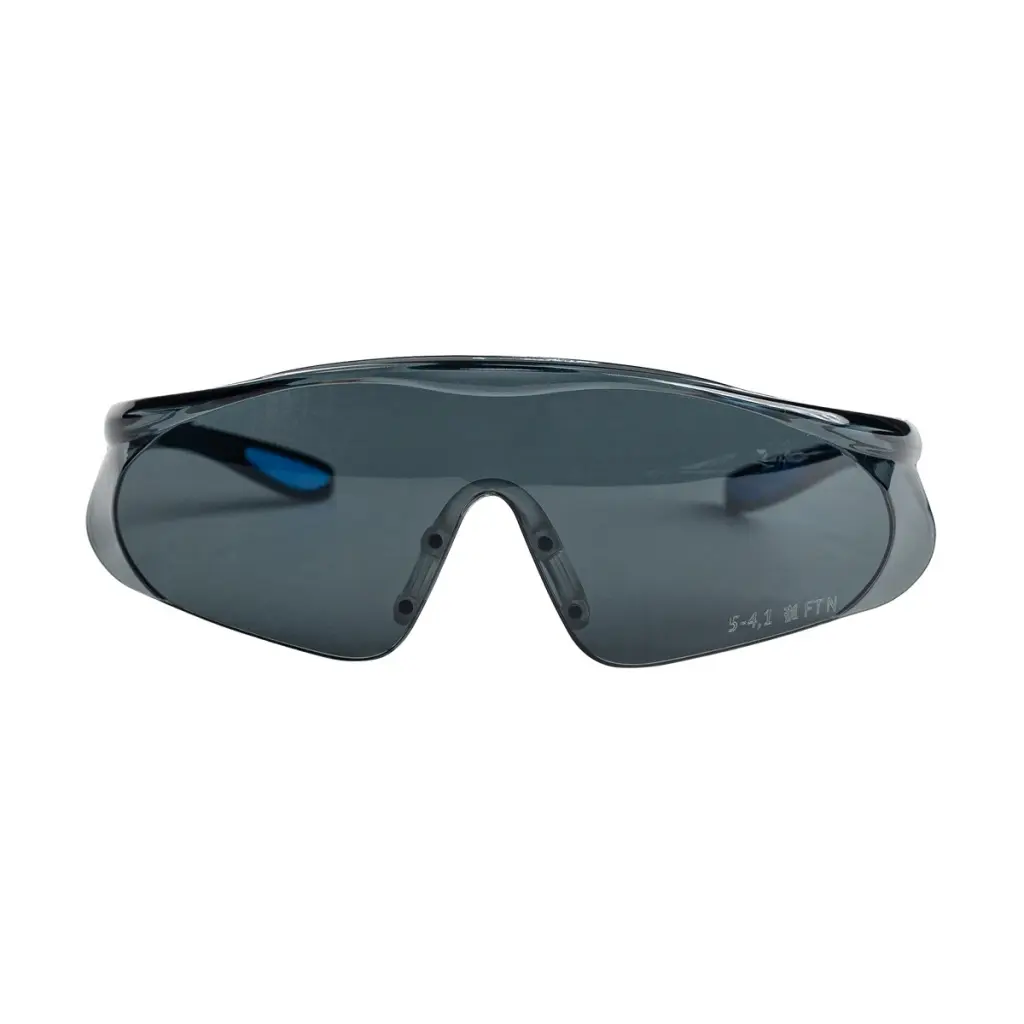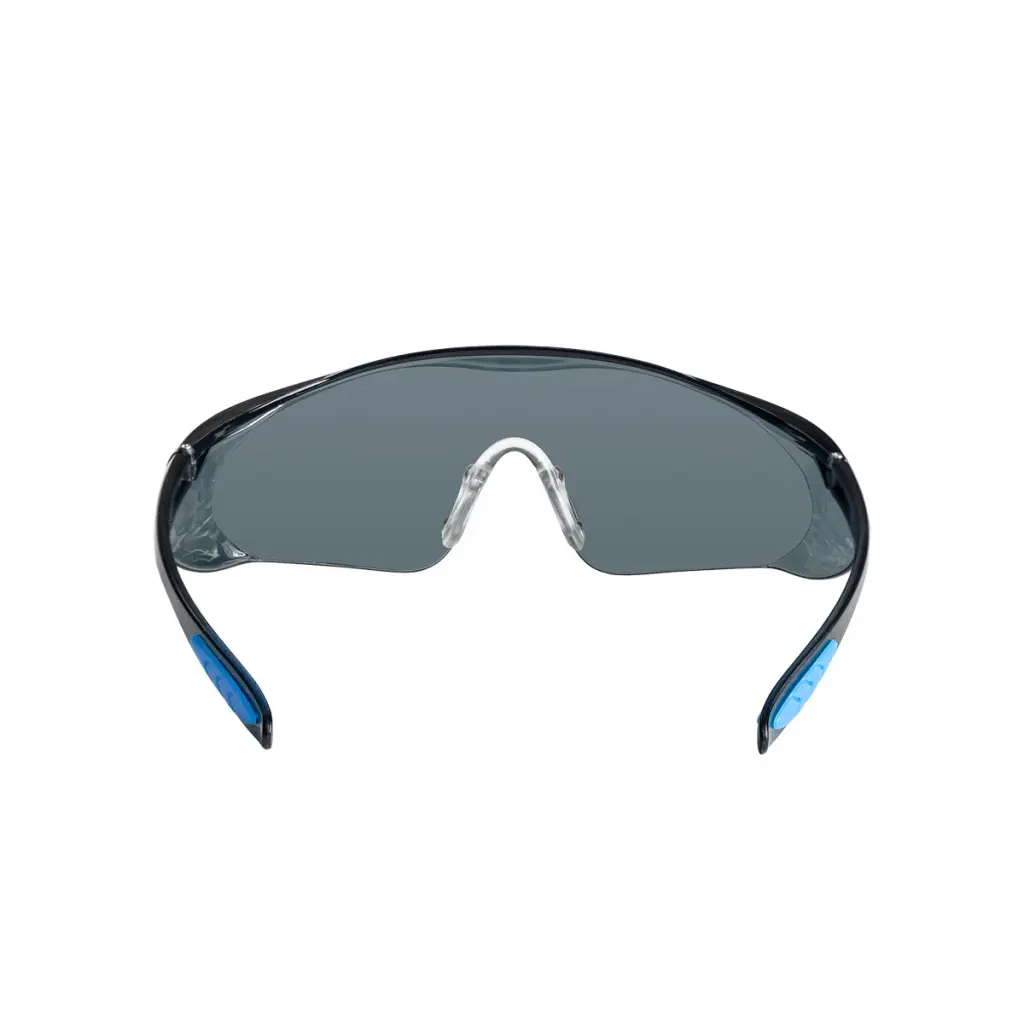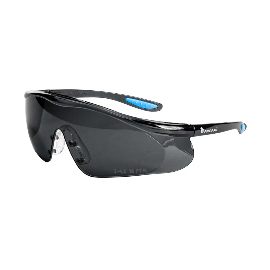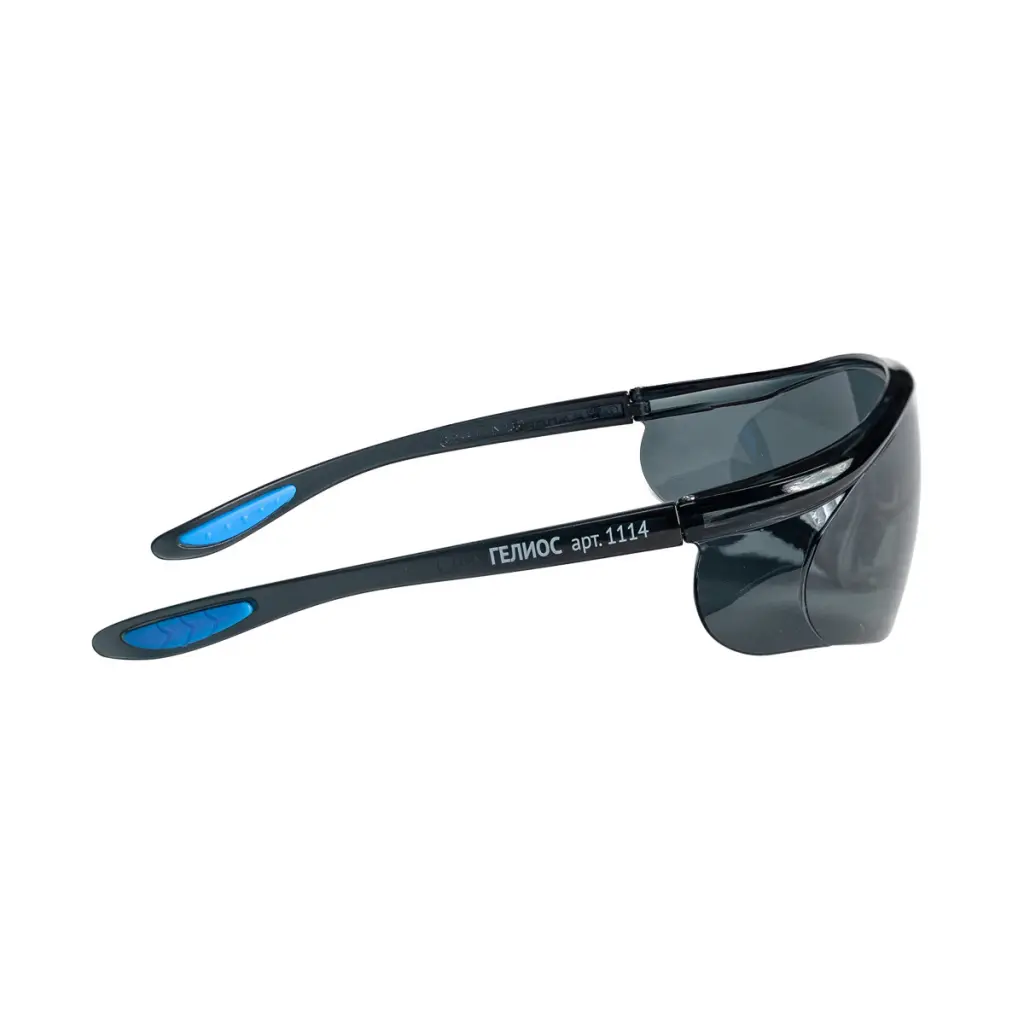 - Монолитная конструкция защитных очков из затемненного поликарбоната (PC) 1 – го оптического класса надежно защищает от летящих частиц со скоростью 45 м/с и УФ излучения.