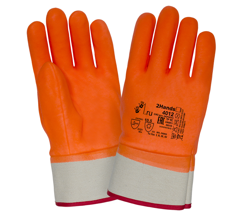Перчатки 2Hands (Ту Хэндс) арт. 4012 с полным покрытием ПВХ для защиты от механических воздействий и пониженных температур. Являются экономичным аналогом перчаток Alaska + арт. 3012. Обладают схожими (но меньшими и ограниченными во времени, в сравнении с перчатками 2Hands Alaska) свойствами по защите от пониженных температур и механических воздействий. Хлопковая основа с покрытием из эластичного морозостойкого ПВХ - двойное погружение, манжет -защитная крага, шероховатая поверхность ладони. Защита от разрыва, истирания, ограниченная защита от проколов и порезов, защита от пониженных температур, герметичные. Хлопковая ворсовая подкладка сохраняет руки в тепле до -25С(t).