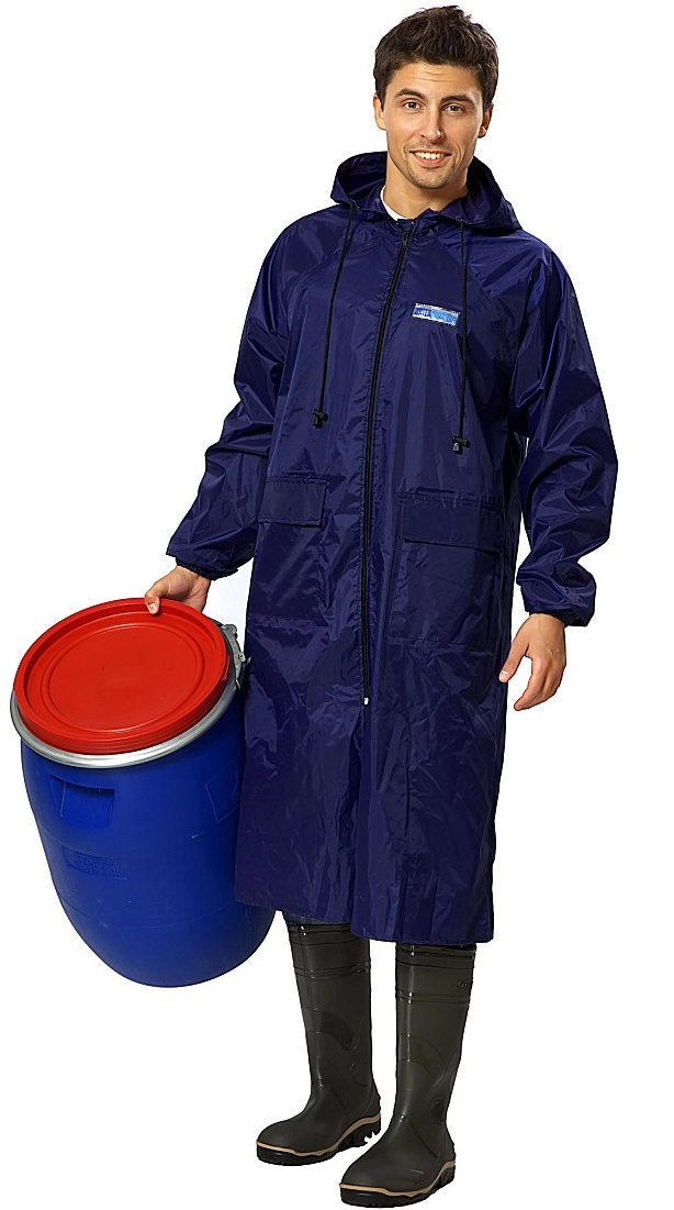 Плащ с центральной застежкой на молнию и ветрозащитной планкой, с капюшоном, с двумя накладными карманами с клапанами. В рукав плаща вшит внутренний ветрозащитный манжет с плотной эластичной тесьмой. Для дополнительного комфорта в работе, в плаще имеются вентиляционные пространства на спине и отверстия на уровне подмышечных впадин, что обеспечивает равномерный воздухообмен. Объем капюшона регулируется при помощи шнура. Изделие выполнено из 100% синтетического прочного влагозащитного материала: плащевая ткань с внутренним ПВХ покрытием. Все швы изделия проклеены изнутри и герметичны. Ткань экологична и соответствует требованиям санитарно-химической безопасности СИЗ. Каждое изделие упаковано в прочный комбинированный пакет из полиэстера. Рекомендуется для применения в рыболовецких хозяйствах, лесных угодиях, муниципальных службах.