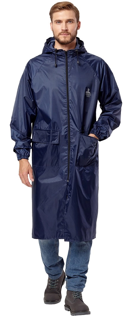 Плащ выполнен из влагостойкого синтетического материала плотностью 200 г/м² с ПВХ покрытием.