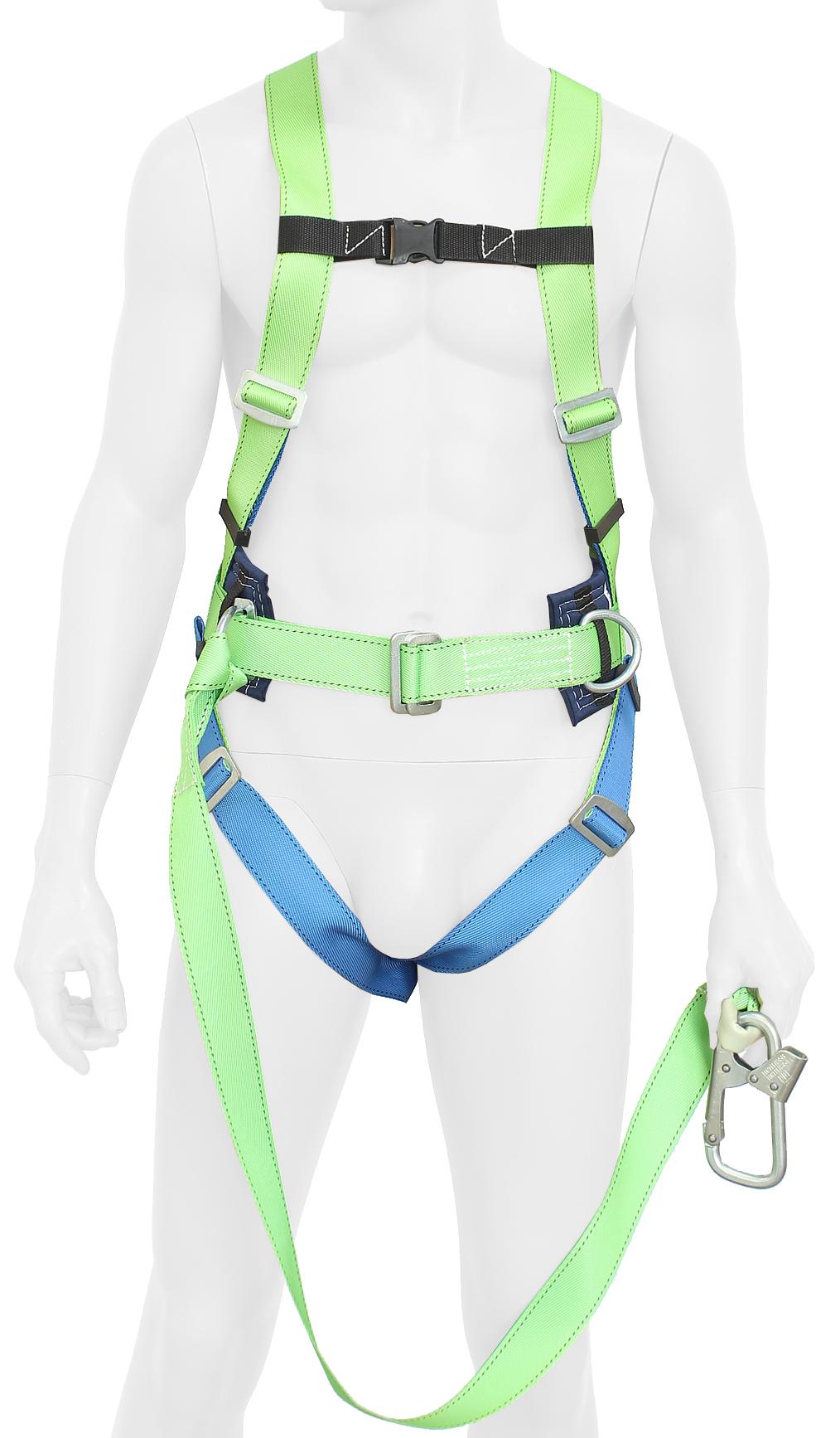 - Система состоит из привязи с наплечными и набедренными лямками (ремня с пряжкой, кушака, двух D-колец на поясе и одного на спине) и стропа (полиэфирная лента, монтажный карабин и крепежная петля).