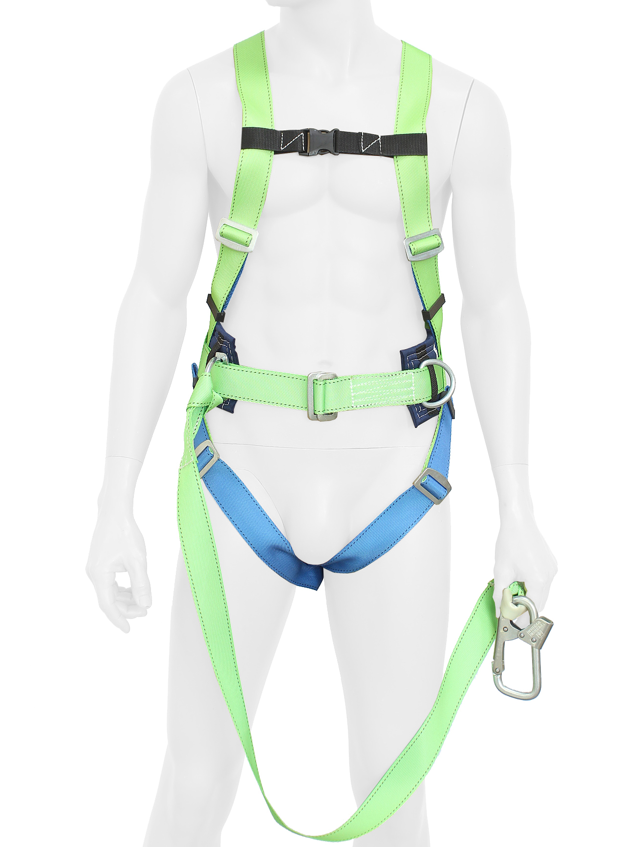- Предохранительный пояс с наплечными лямками со стропом из полиамидной ленты с монтажным карабином.