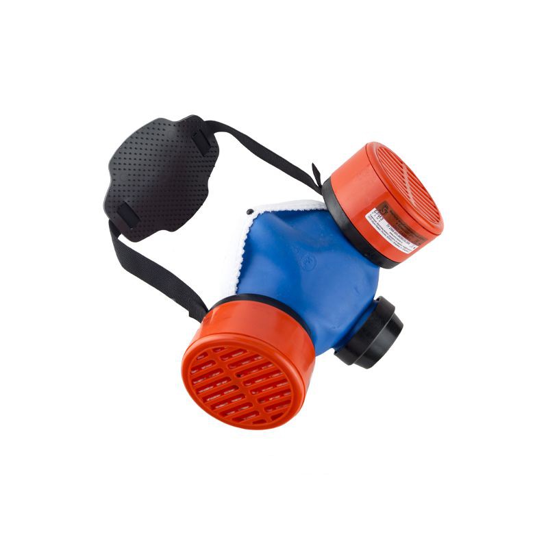 - В боковых отверстиях полумаски закреплены манжеты из полиэтилена с клапанами вдоха, в которые вставляются сменные противогазовые фильтры различных марок, а в нижнем отверстии полумаски закреплён клапан выдоха, закрытый предохранительным экраном.