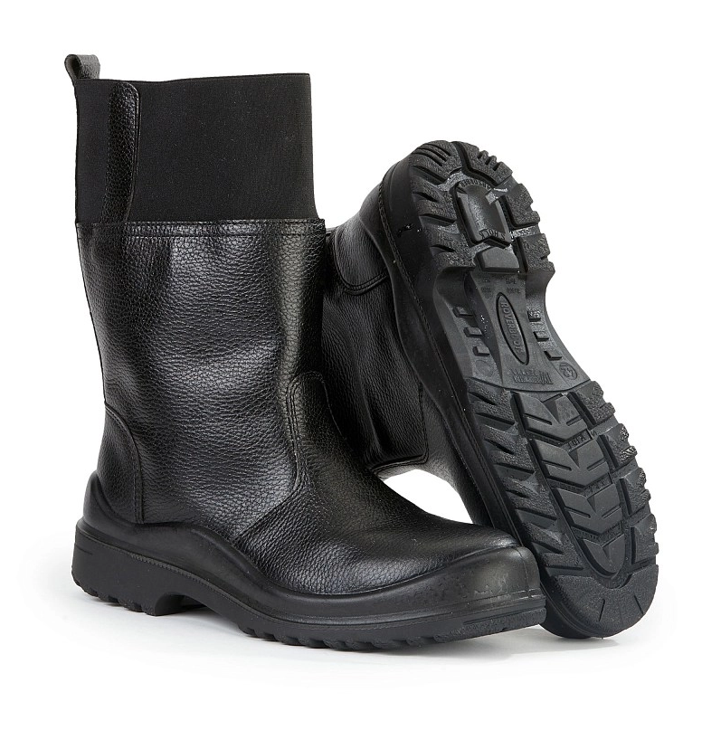 - Верх обуви: полностью выполнен из натуральной кожи (юфть яловая толщиной 2,0 мм). Кожаное голенище по верху стянуто широкой эластичной лентой для предотвращения попадания искр и брызг расплавленного металла, окалины во внутрь обуви. Для удобства надевания манжета снабжена кожаными накладками.