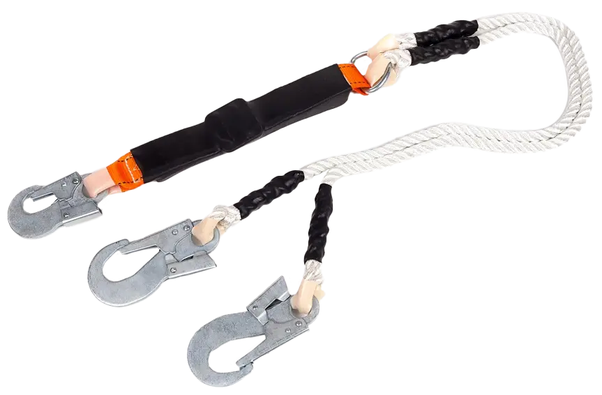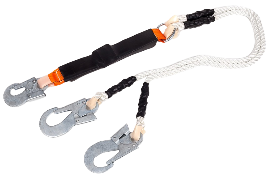 Строп из полиамидного каната ф13 мм с амортизатором и двумя карабинами используется как средство индивидуальной защиты от падения с высоты, может применяться как отдельная соединительная деталь, узел или компонент в системе с привязями и с анкерной точкой.