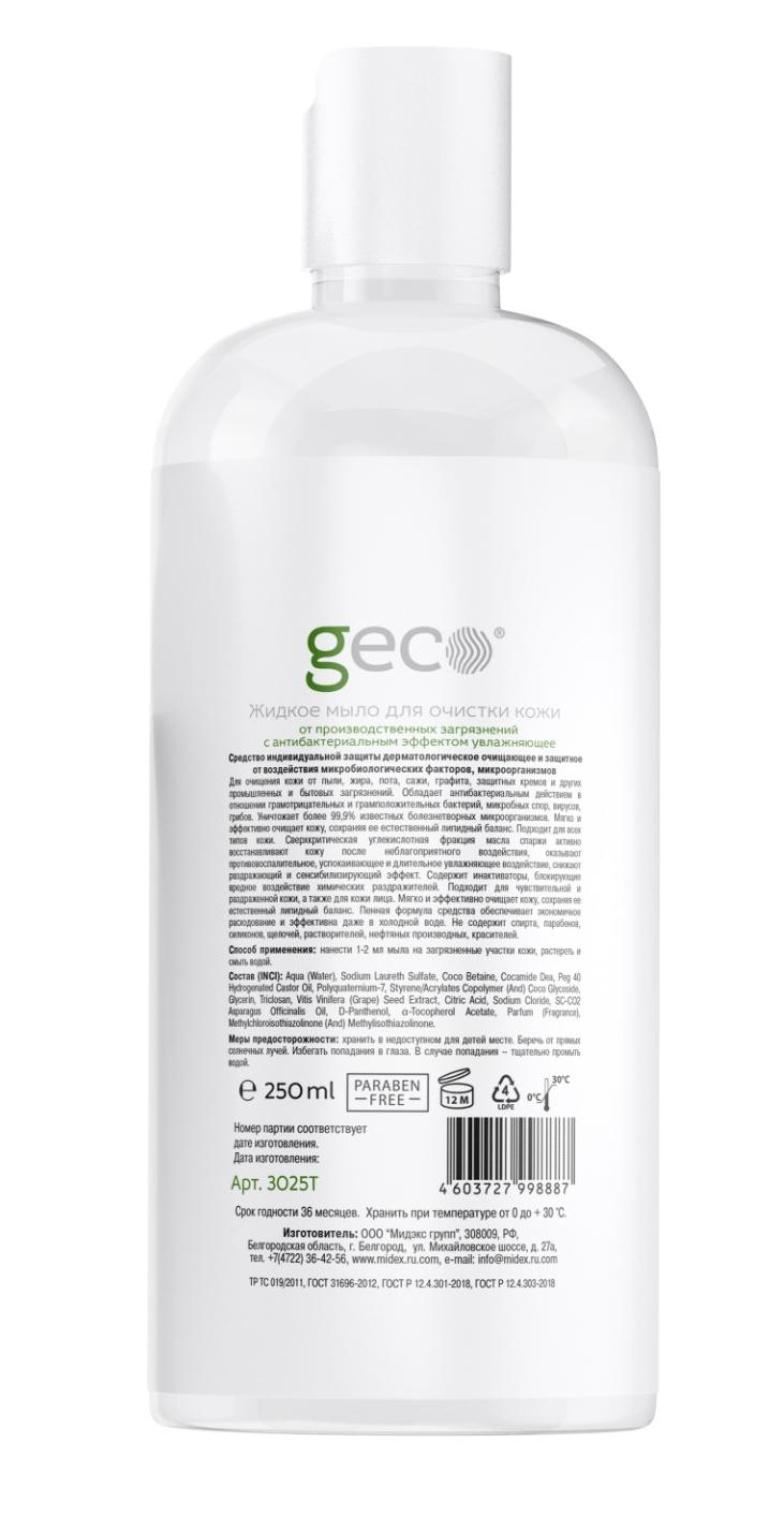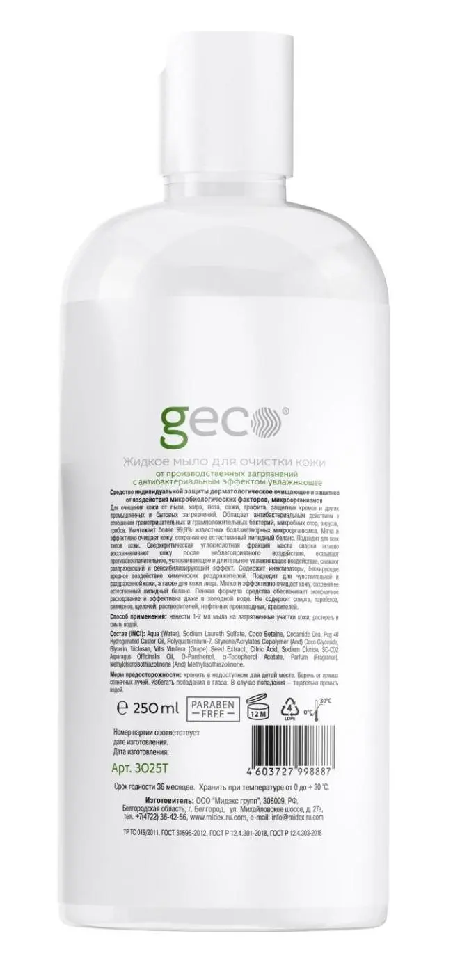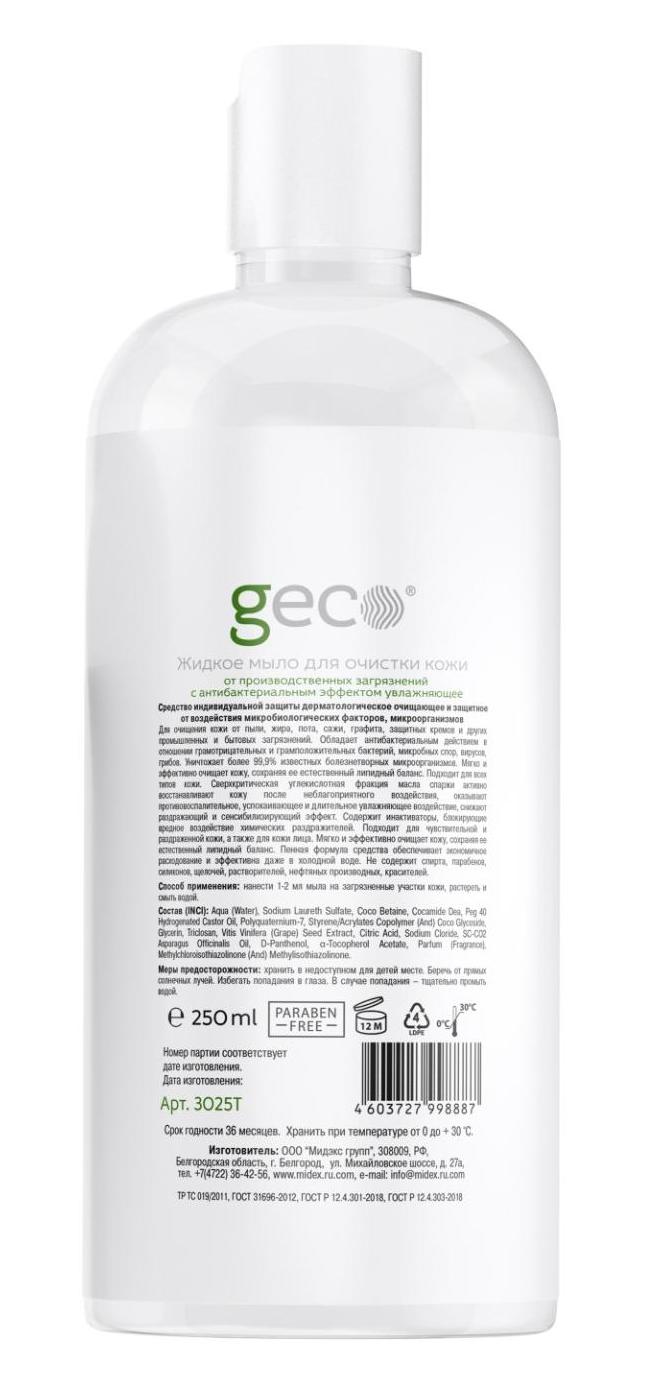 Жидкое мыло для очистки кожи от производственных загрязнений с антибактериал. эффектом увлажняющее GECO 250мл. (флакон с крышкой диск-топ)