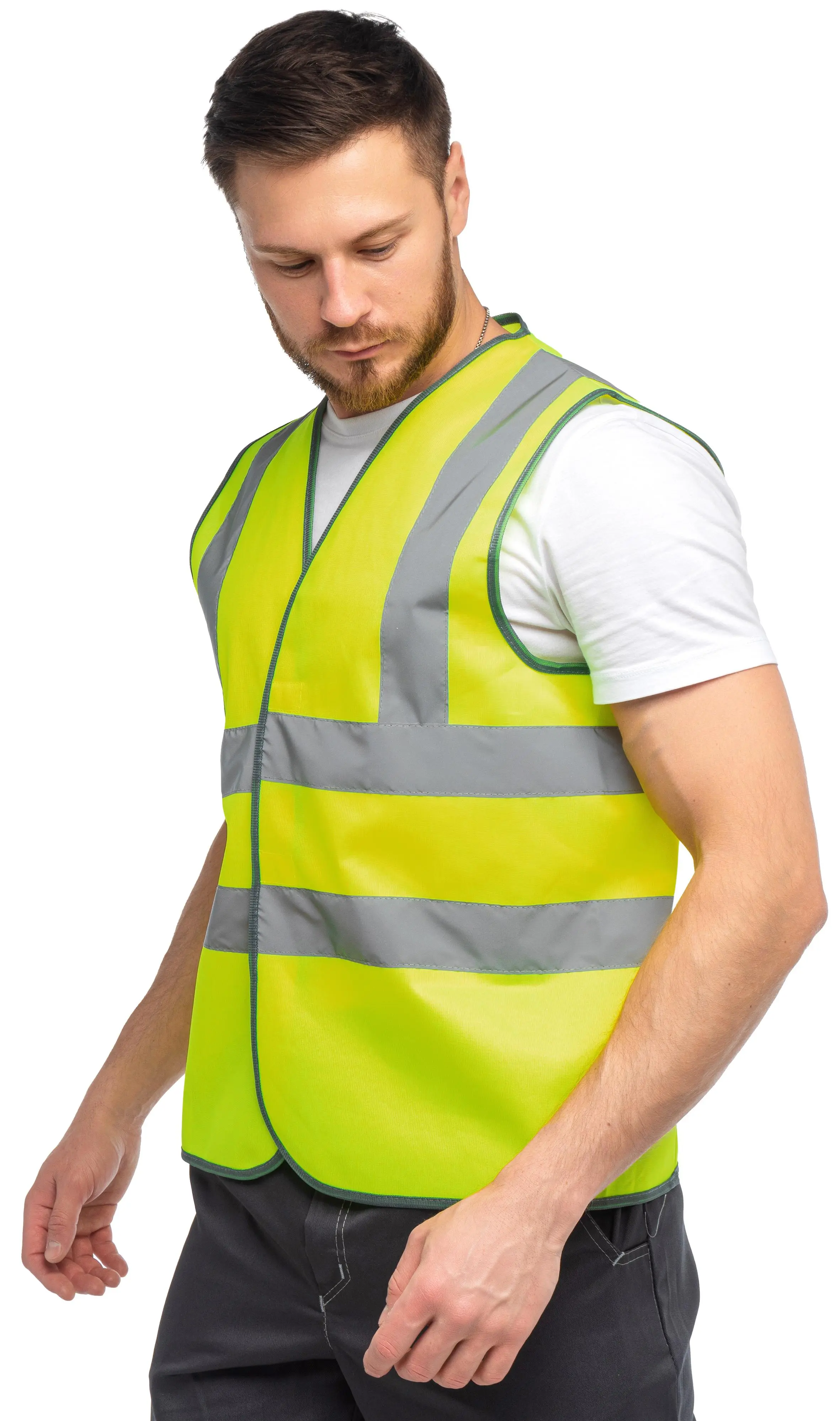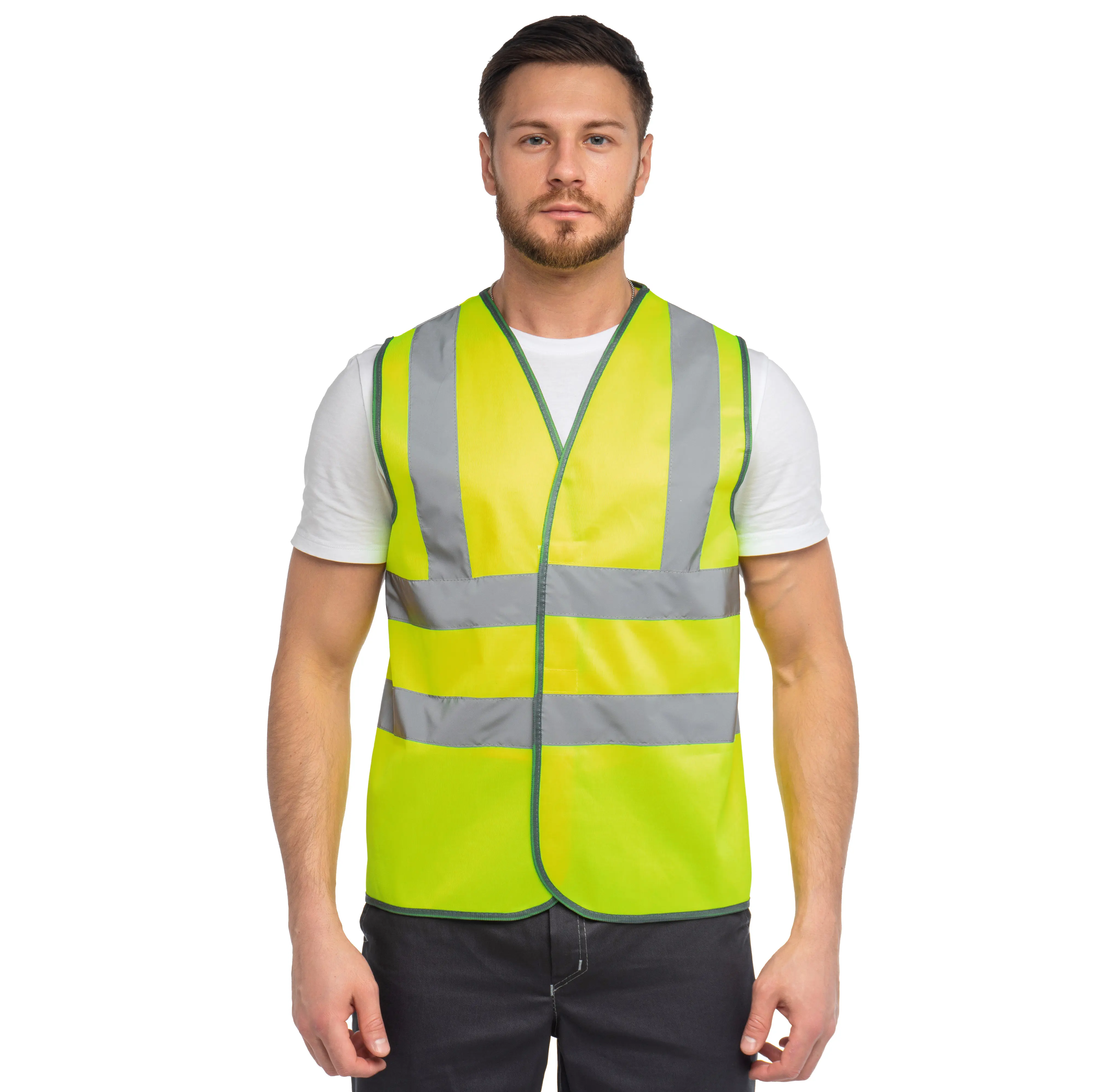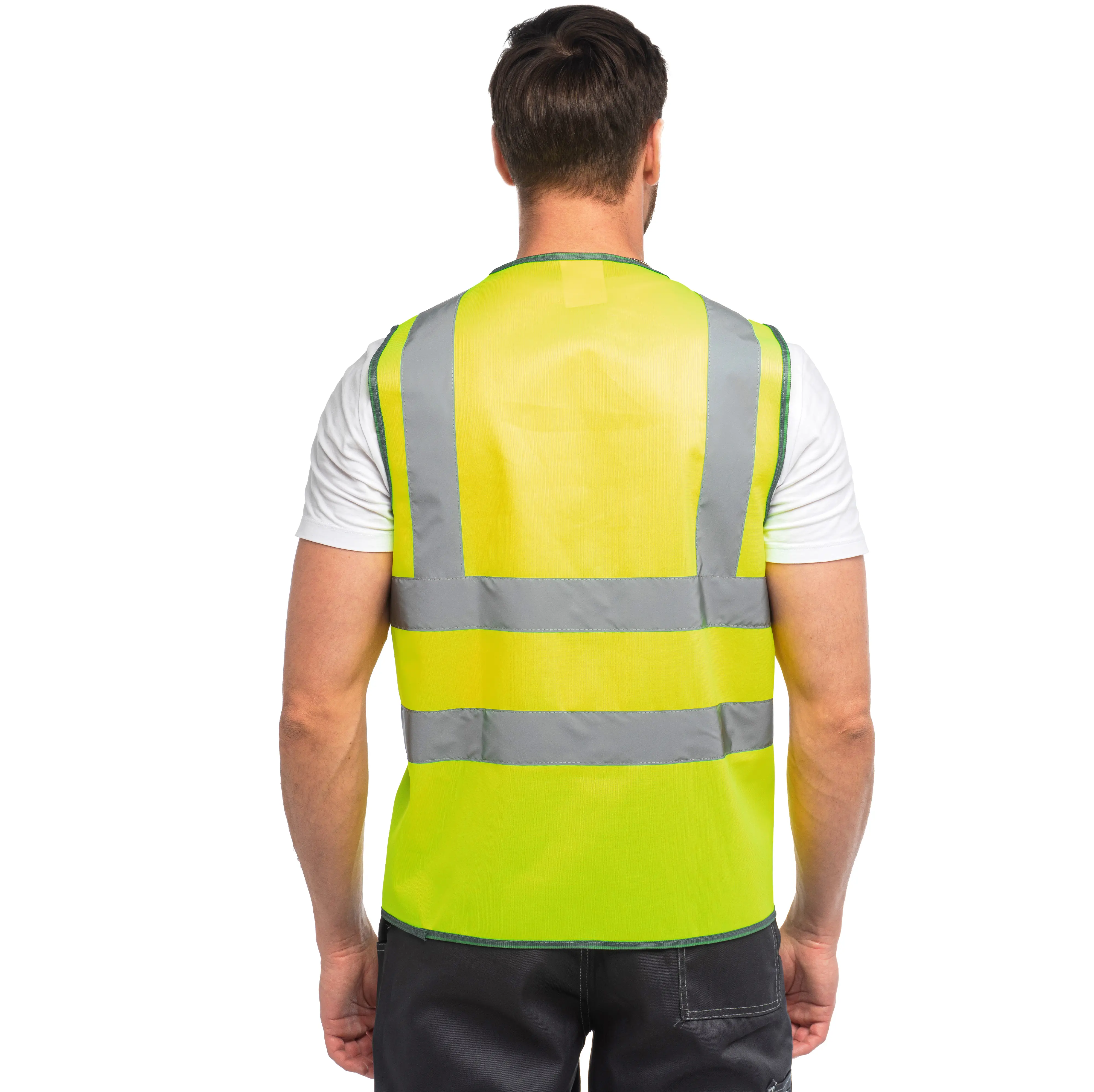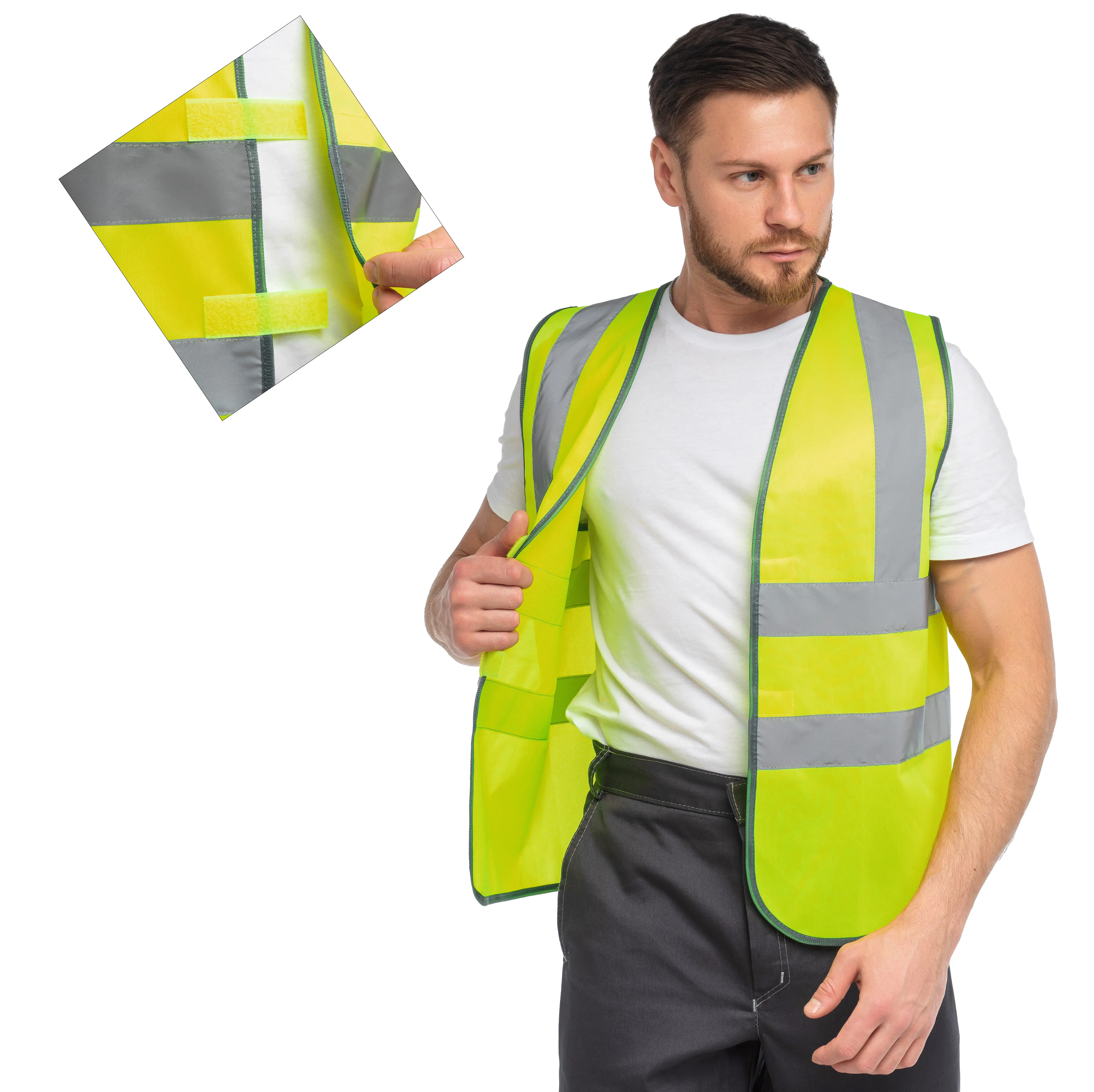 - Для безопасной работы сотрудника в местах с плохим освещением на сигнальном жилете предусмотрено 4 светоотражающих полосы 50 мм.