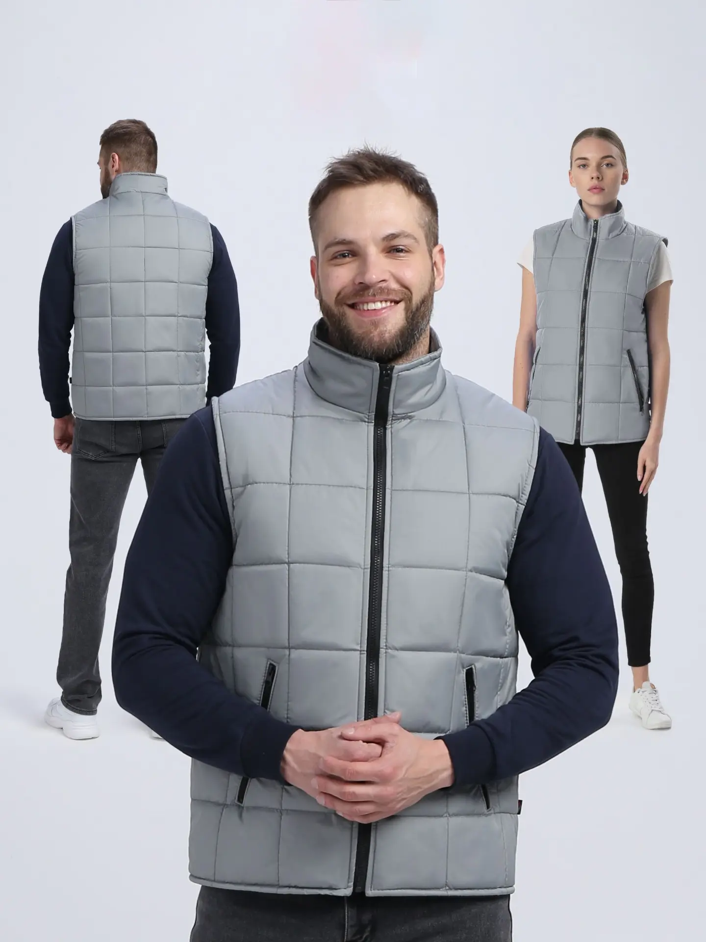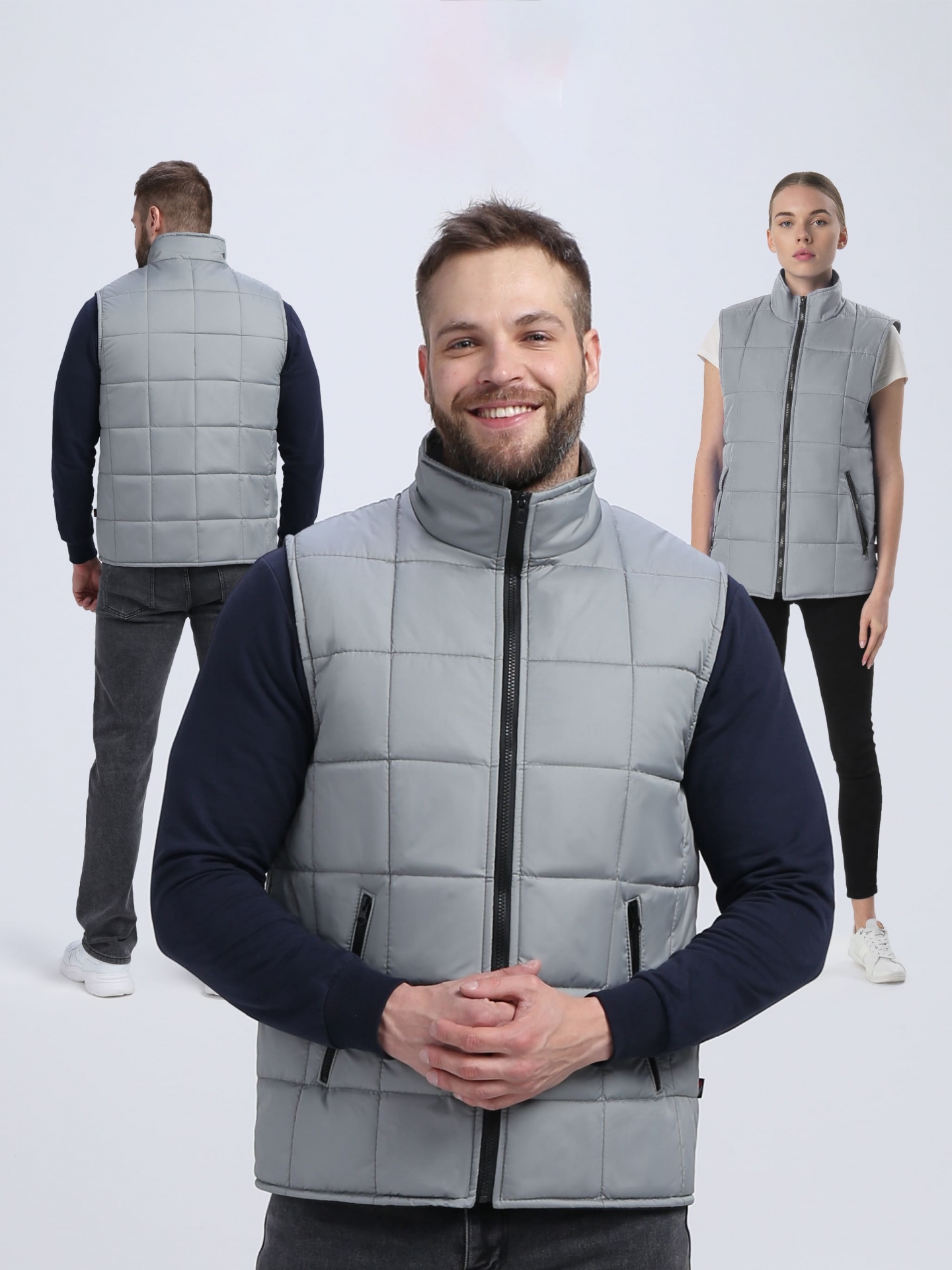 - Стеганый жилет прямого кроя подходит как мужчинам, так и женщинам, прекрасно садится по фигуре, выступая отличным дополнением повседневных и рабочих образов.